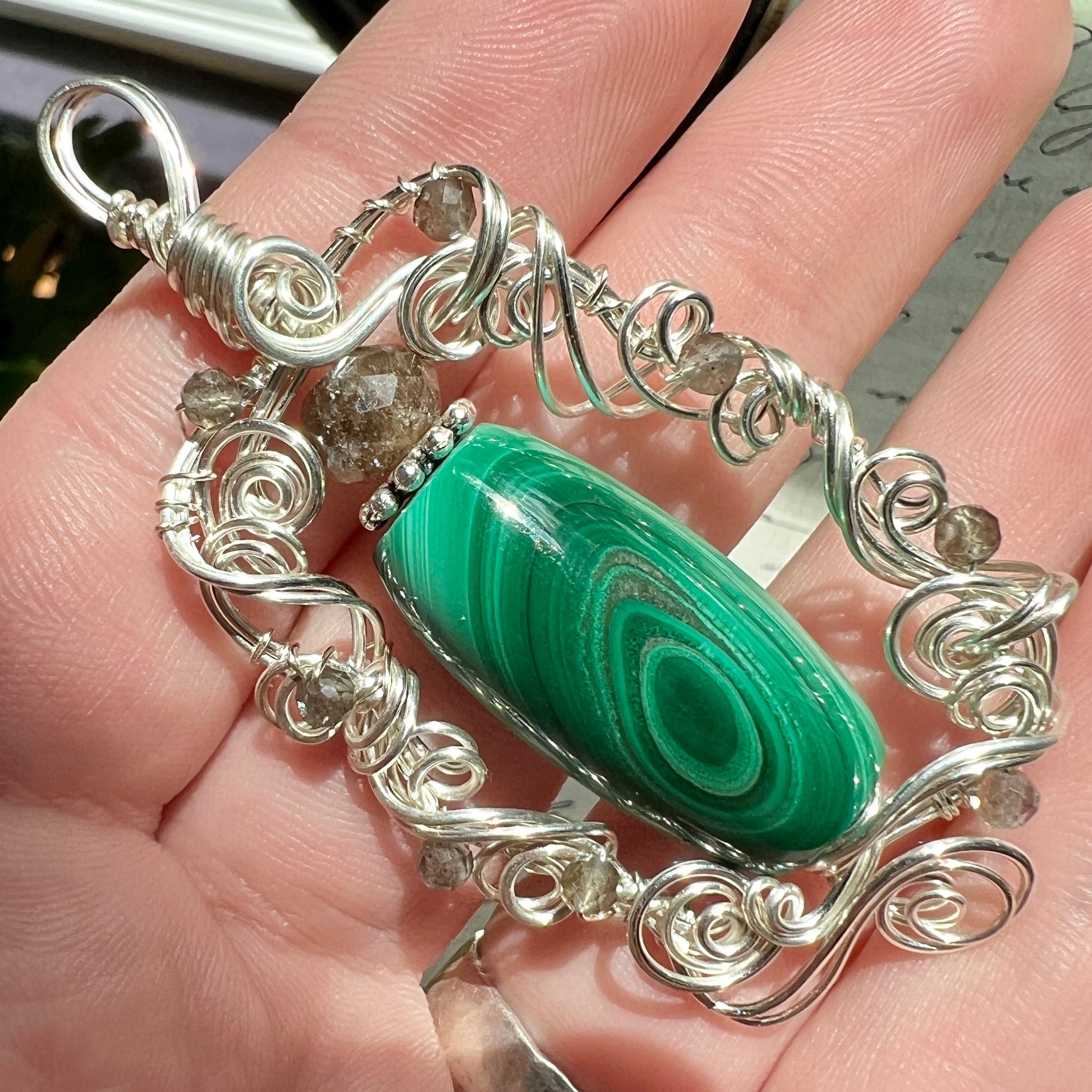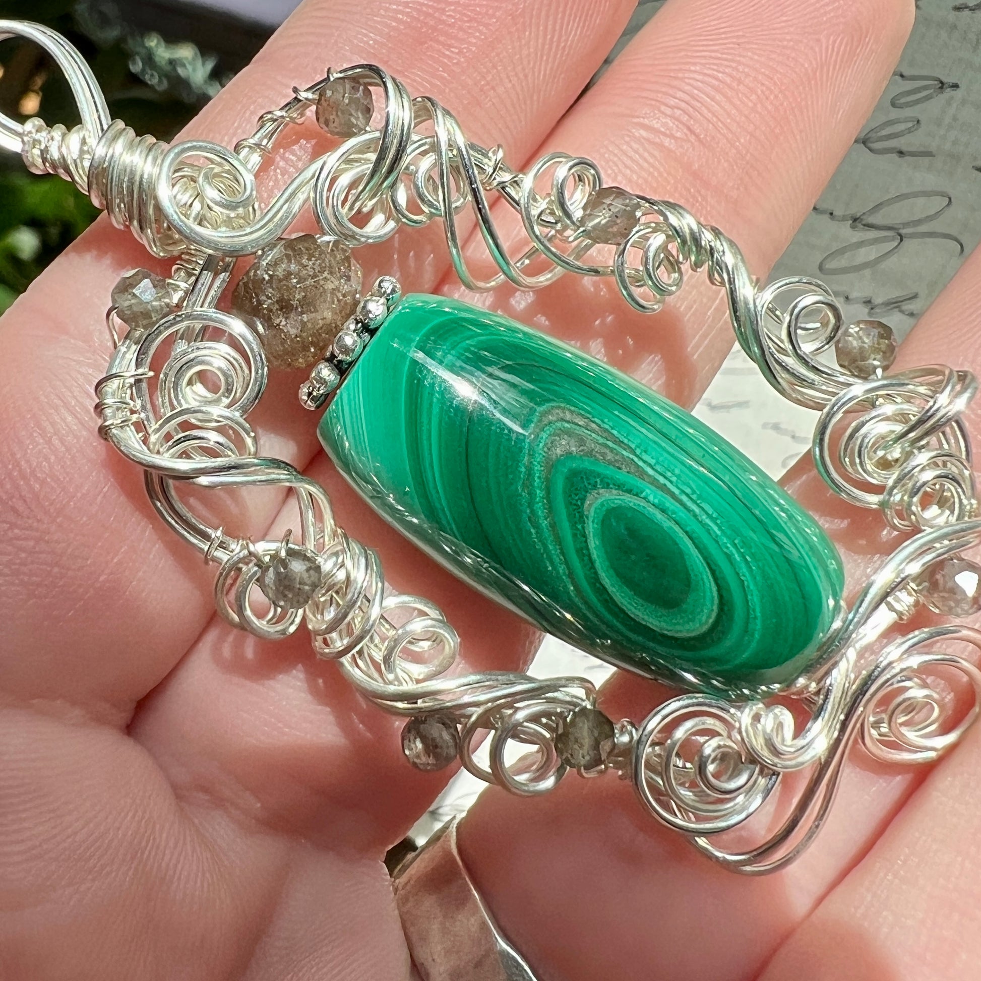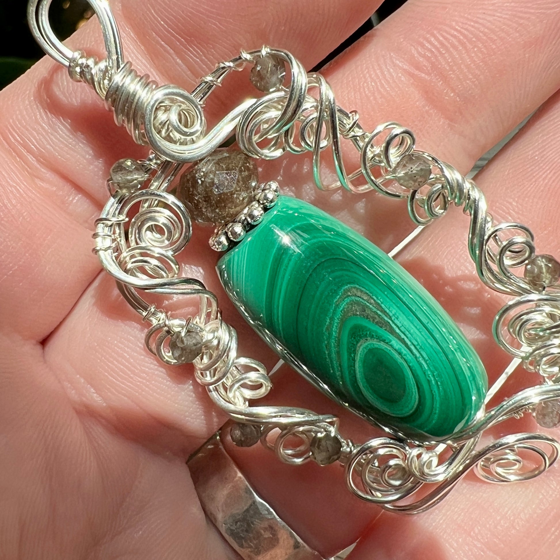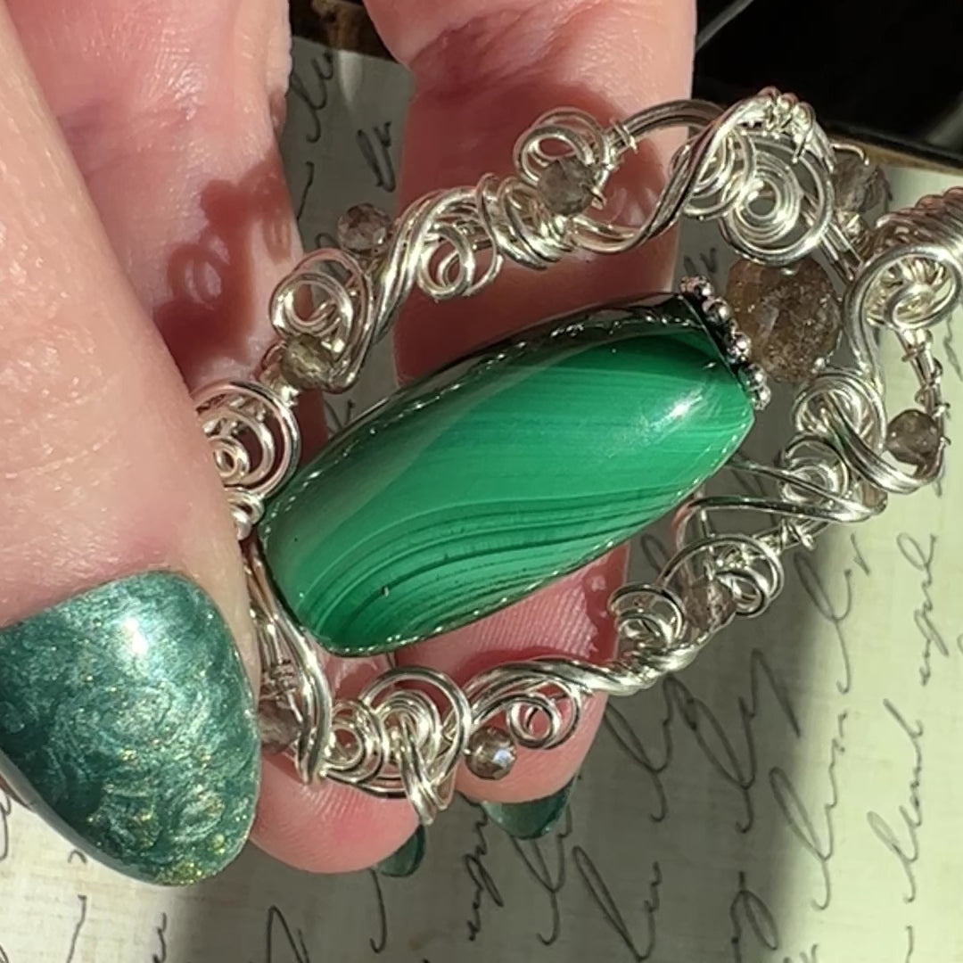 Malachite with wonderful banding that almost looks chatoyant in spots when moved in the light, with an unusual metallic inclusion between a couple of the bands - accented with sparkling grey sillimantite in sculpted silver wire. A very striking and unique piece!
