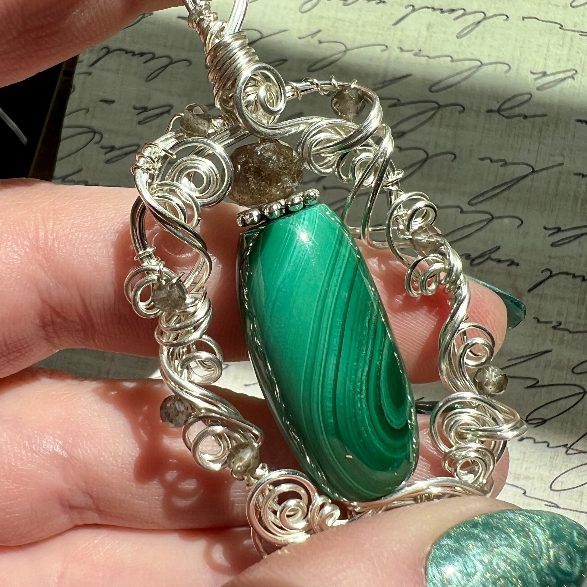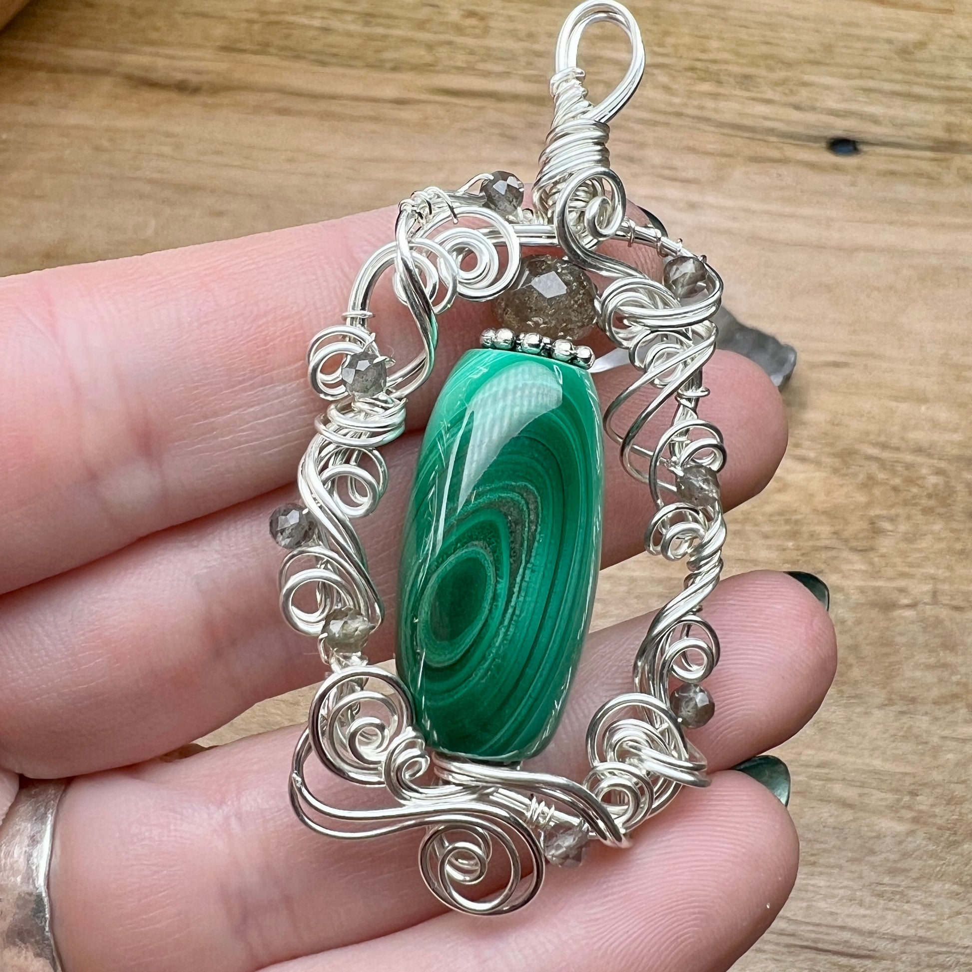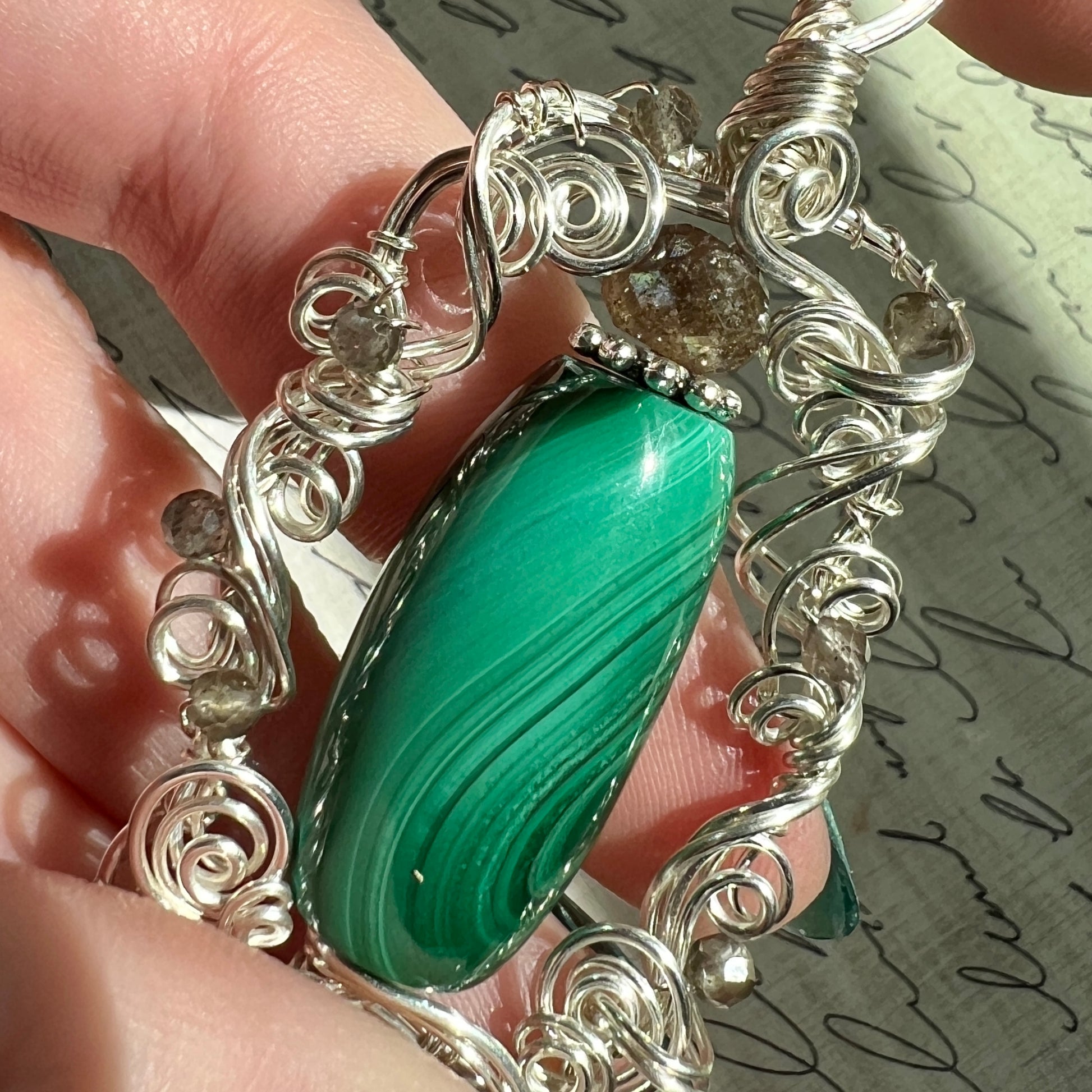 Malachite with wonderful banding that almost looks chatoyant in spots when moved in the light, with an unusual metallic inclusion between a couple of the bands - accented with sparkling grey sillimantite in sculpted silver wire. A very striking and unique piece!