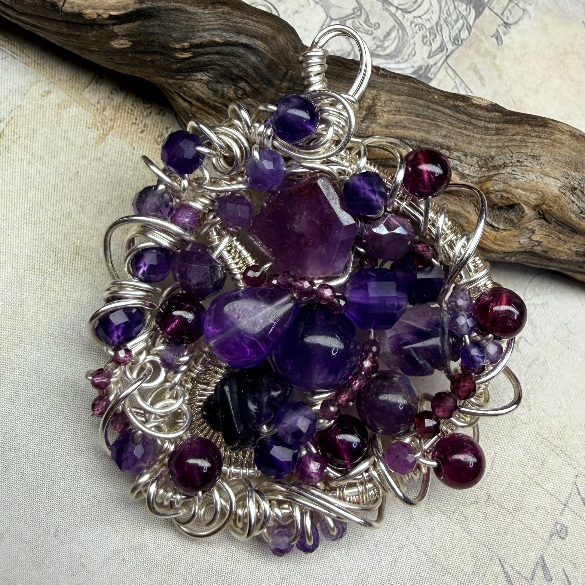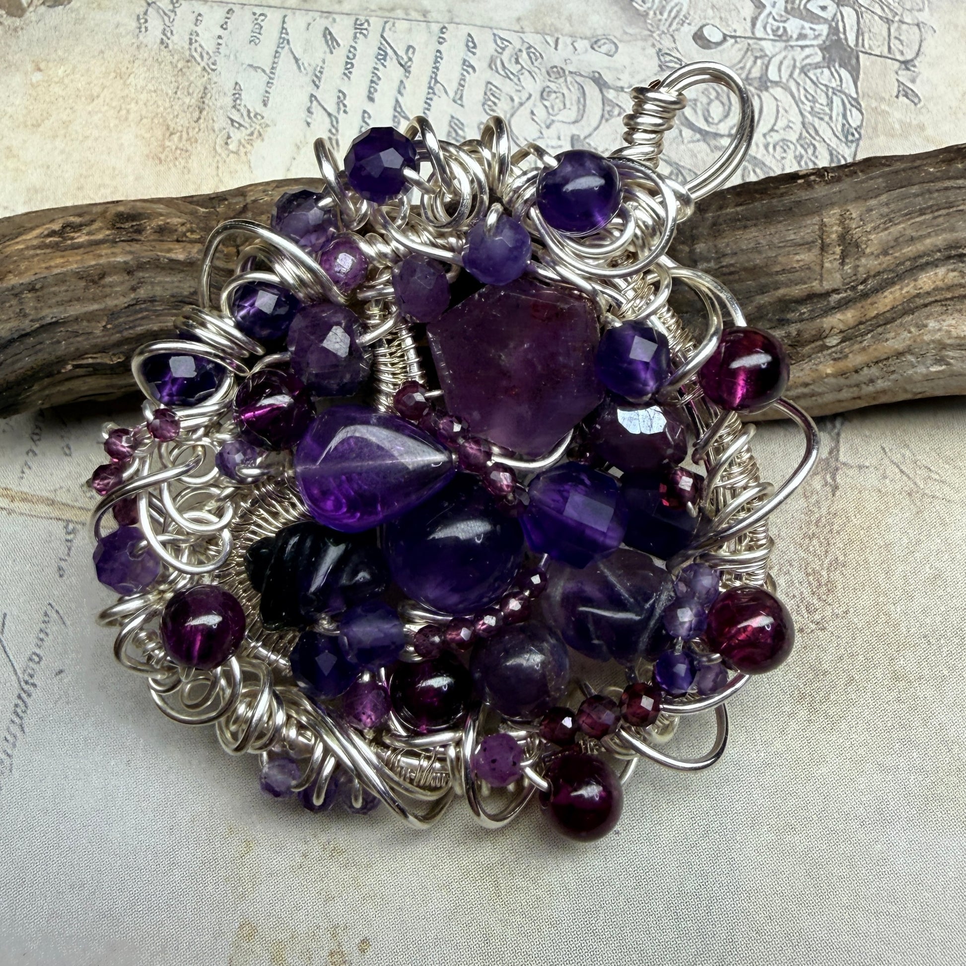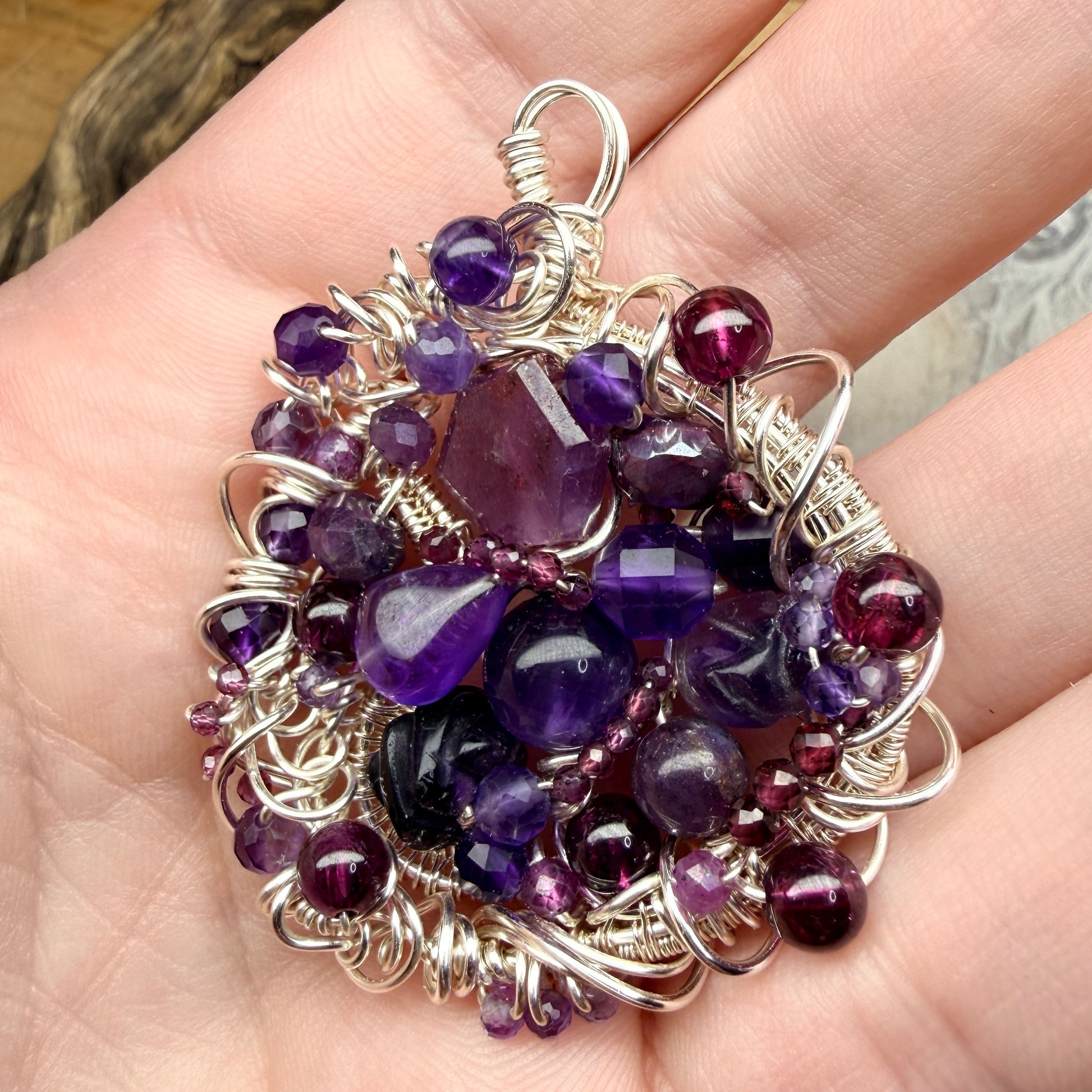 These are large pendants densely packed with stones and wirework, and there’s a lot to discover in them. This one is ruby, purple and red garnets, pink sapphire, amethyst, fluorite, and dyed moonstone.