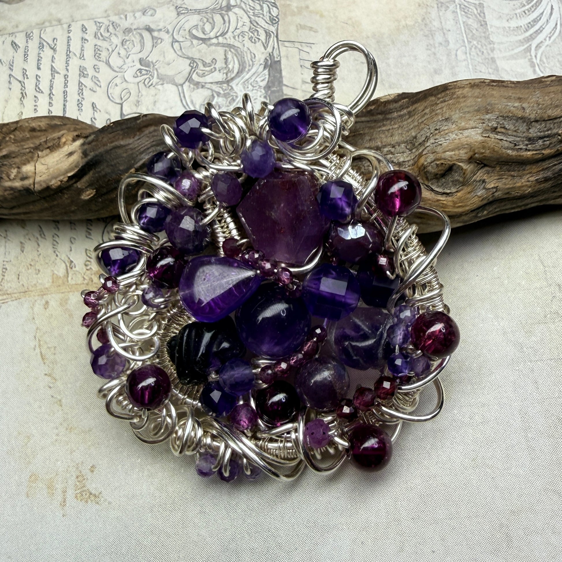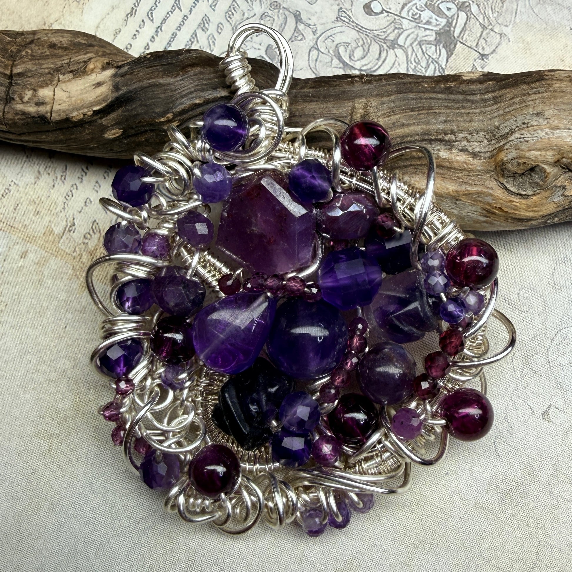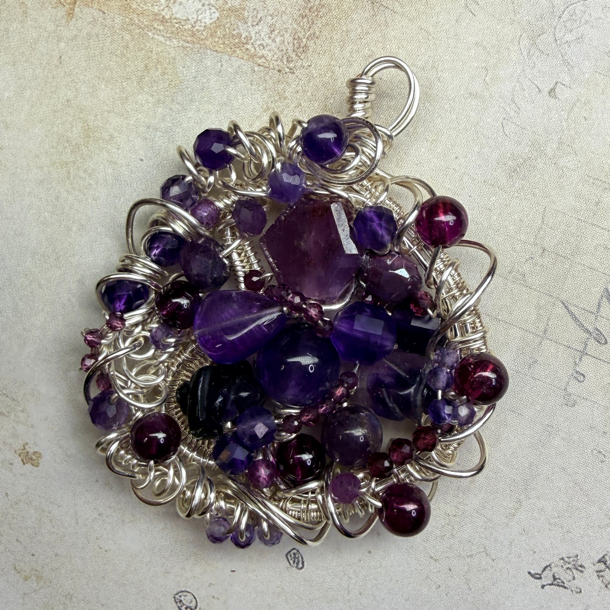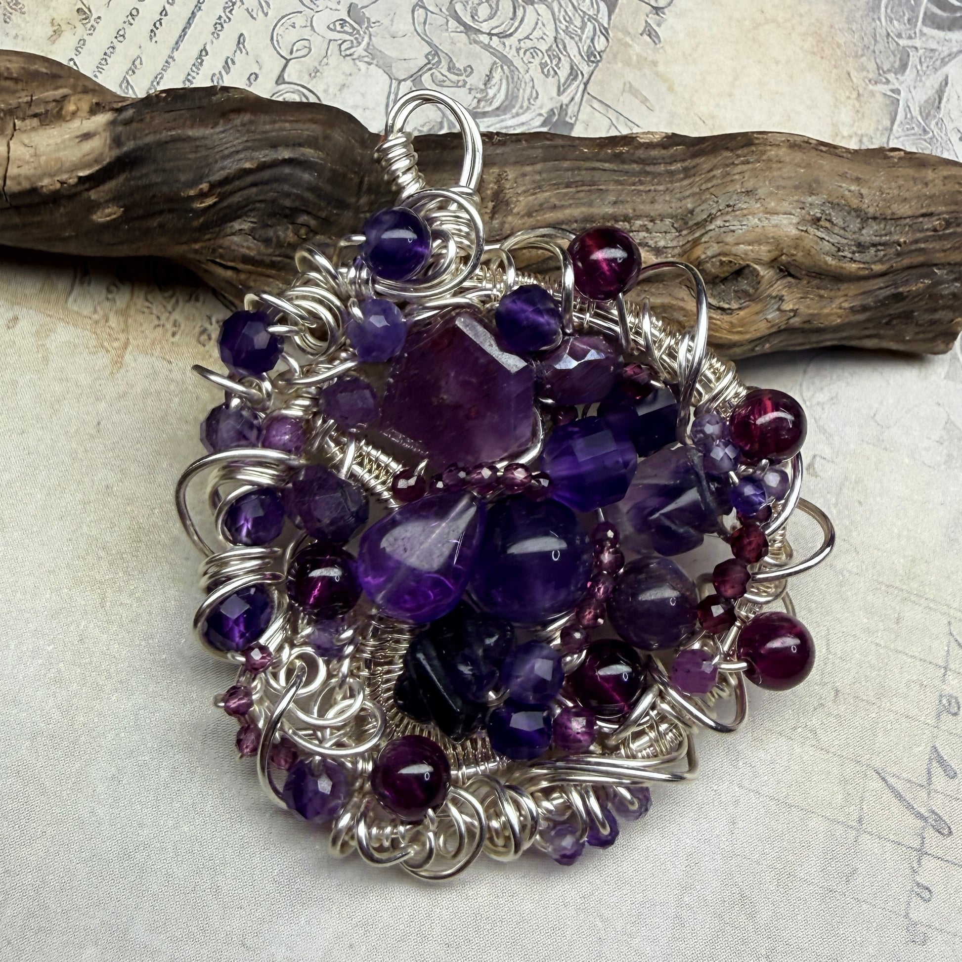 These are large pendants densely packed with stones and wirework, and there’s a lot to discover in them. This one is ruby, purple and red garnets, pink sapphire, amethyst, fluorite, and dyed moonstone.