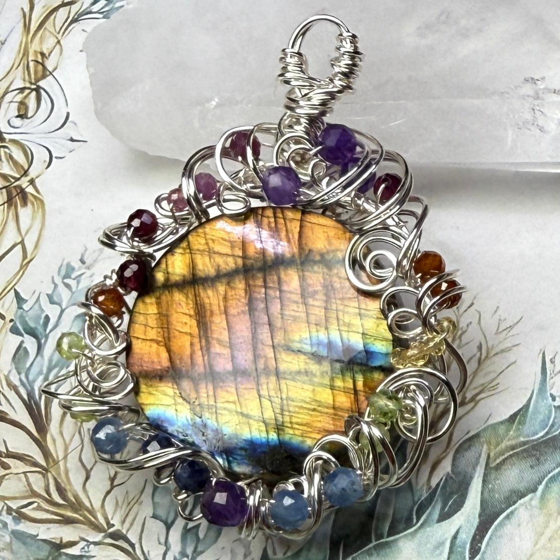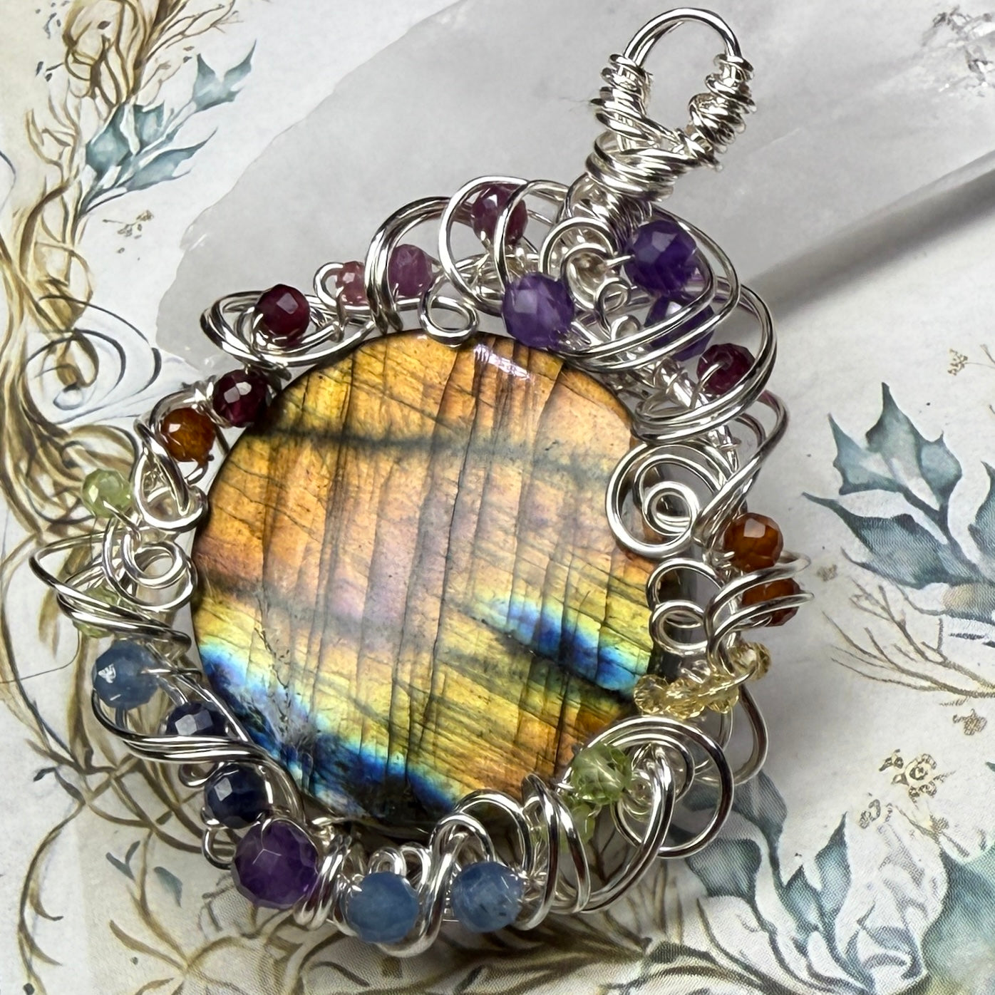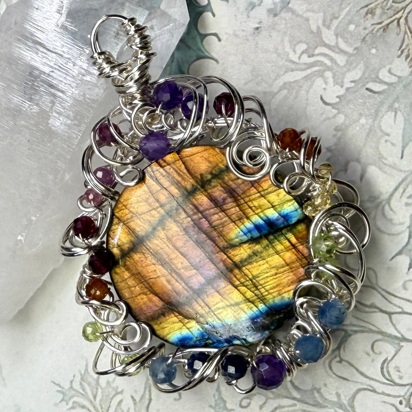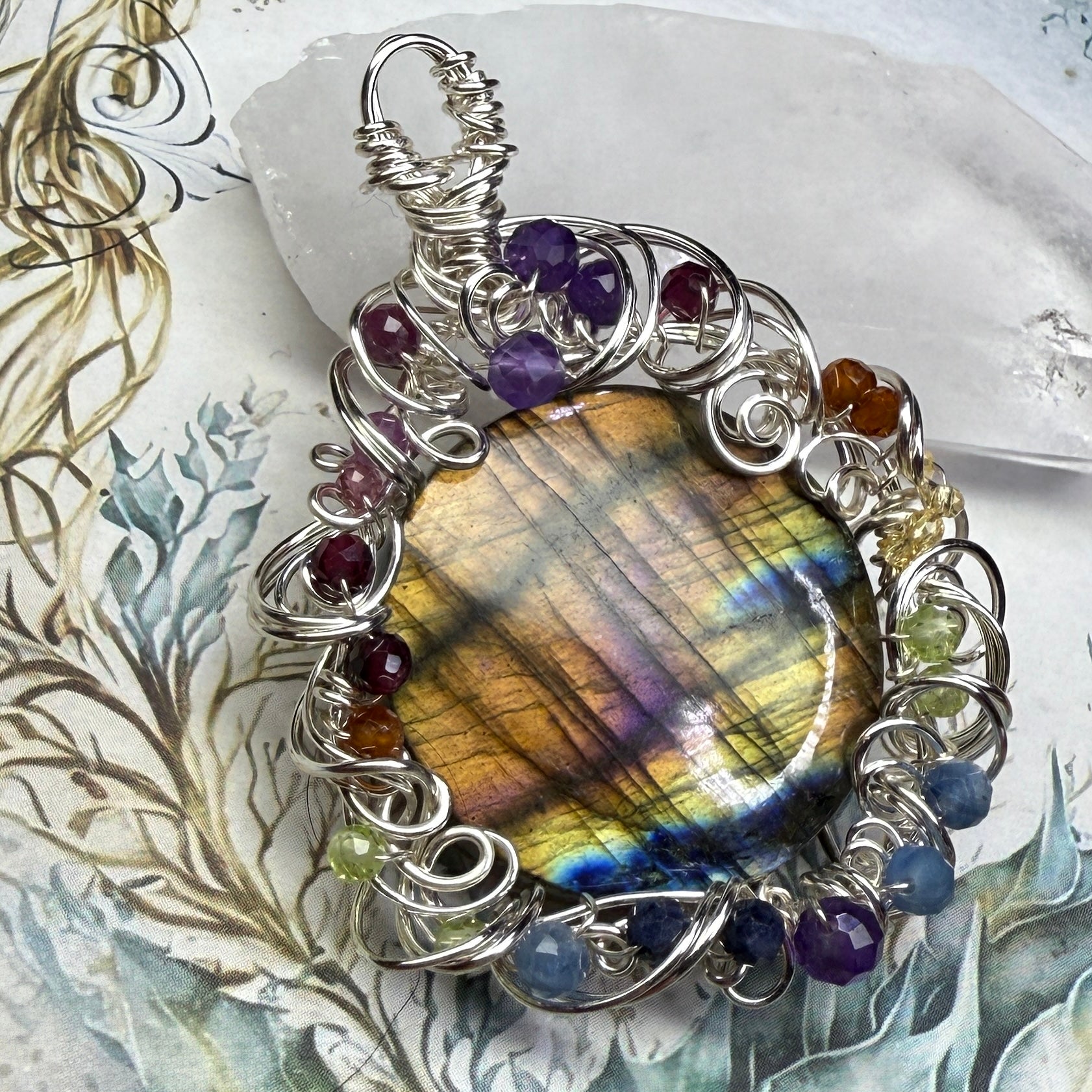 This piece is part of a collection of twelve one-of-a-kind lunar-inspired labradorite pendants being released during the last full moon of 2025.