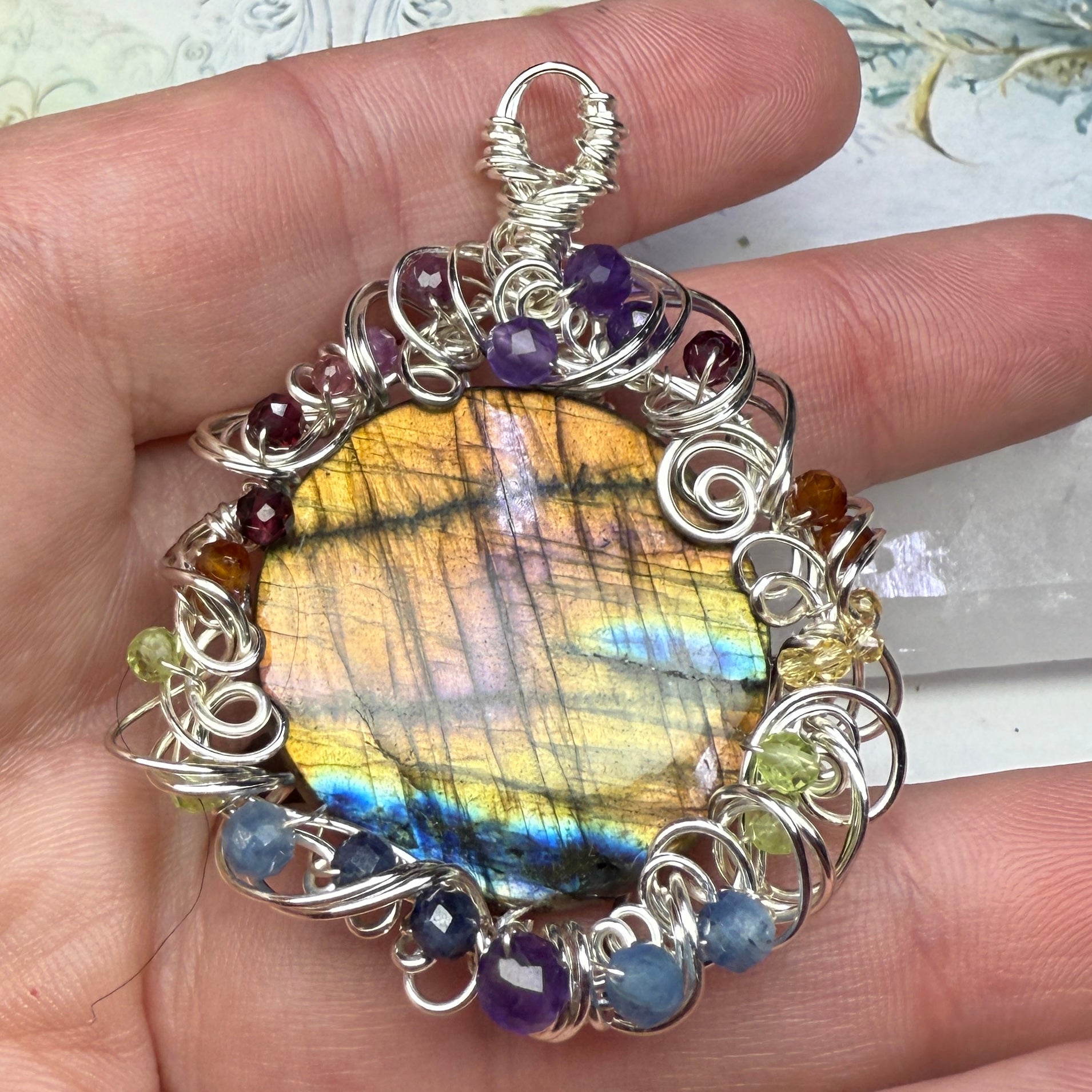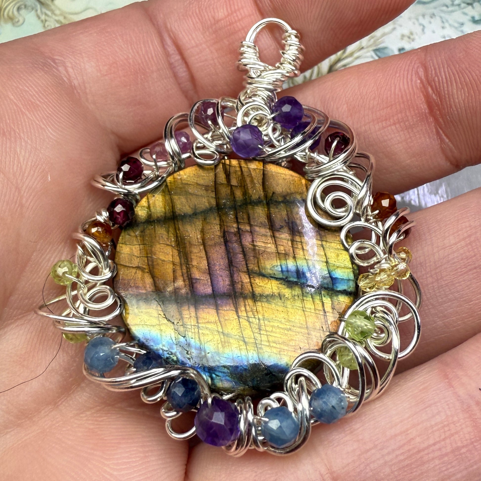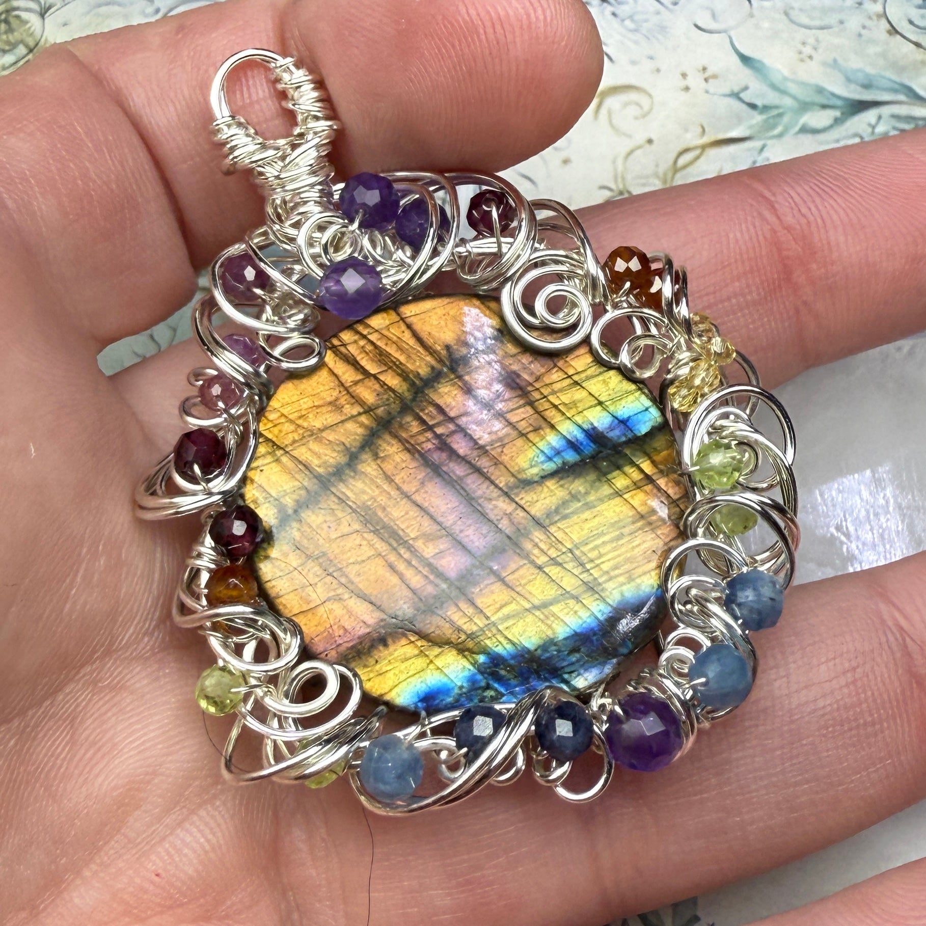 This piece is part of a collection of twelve one-of-a-kind lunar-inspired labradorite pendants being released during the last full moon of 2025.