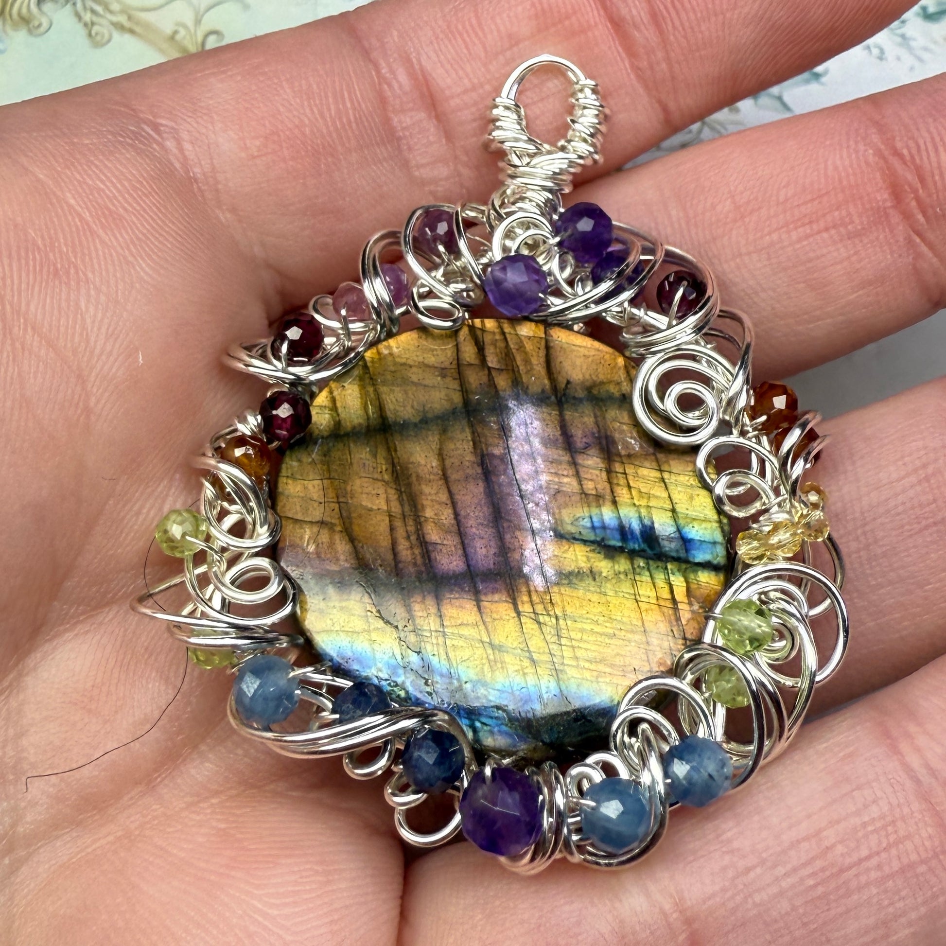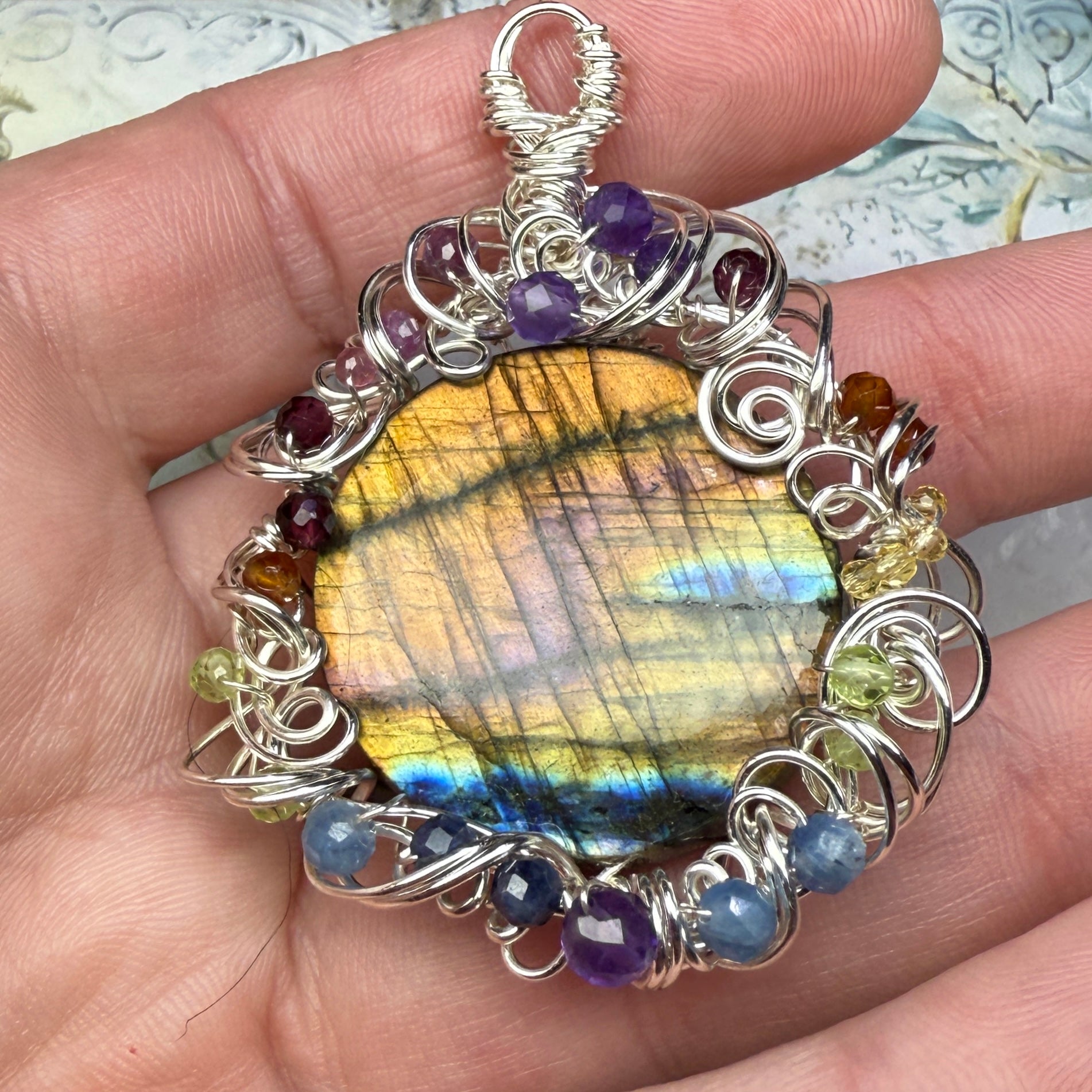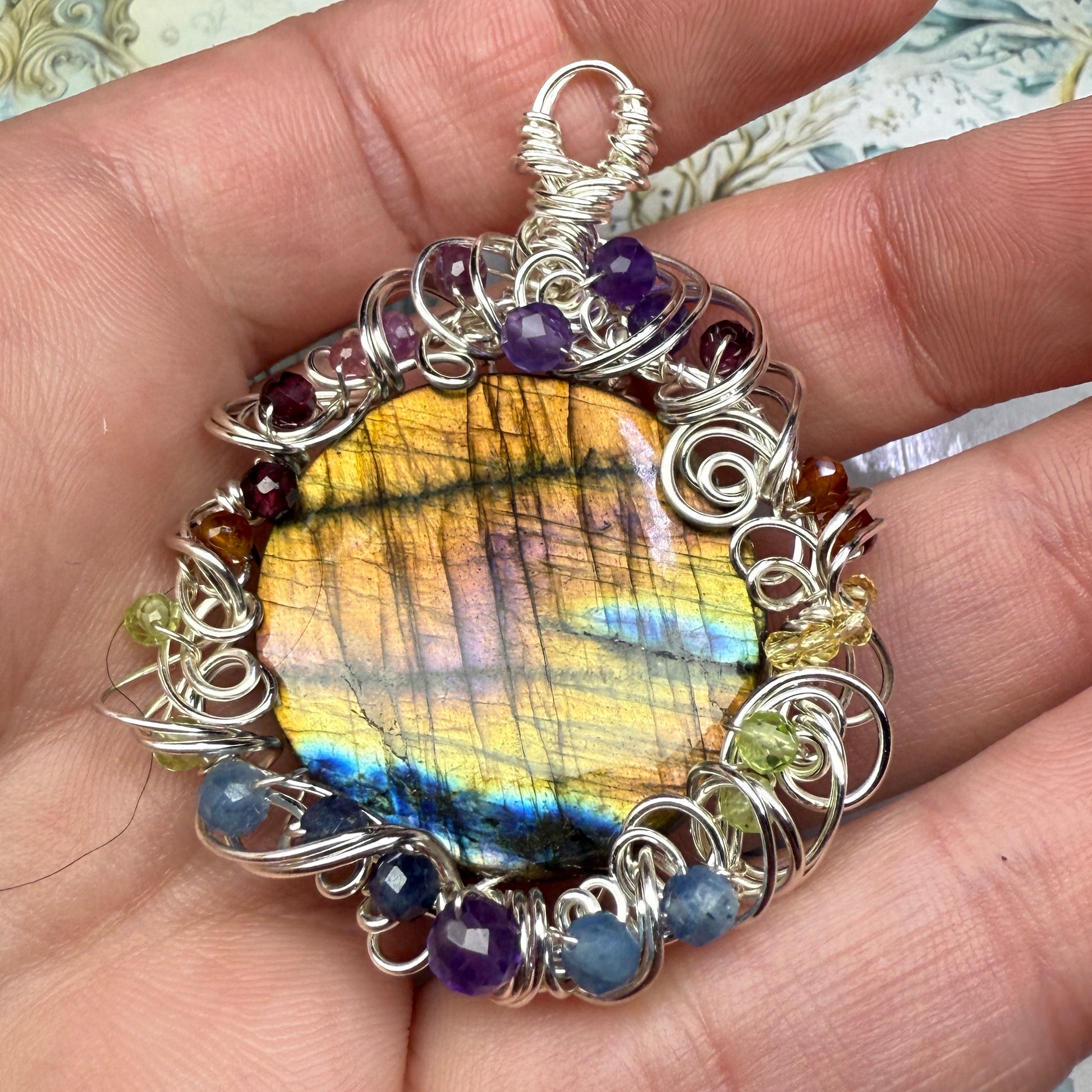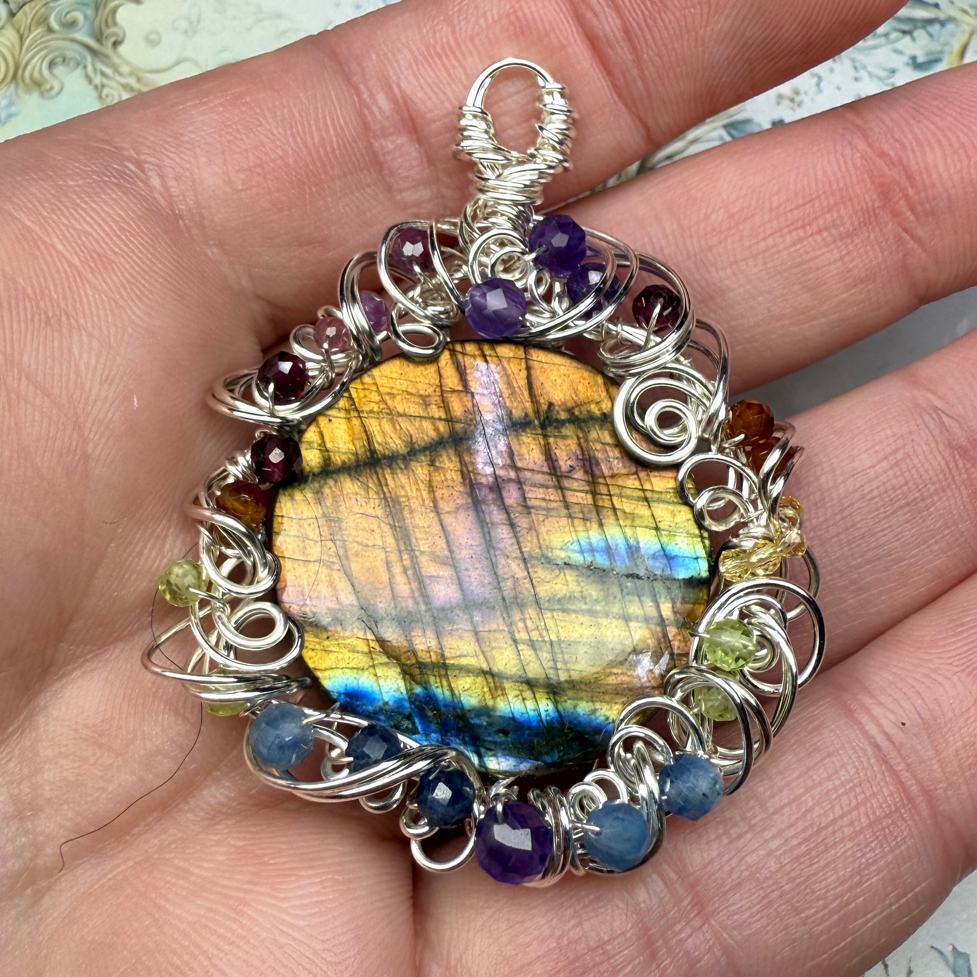This piece is part of a collection of twelve one-of-a-kind lunar-inspired labradorite pendants being released during the last full moon of 2025.