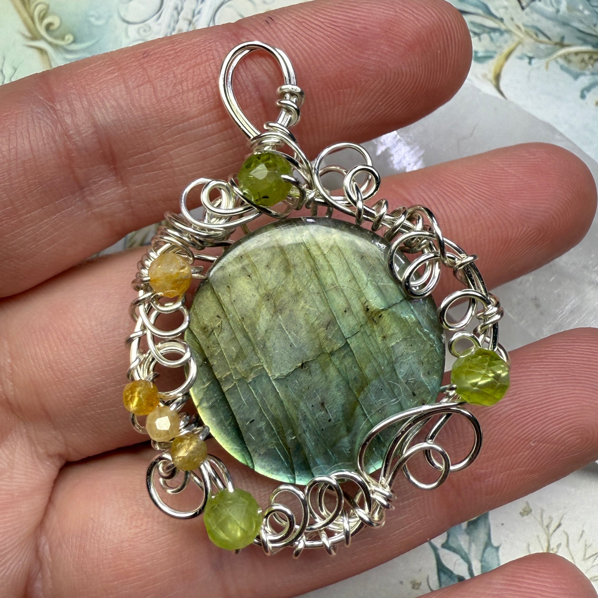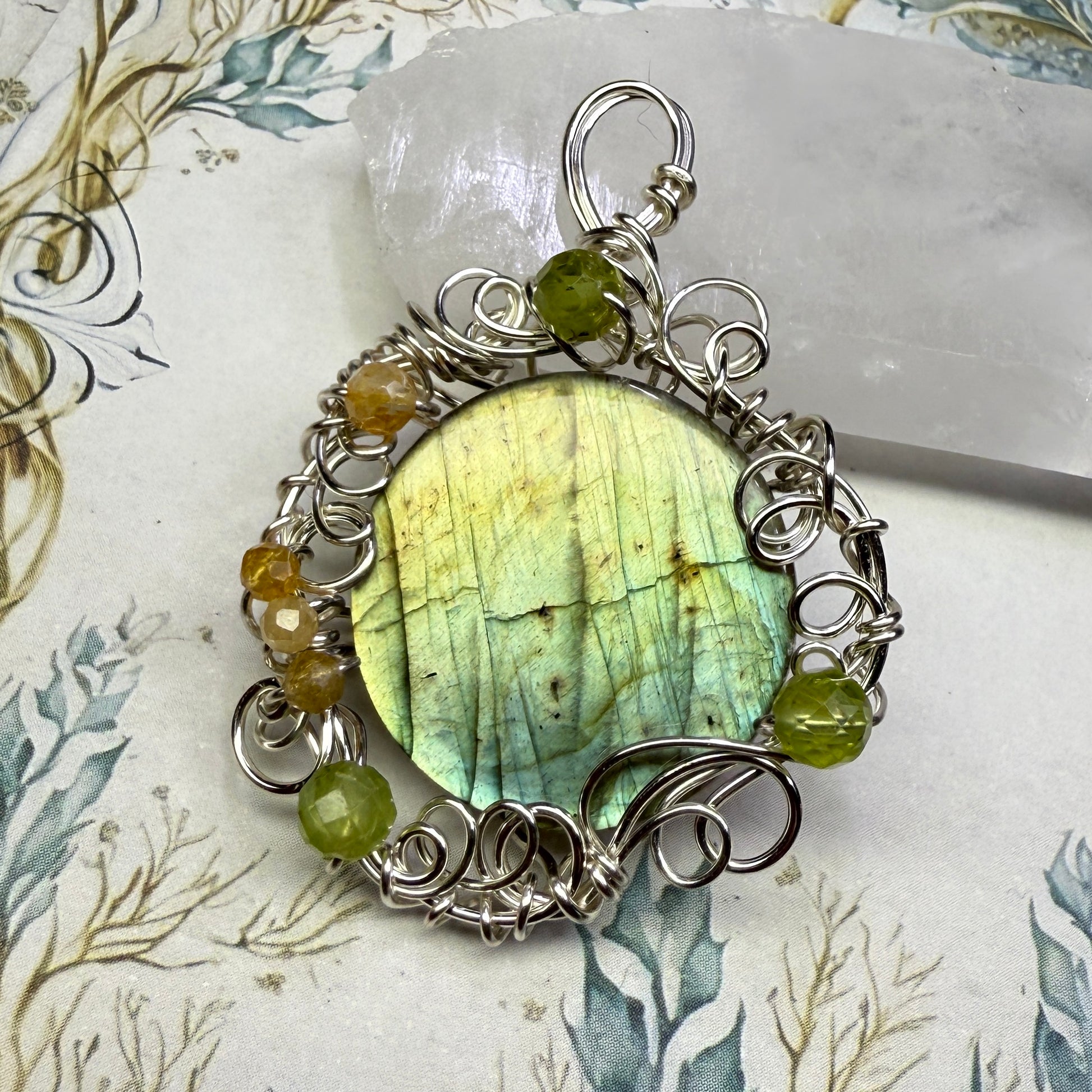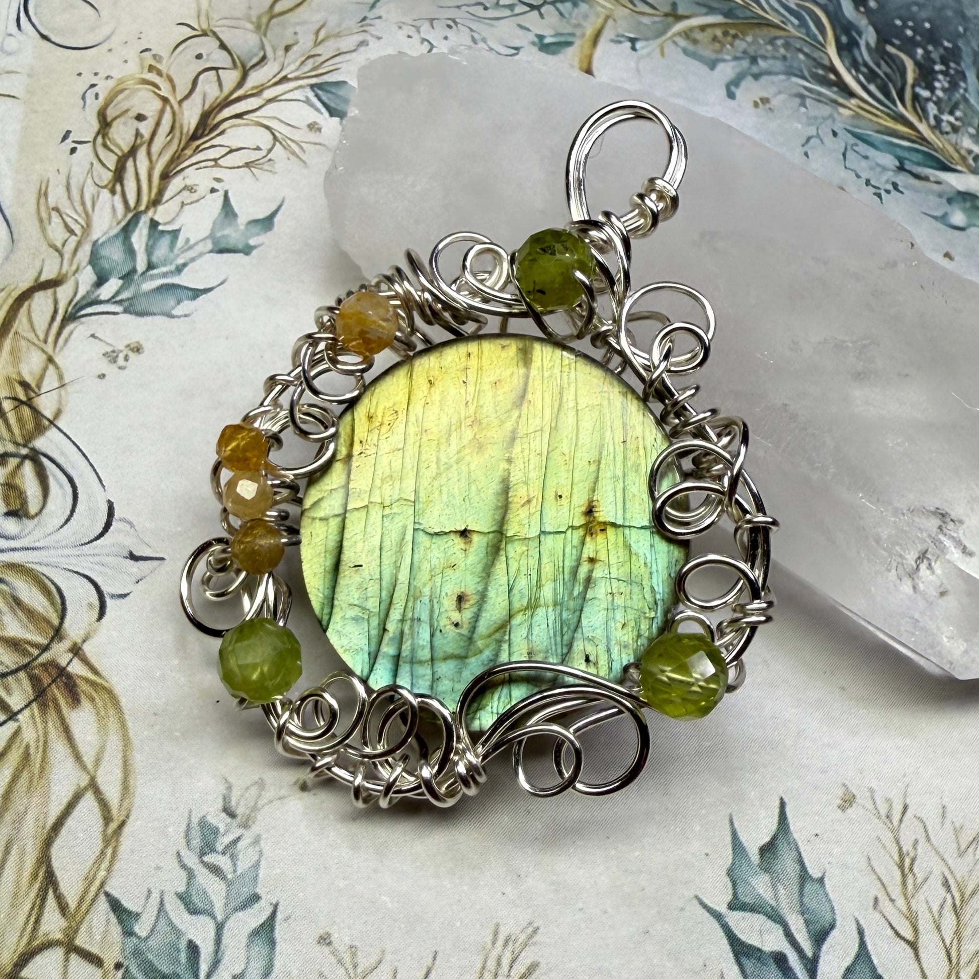 This piece is part of a collection of twelve one-of-a-kind lunar-inspired labradorite pendants being released during the last full moon of 2025.