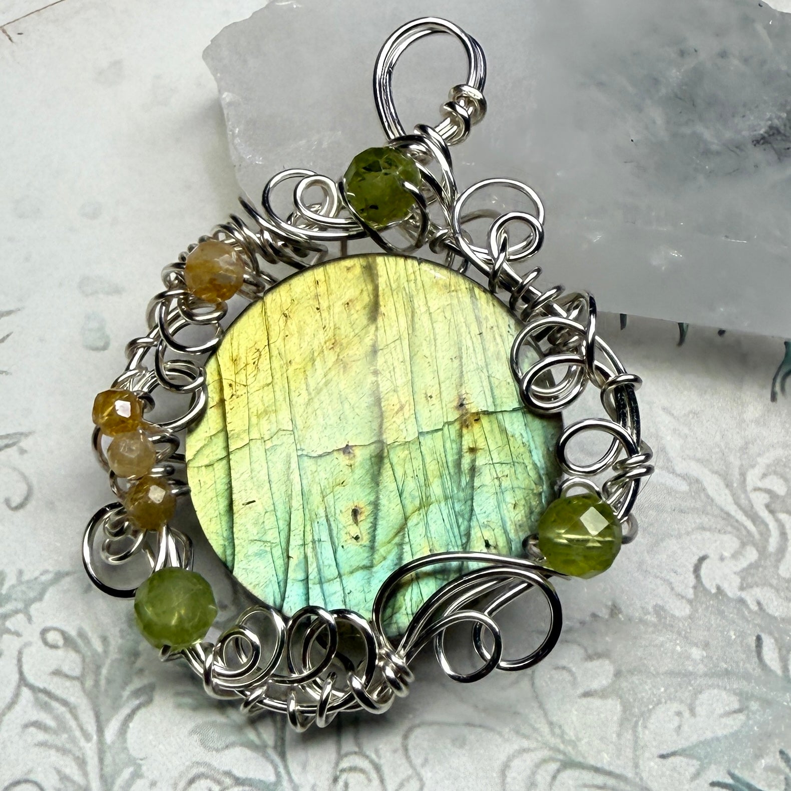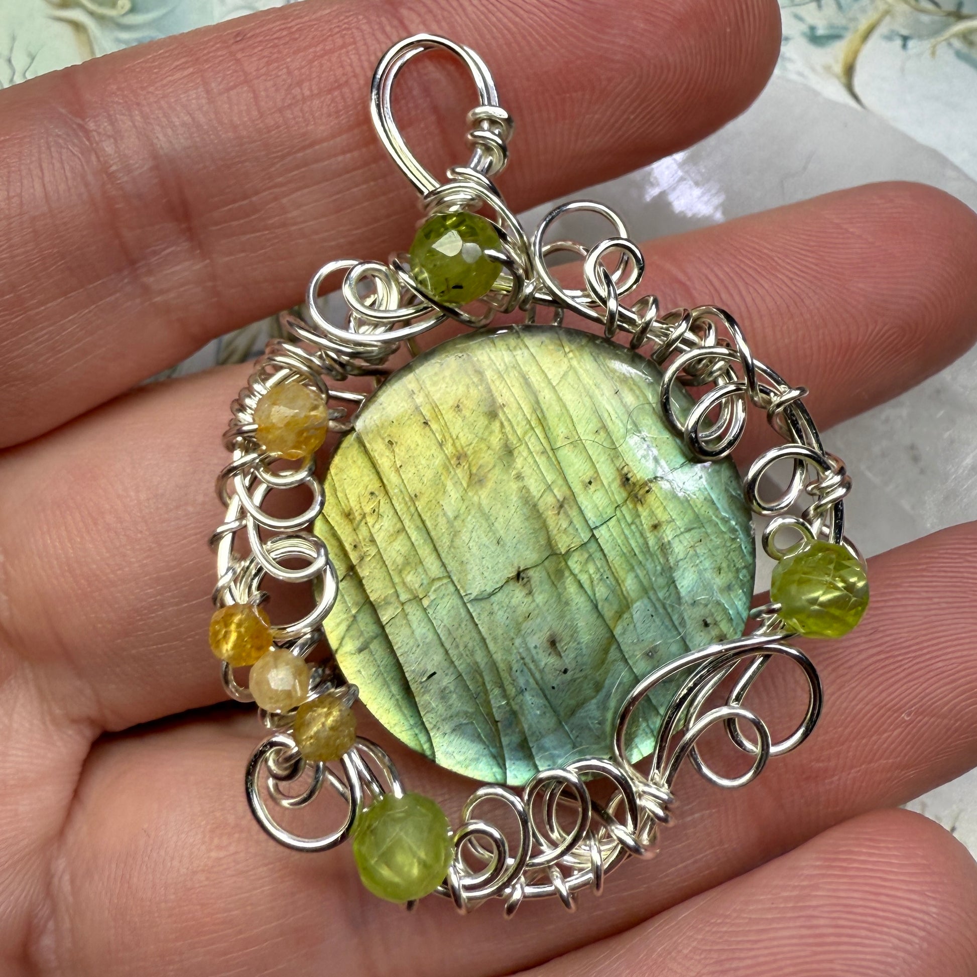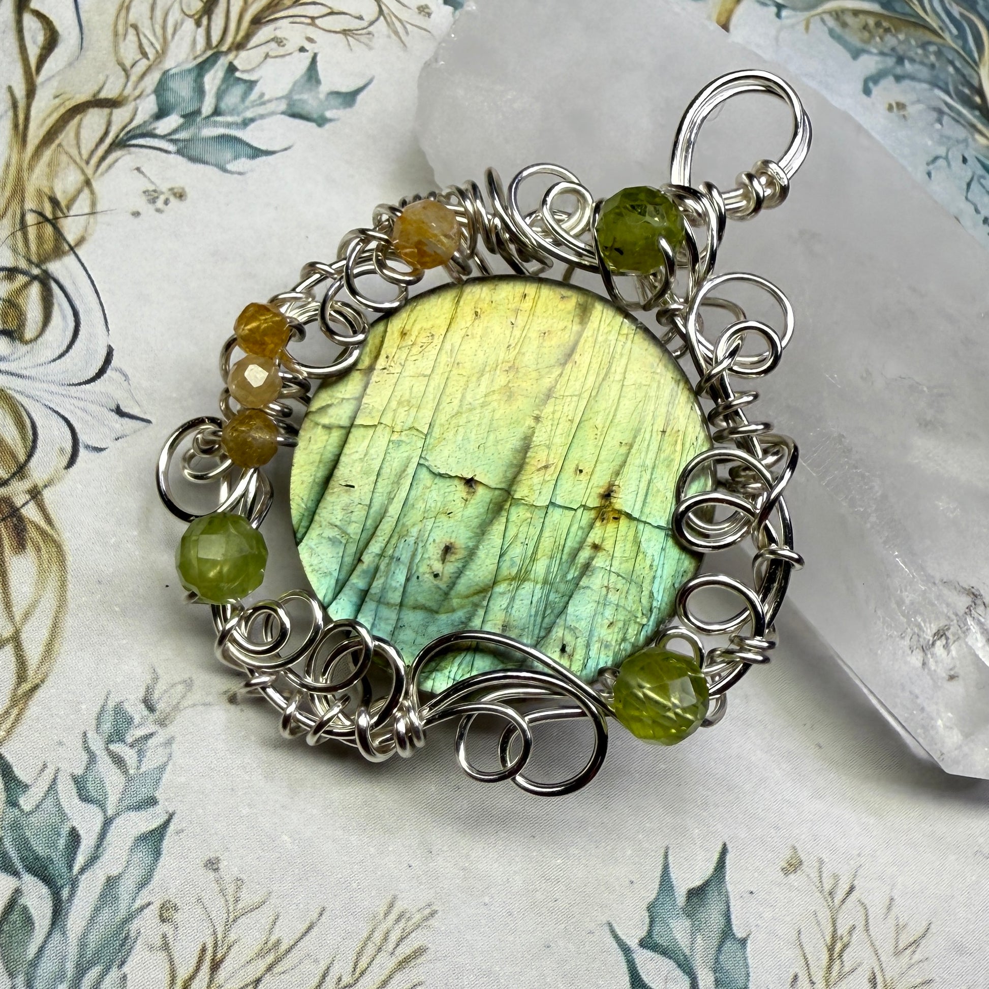 This piece is part of a collection of twelve one-of-a-kind lunar-inspired labradorite pendants being released during the last full moon of 2025.