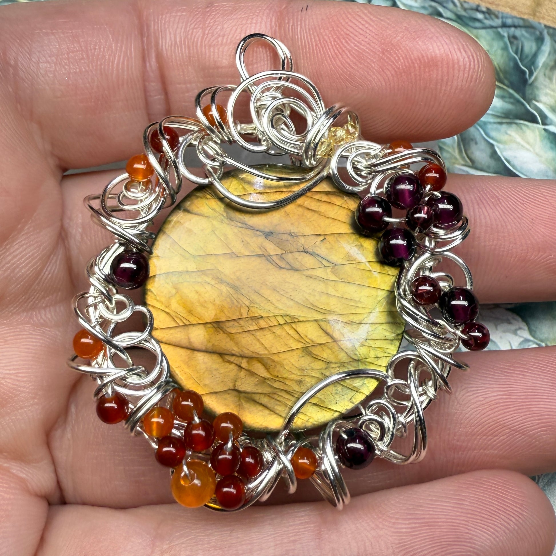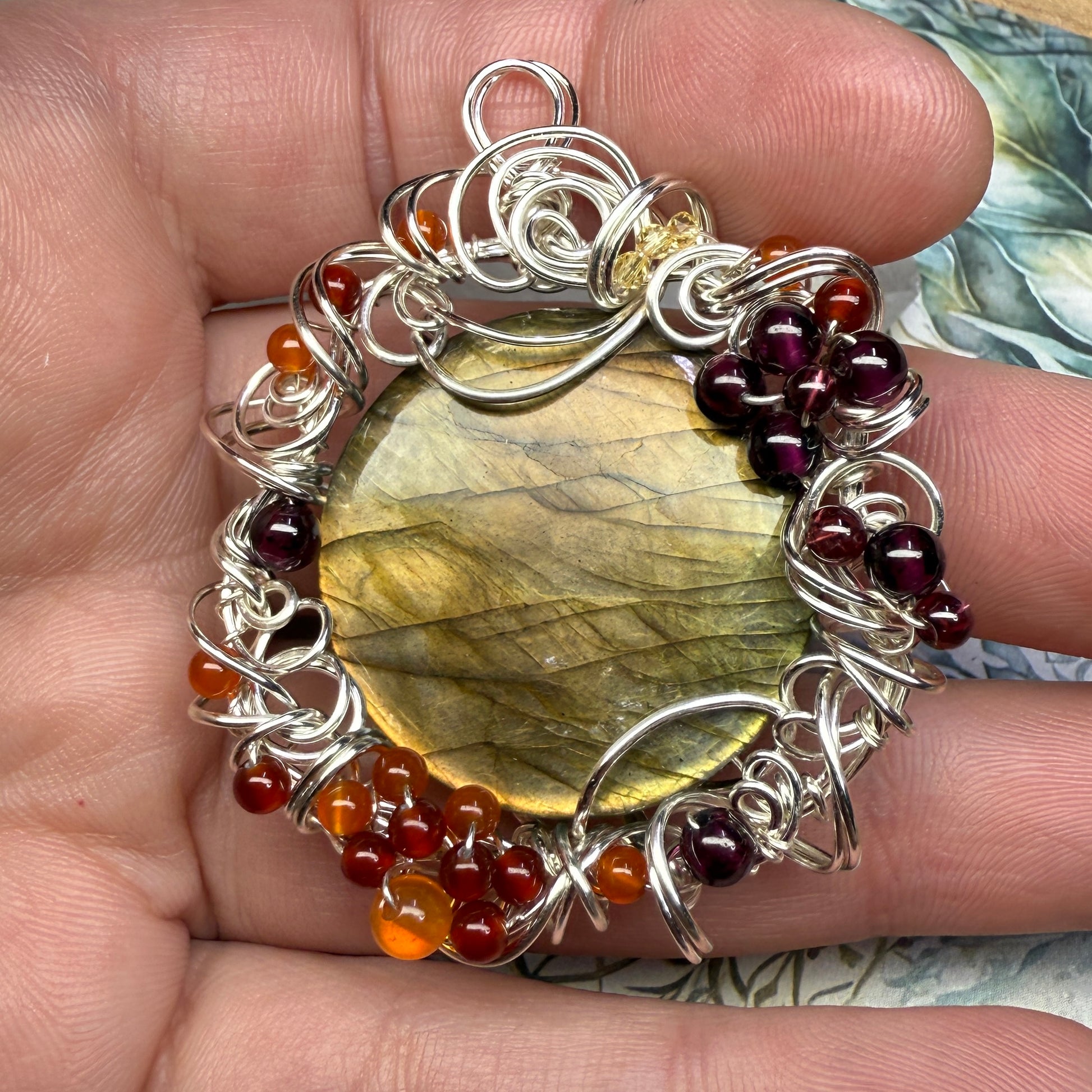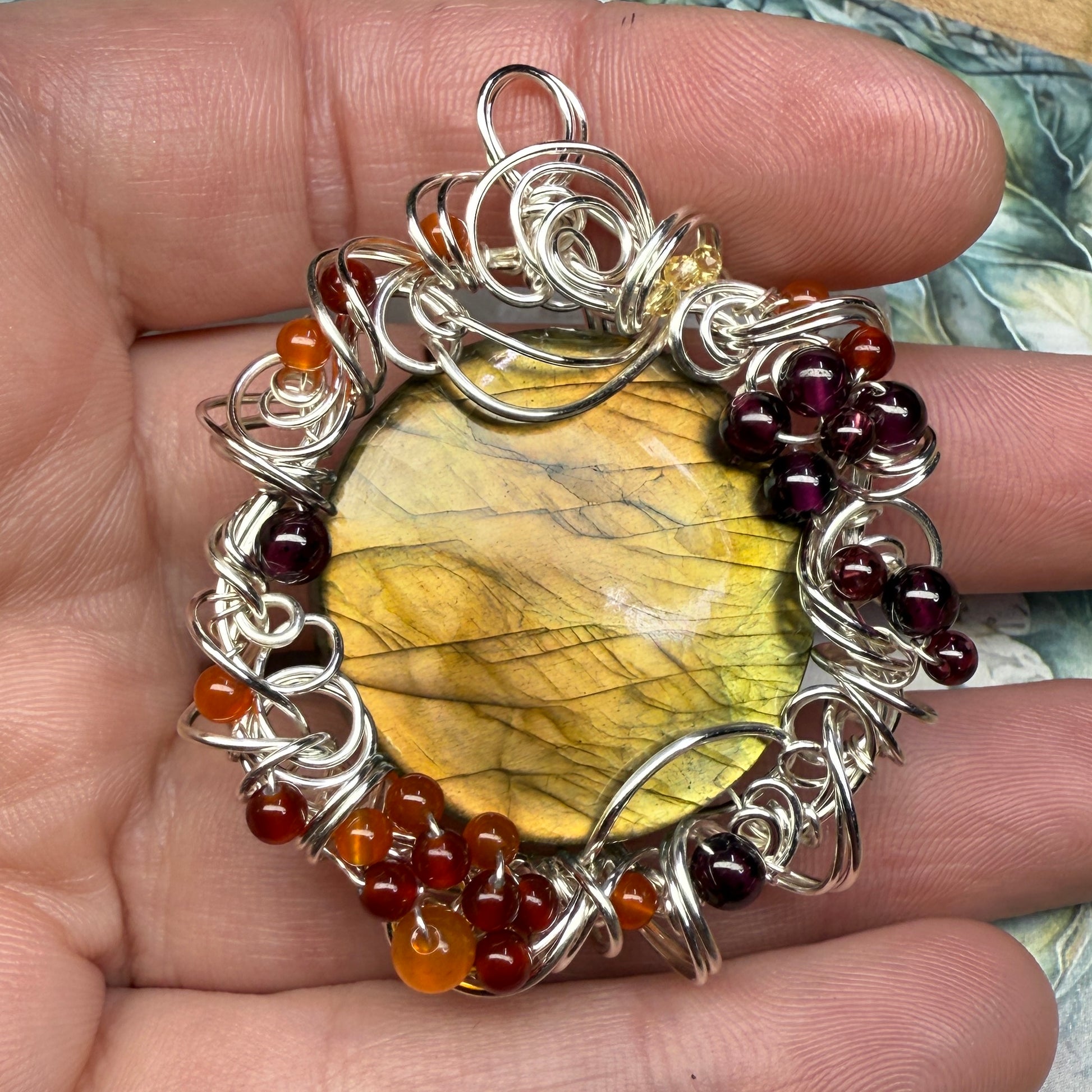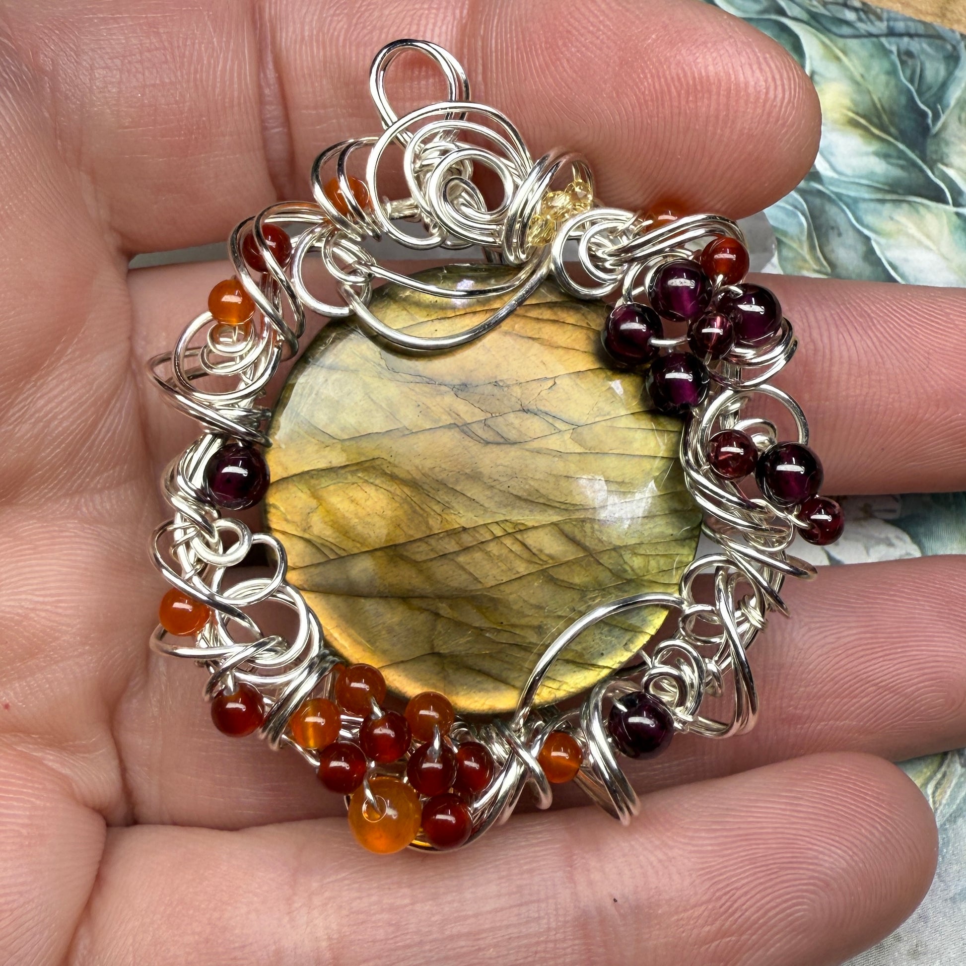 This one has golden flash that shifts from greenish-gold to sunset orange depending on the angle, and is accented with garnets, carnelian, red agate, and yellow zirconia. About 2.25” tall.