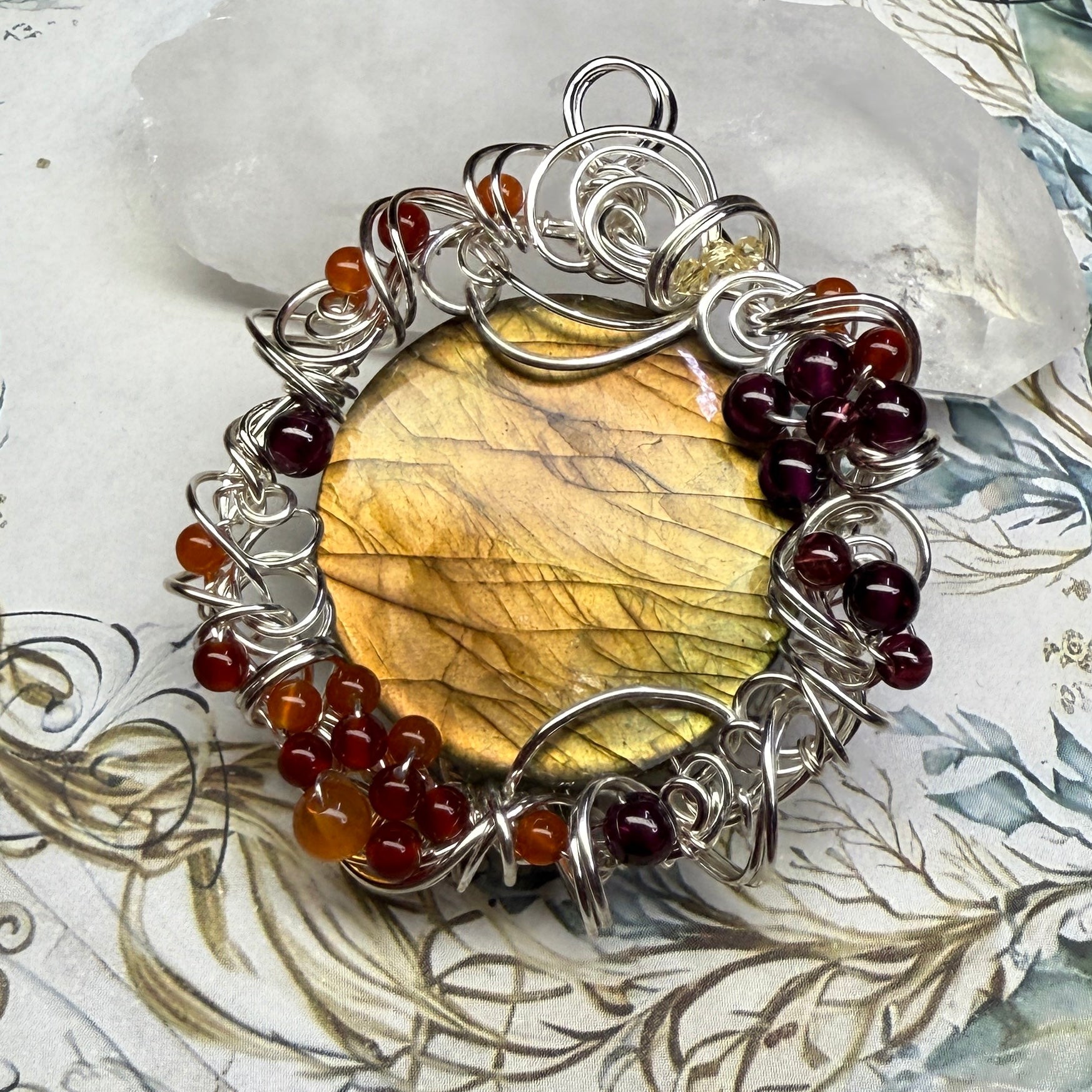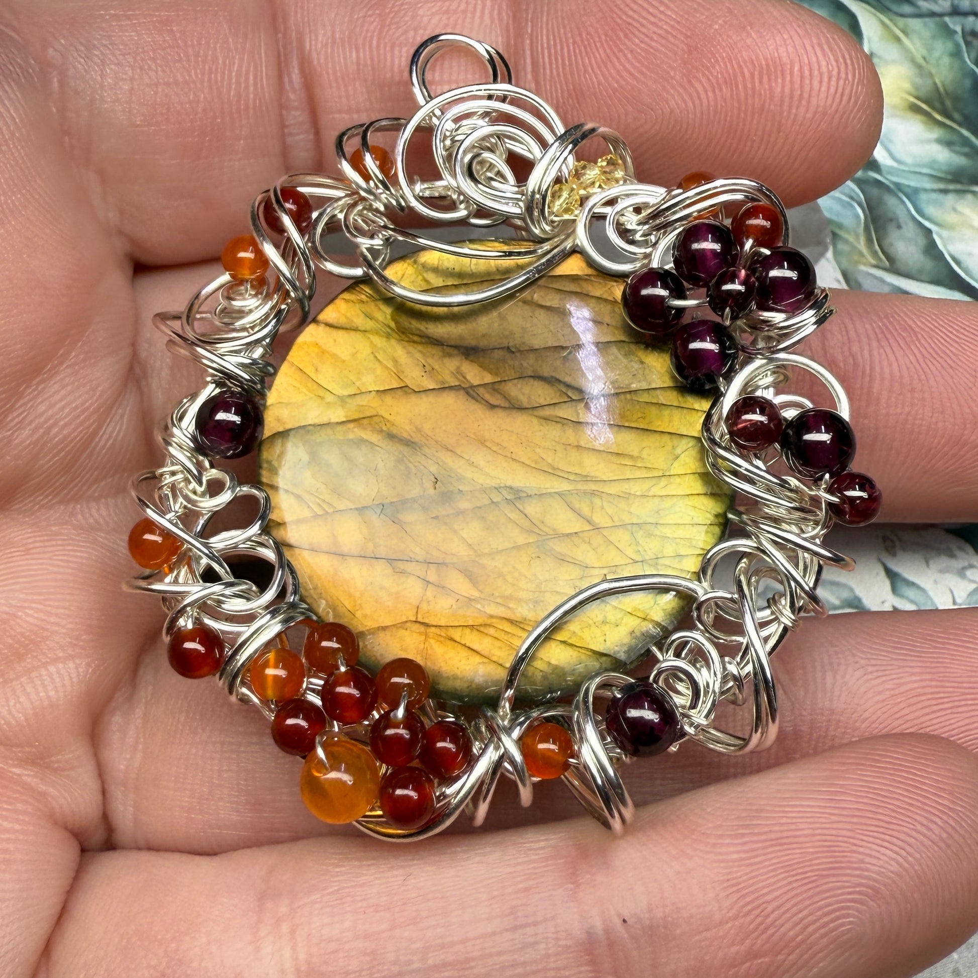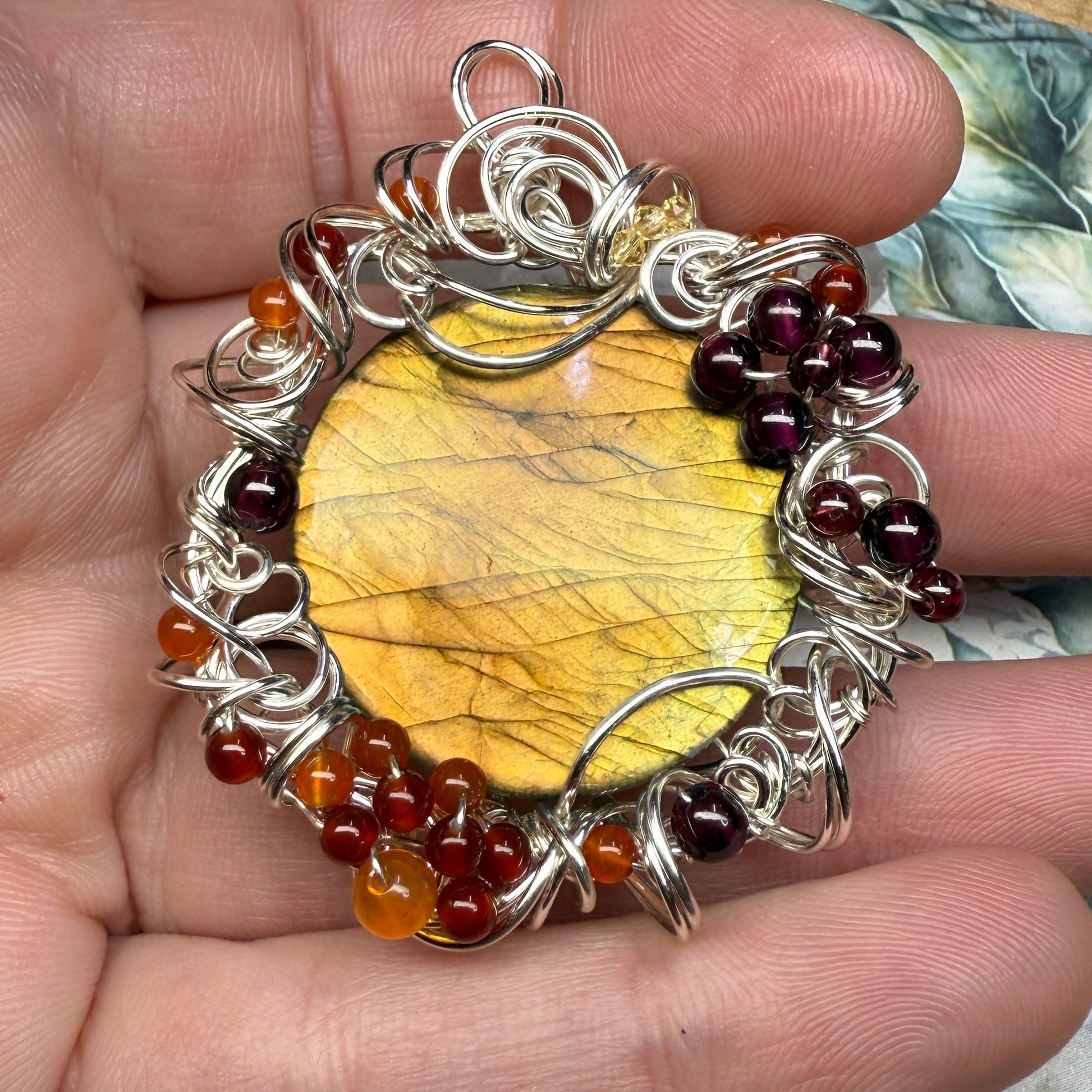 This one has golden flash that shifts from greenish-gold to sunset orange depending on the angle, and is accented with garnets, carnelian, red agate, and yellow zirconia. About 2.25” tall.