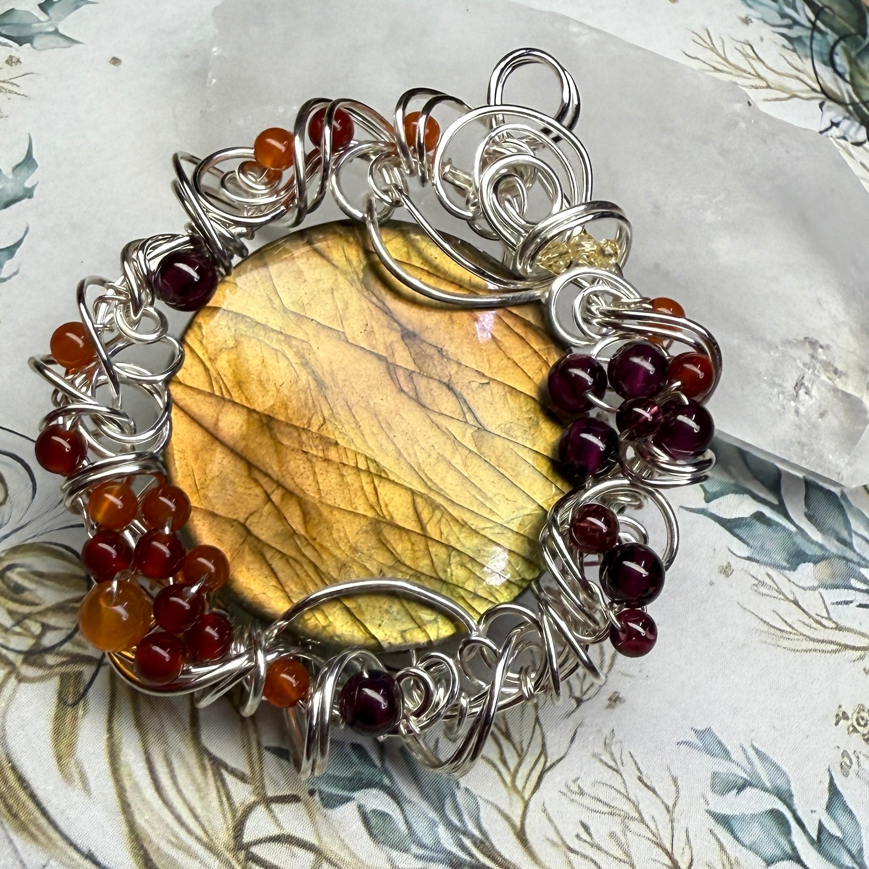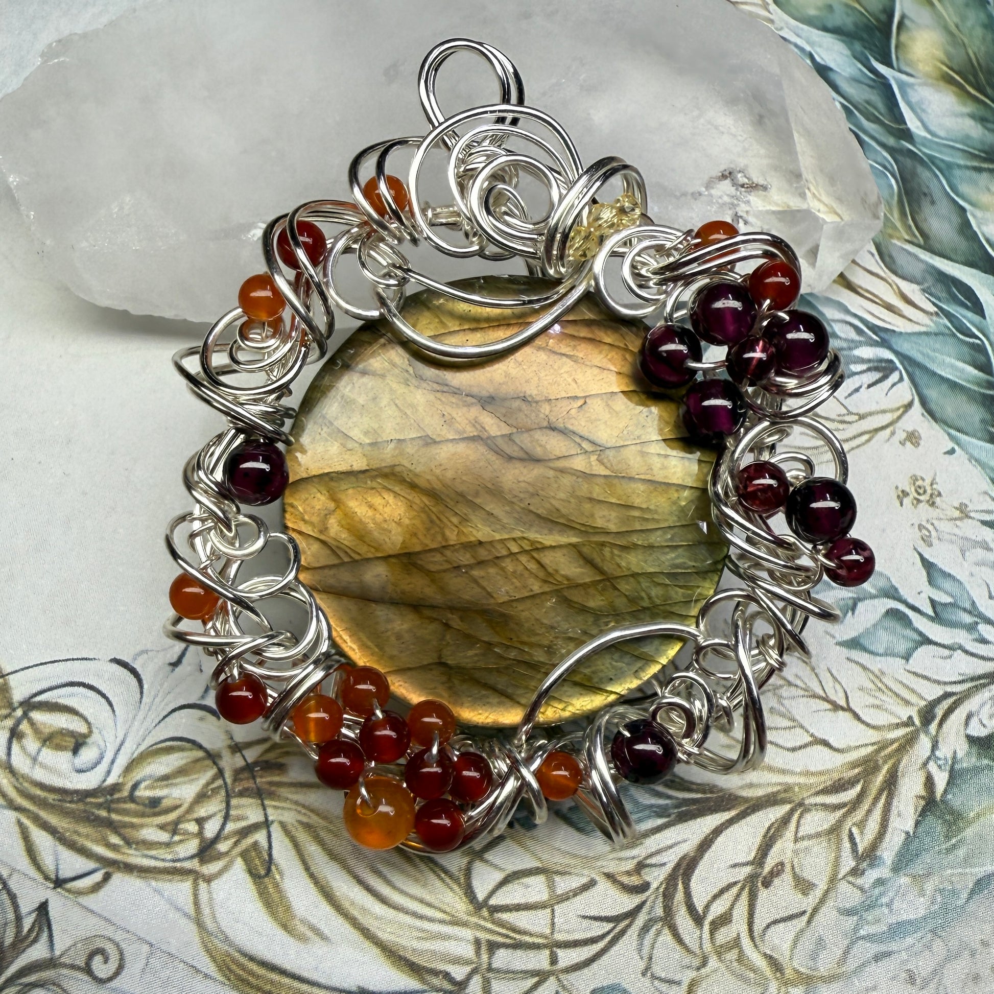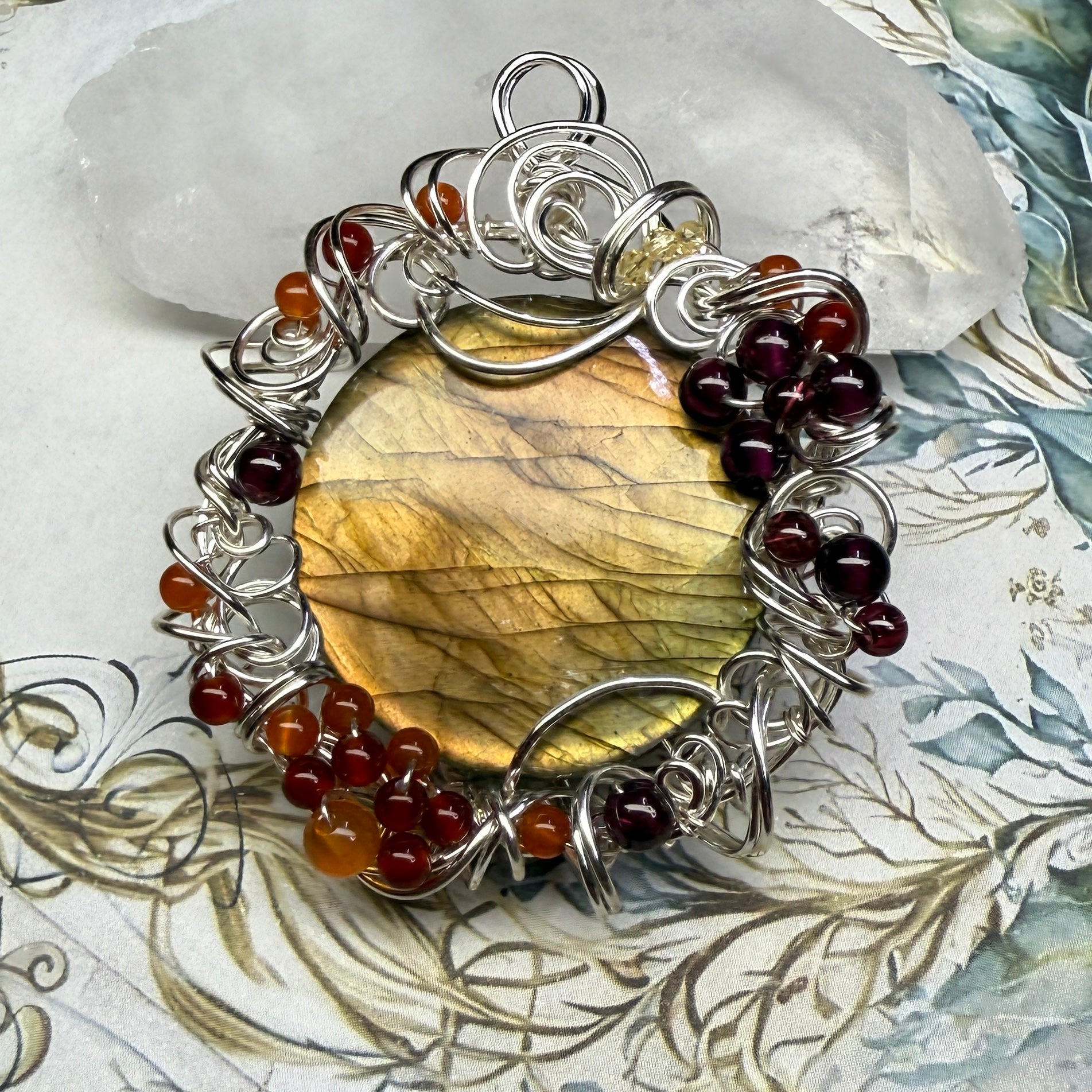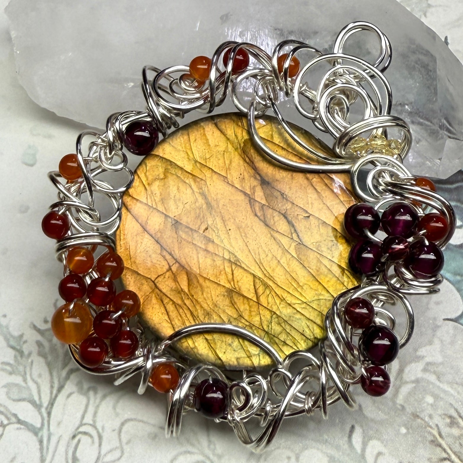 This one has golden flash that shifts from greenish-gold to sunset orange depending on the angle, and is accented with garnets, carnelian, red agate, and yellow zirconia. About 2.25” tall.