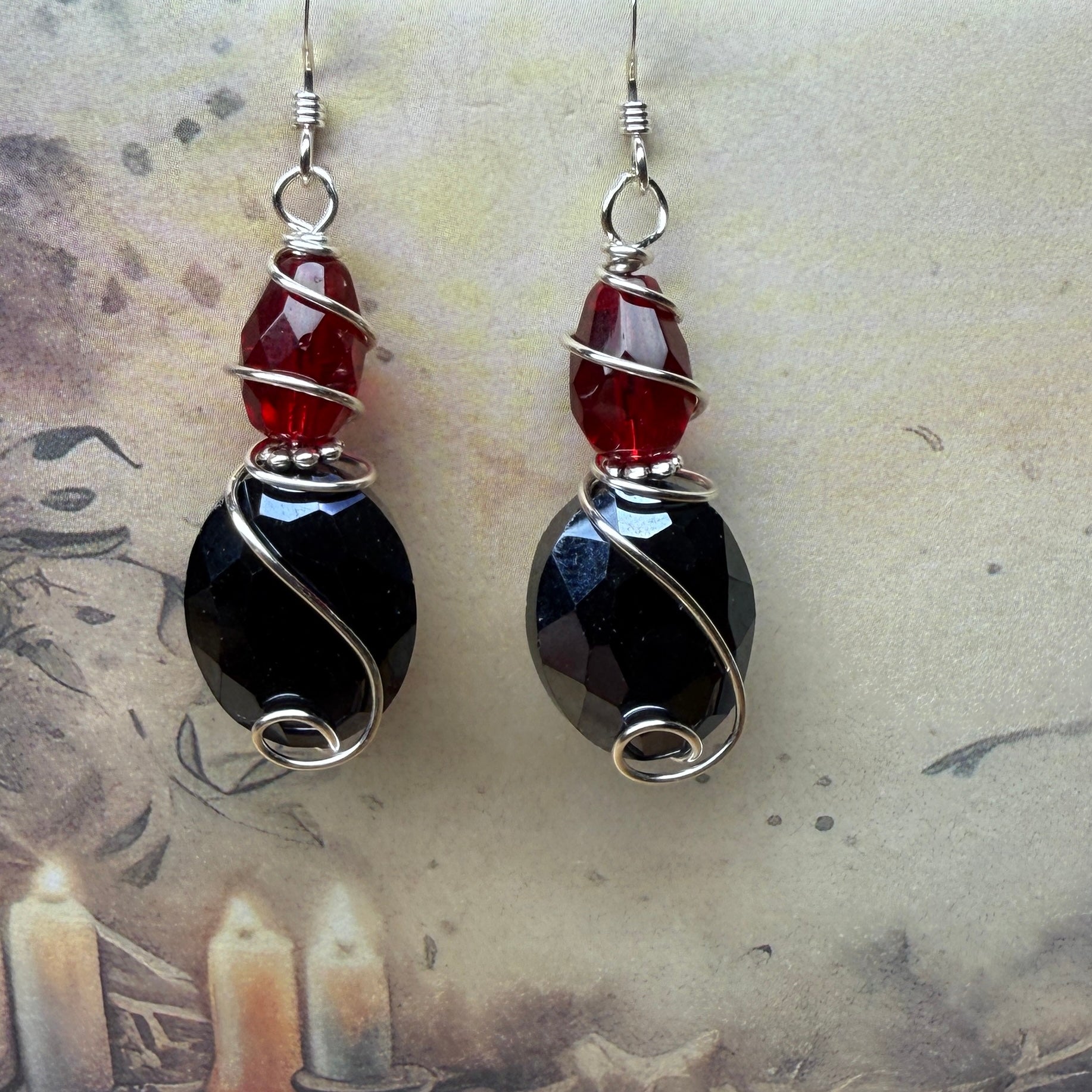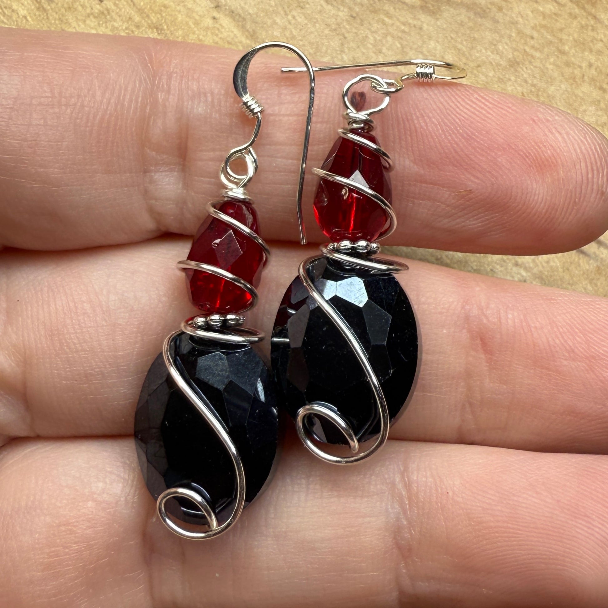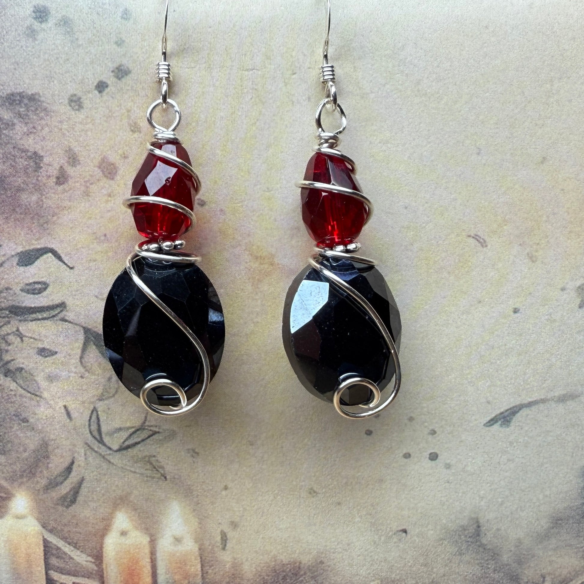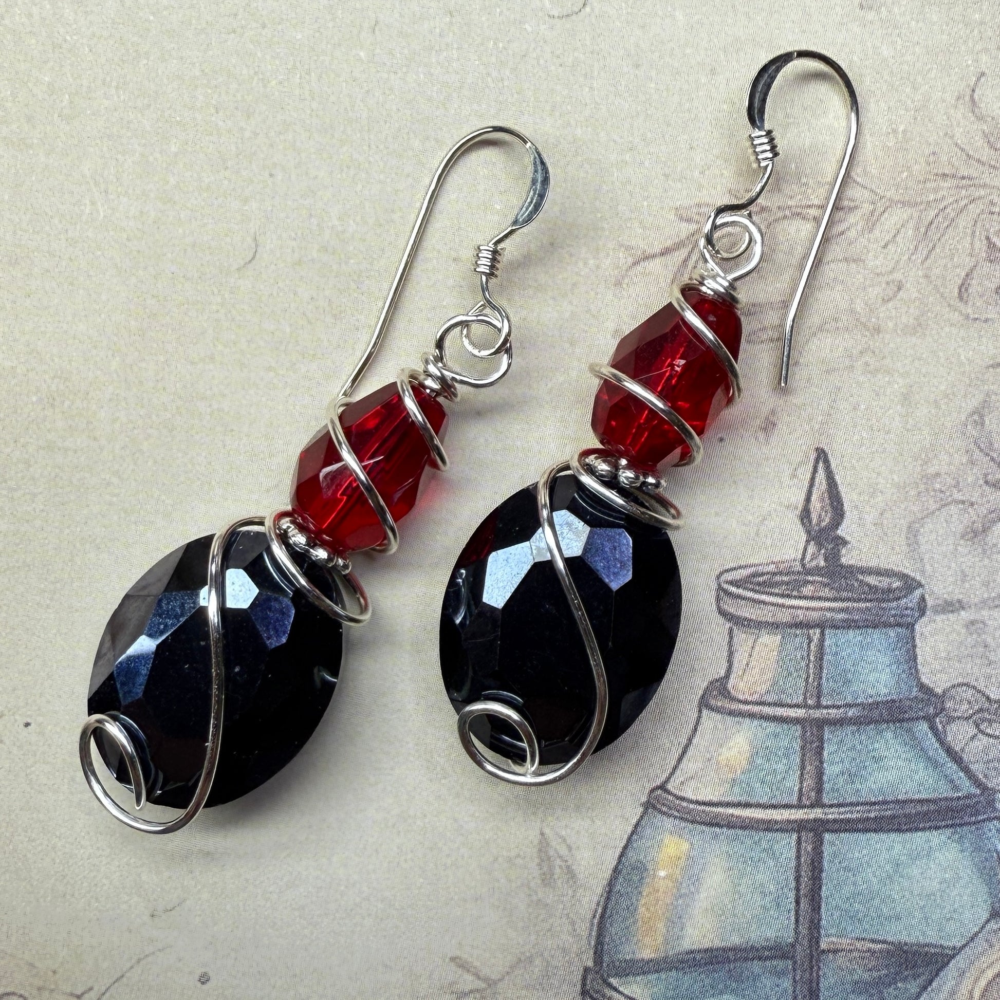 Blood red and midnight black vintage glass in swirls of silver wire.