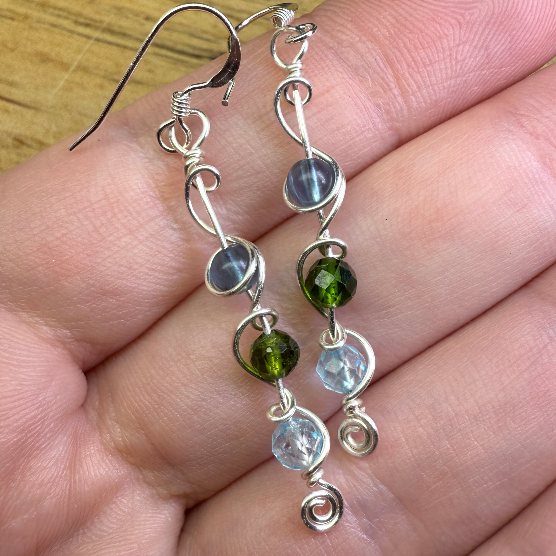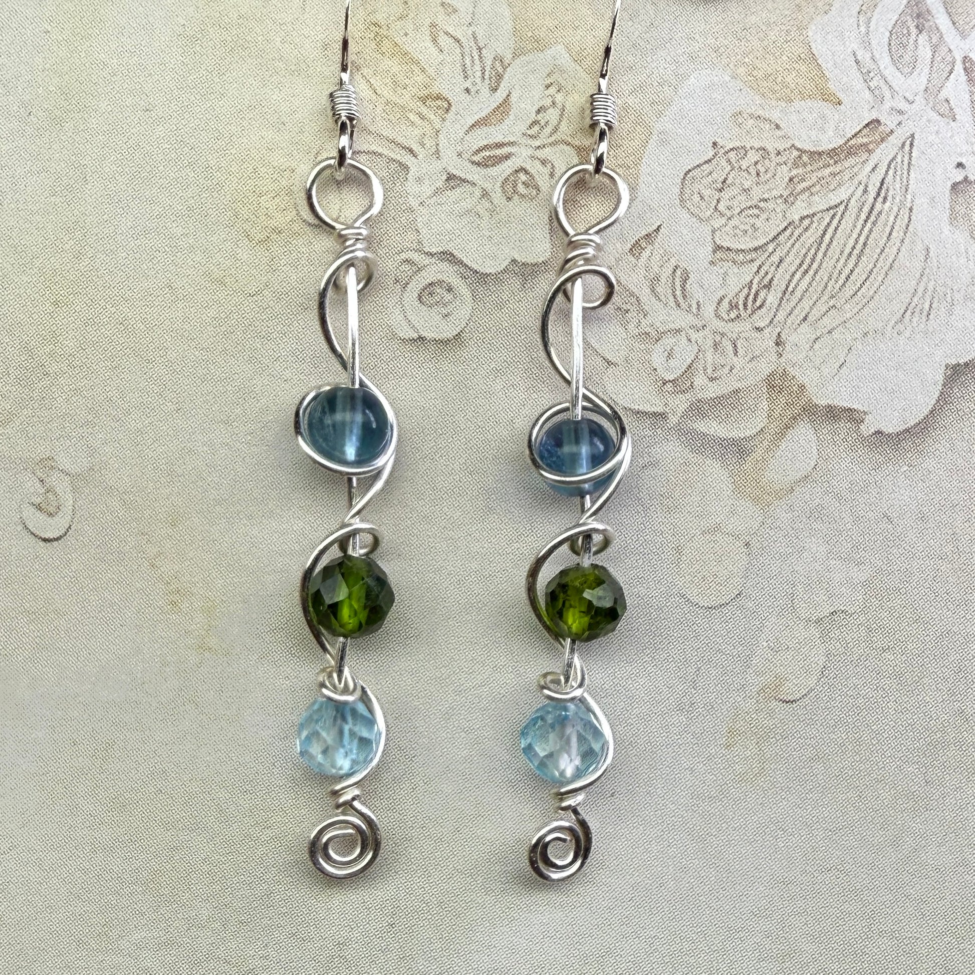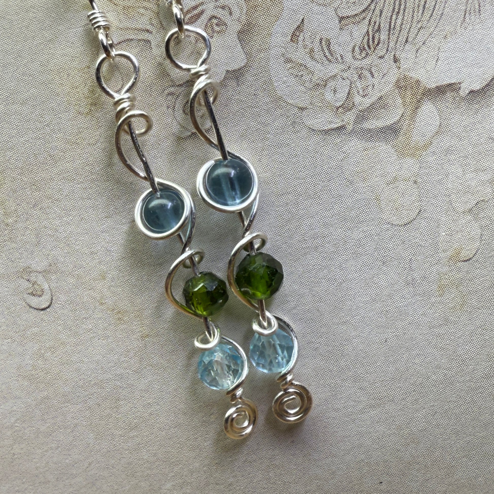 (If you don’t wear earrings but would like some jewelry made from blue Fluorite, chrome Diopside, and blue Topaz I have plenty of these beads and can also make pendants ($25), bracelets, ($30) and neckvines ($35) upon request.)