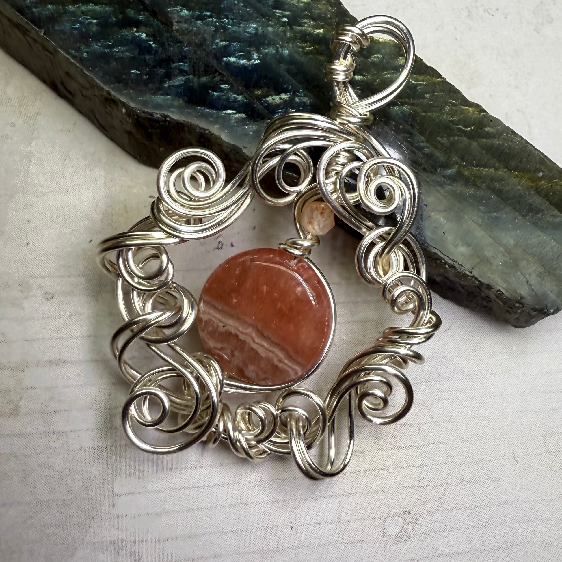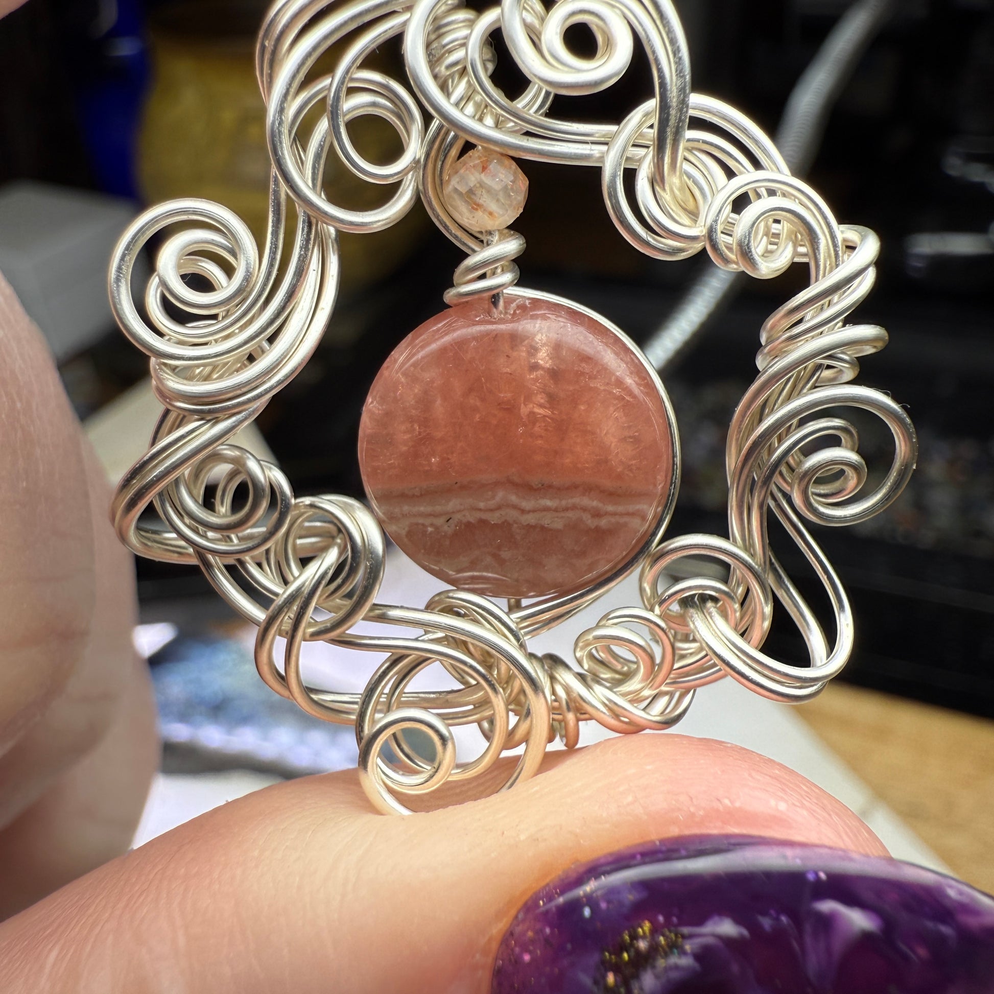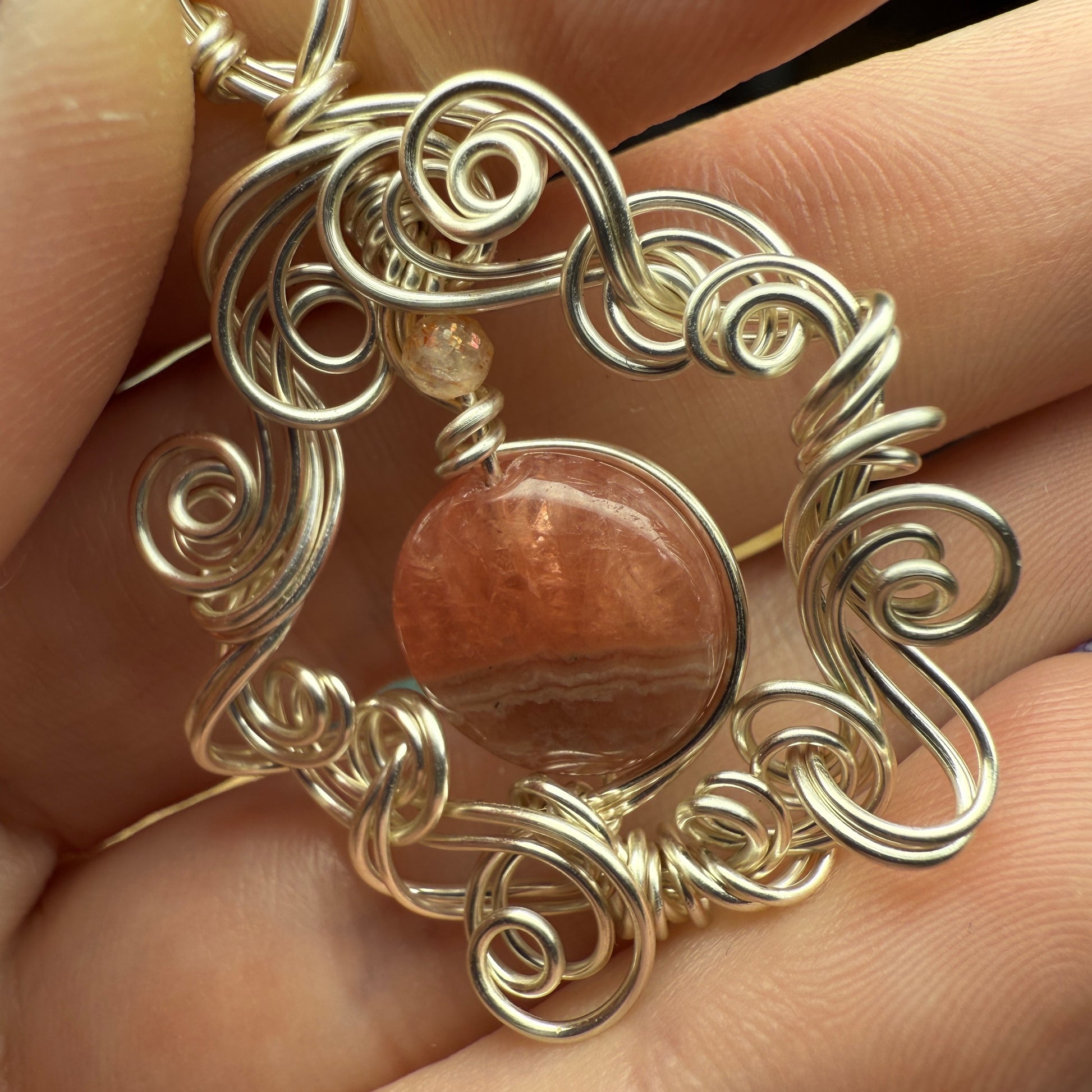Particularly gemmy rhodochrosite, accented with sunstone and set in swirling silver wire.