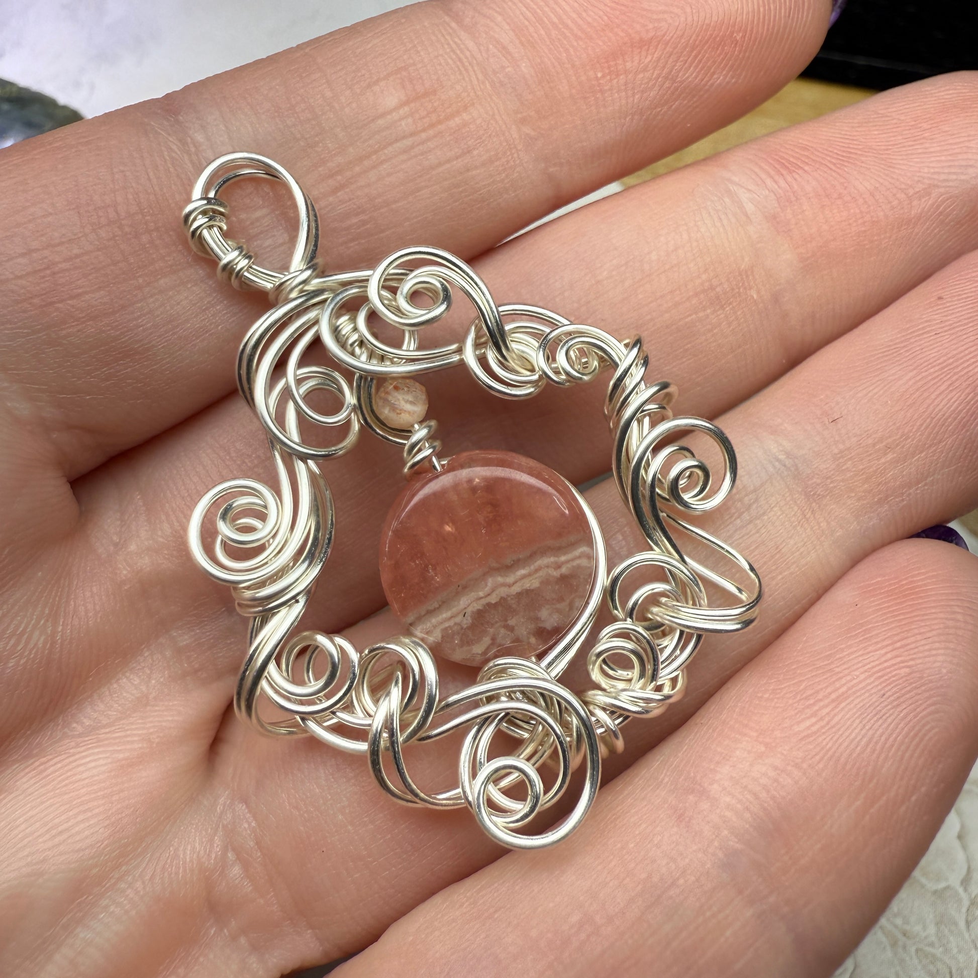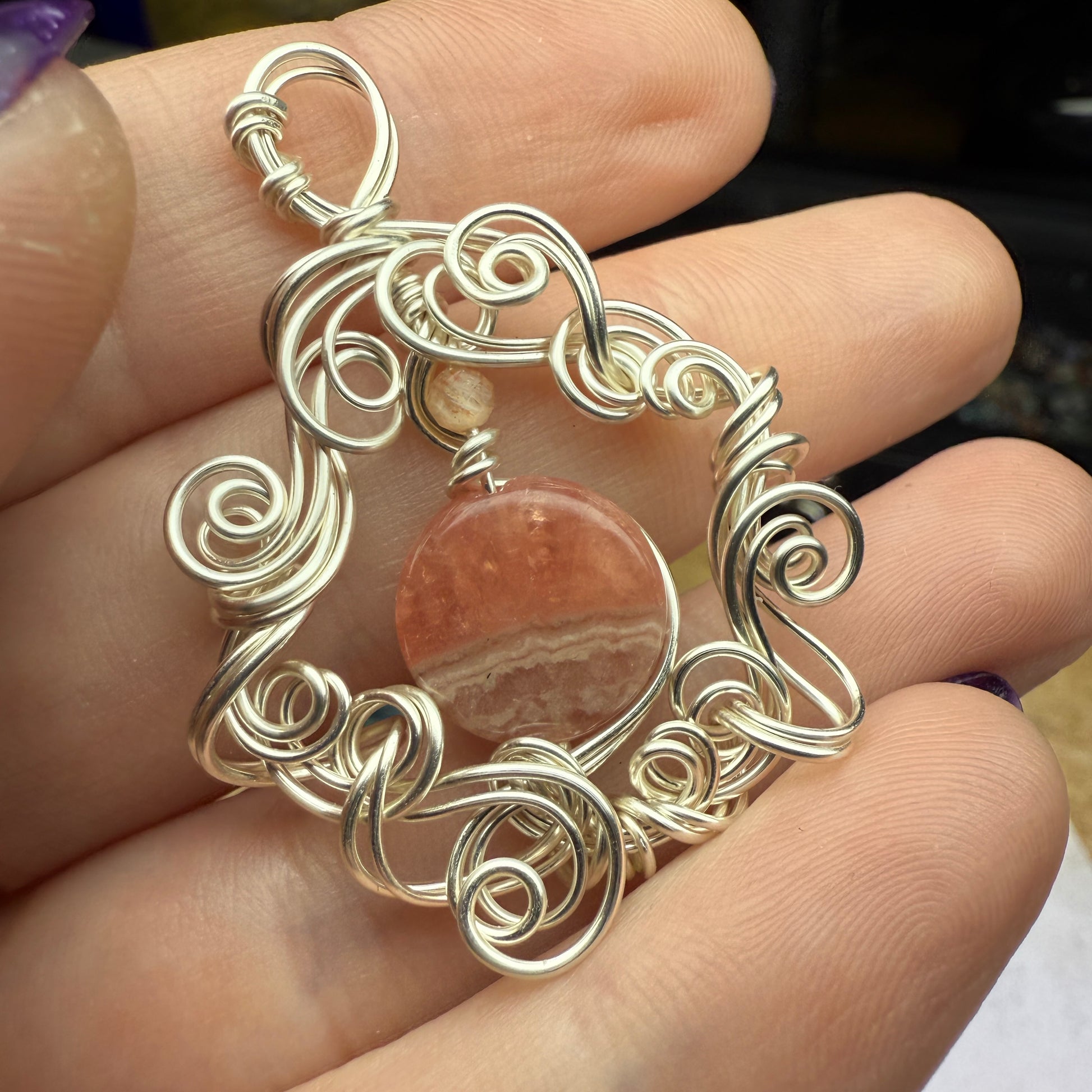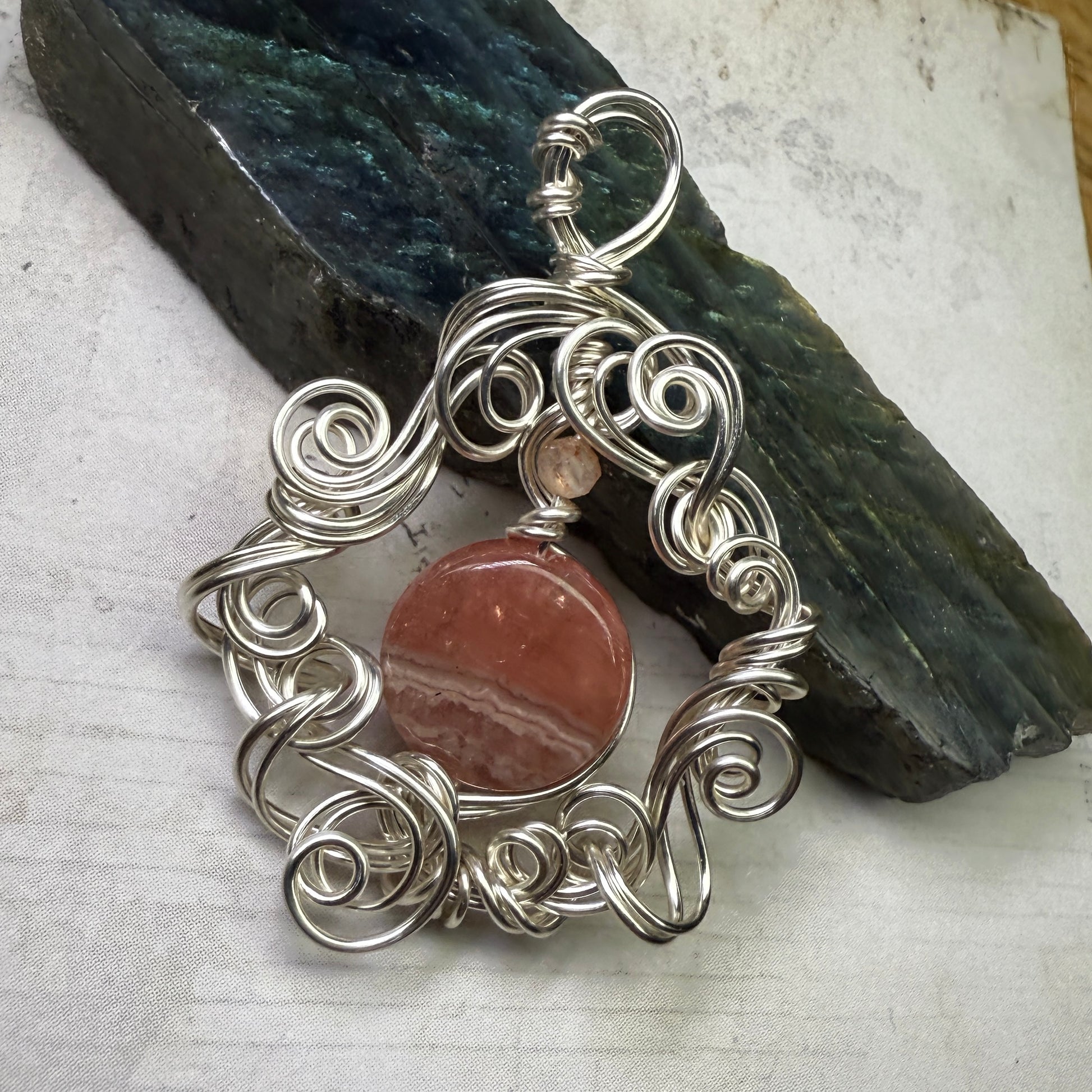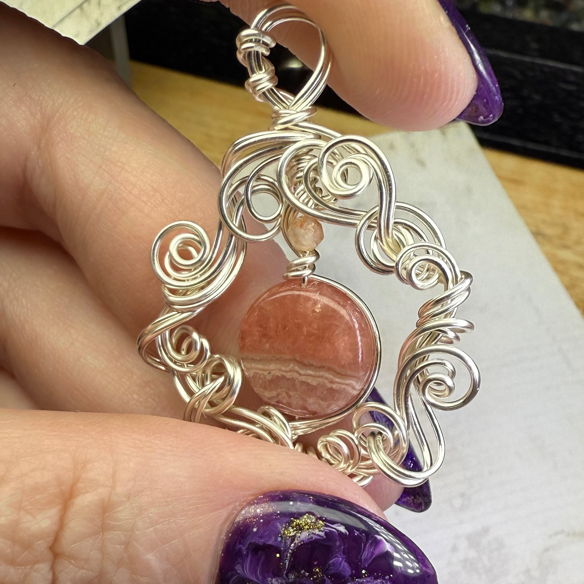 Particularly gemmy rhodochrosite, accented with sunstone and set in swirling silver wire.