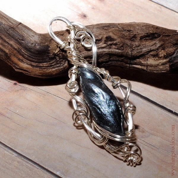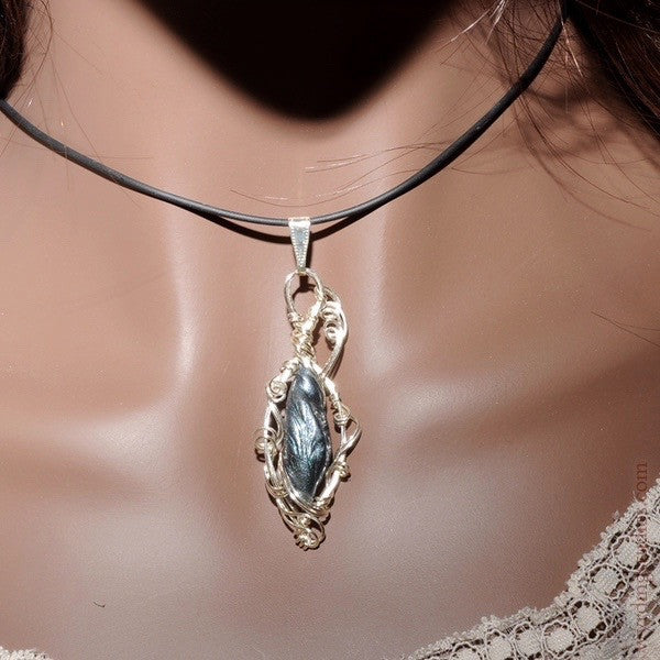 Hand-sculpted polymer clay chrysalis with shimmering mica finish, set in tendrils of silver wire. 2.1” high, .75” wide.