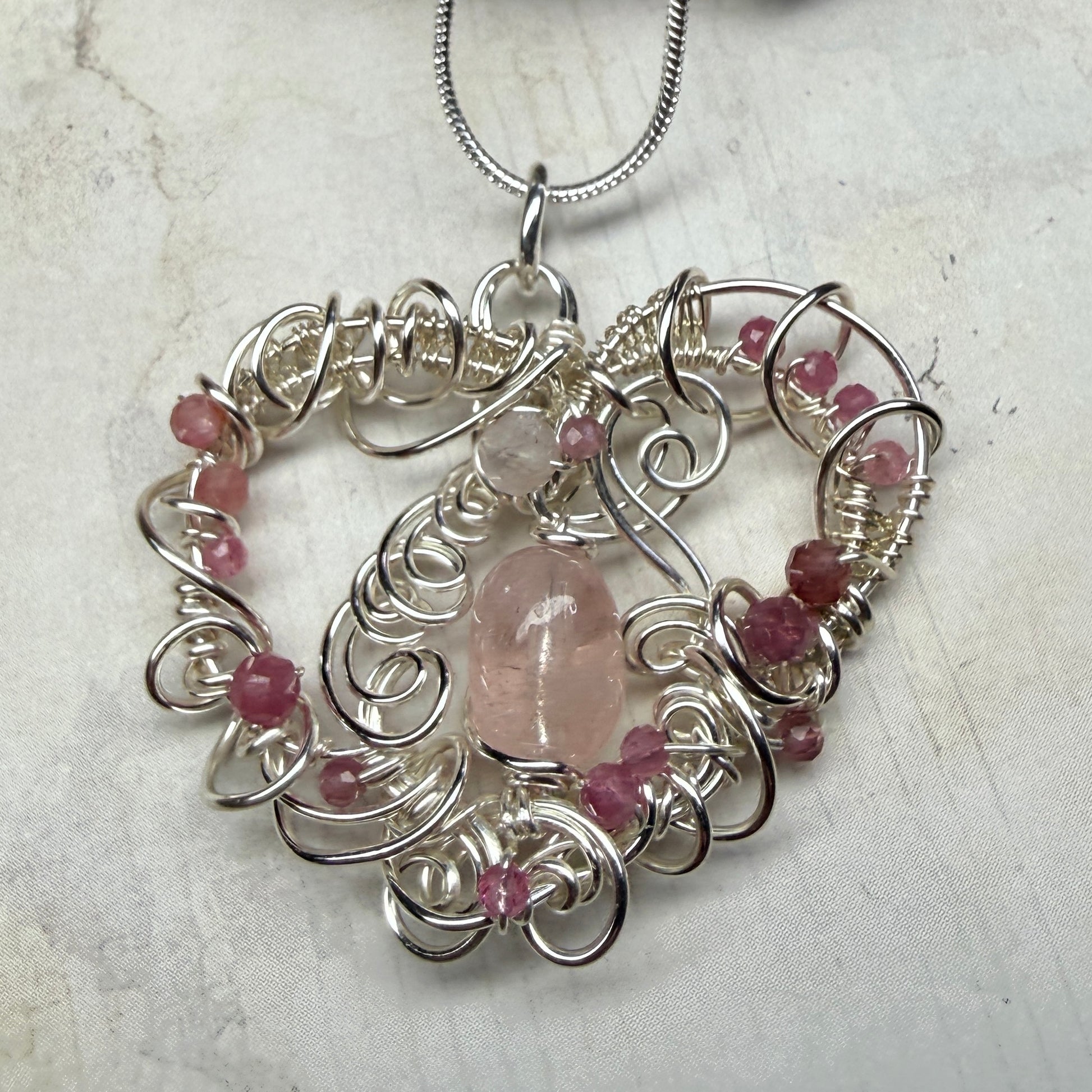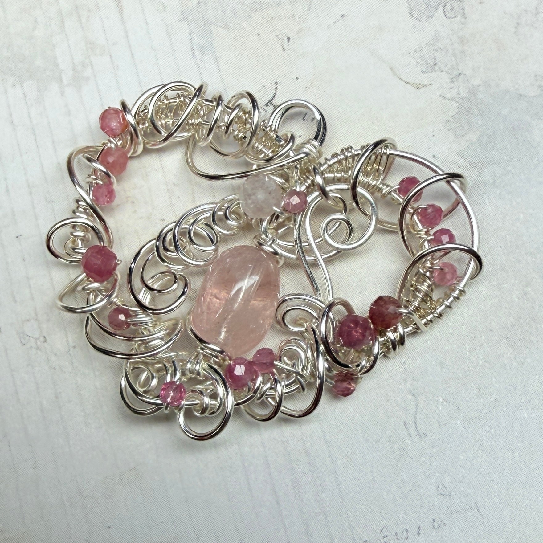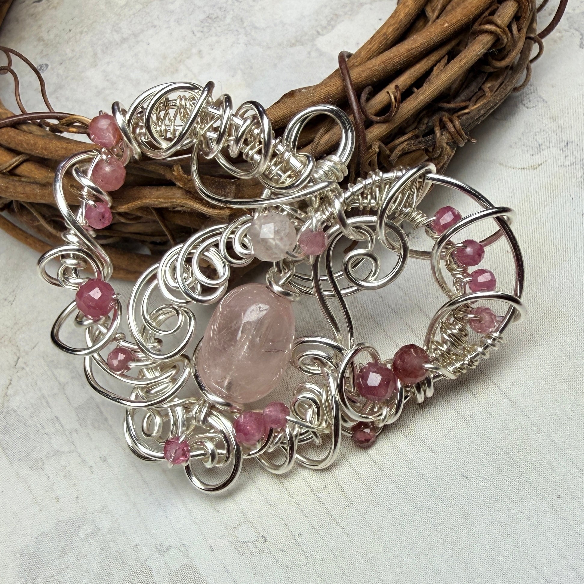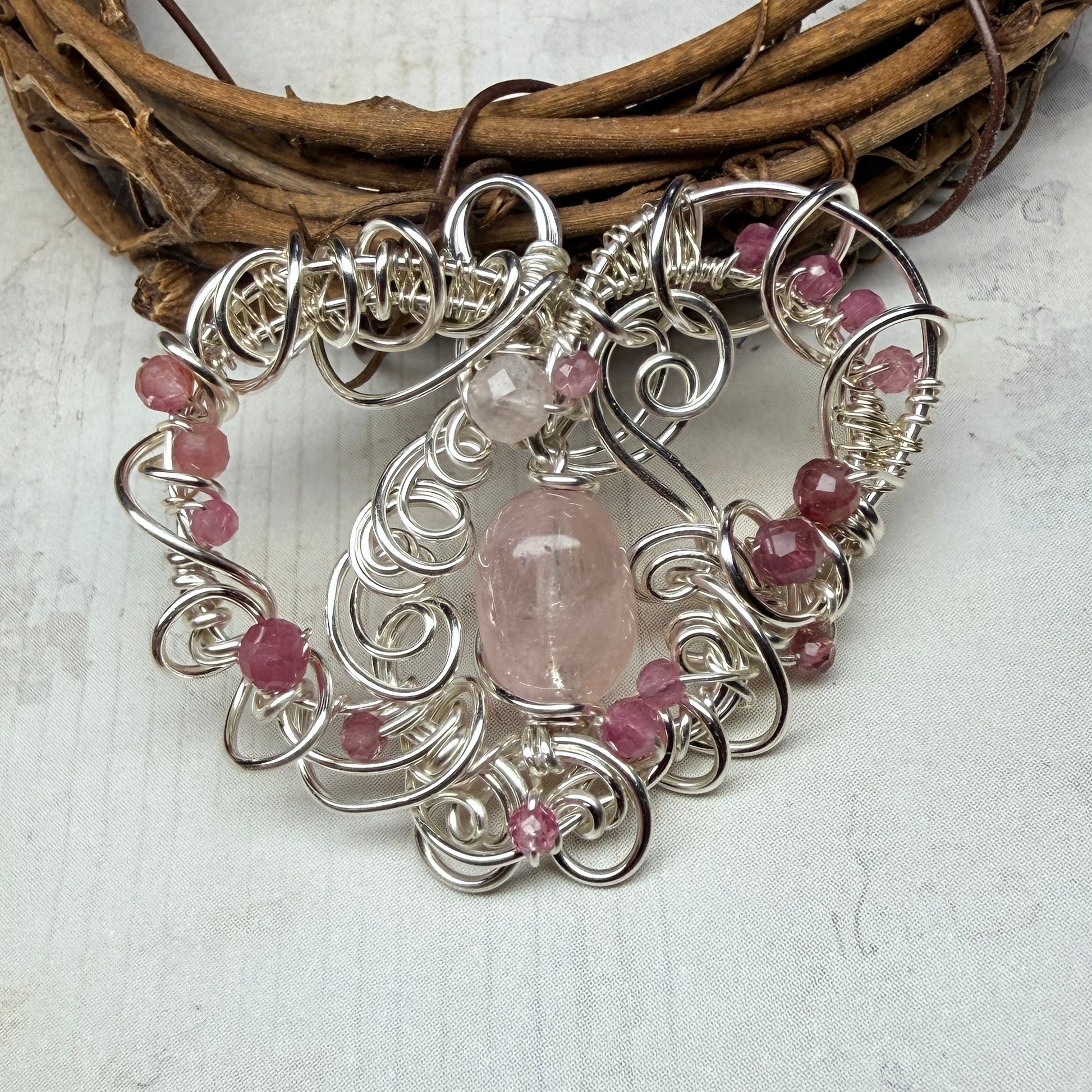 Morganite (a pink form of beryl, sometimes called pink aquamarine) in an elaborate frame of sculpted and woven wire, accented with pink tourmaline, pink sapphires, rose quartz, and rhodochrosite in clear quartz.