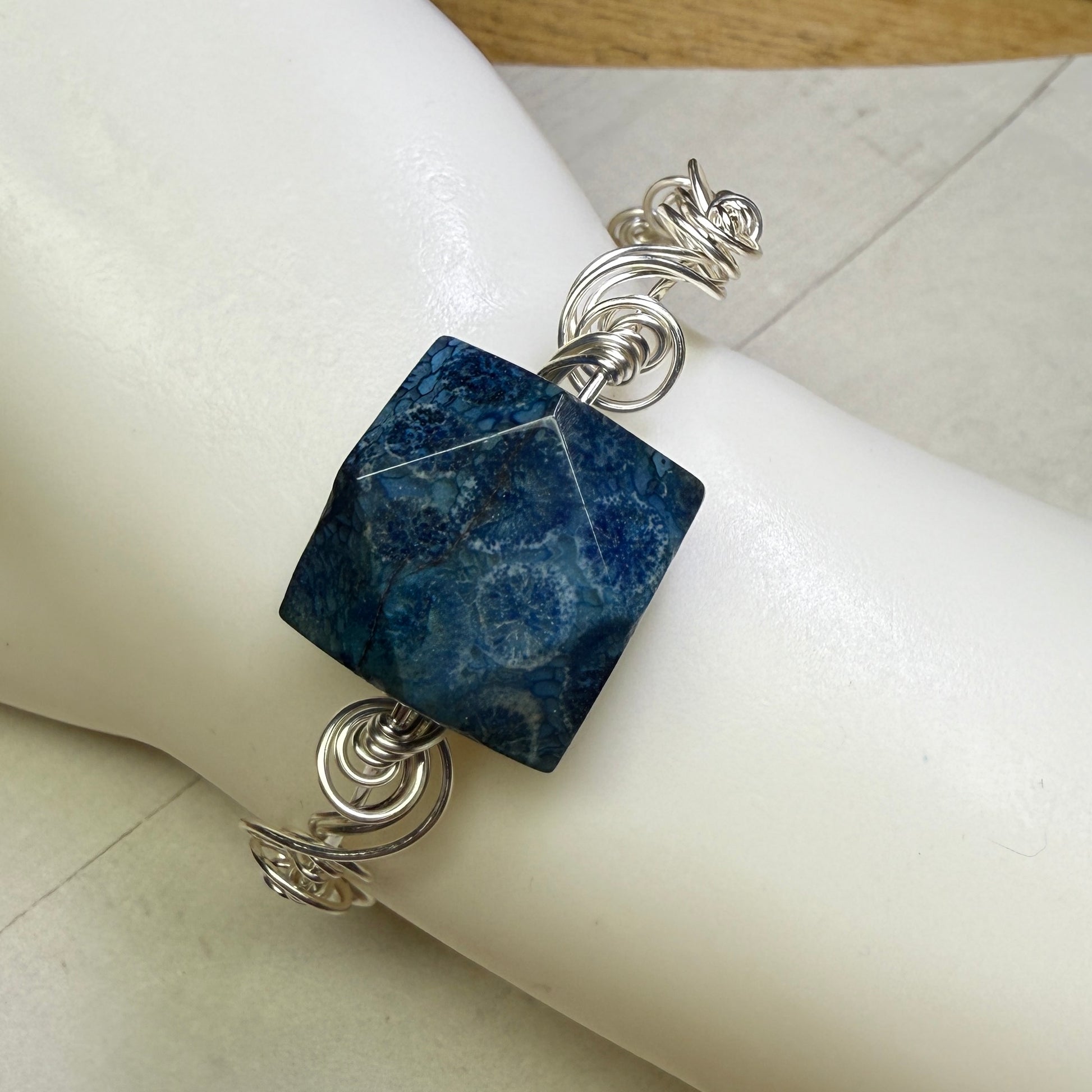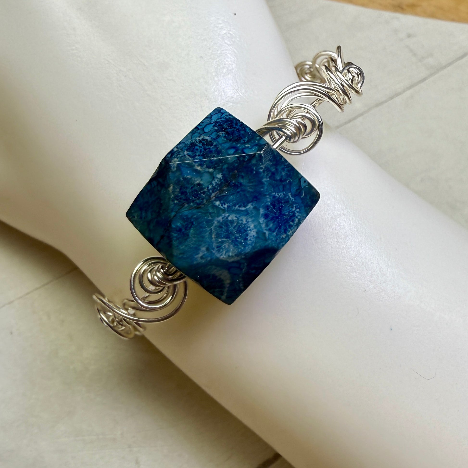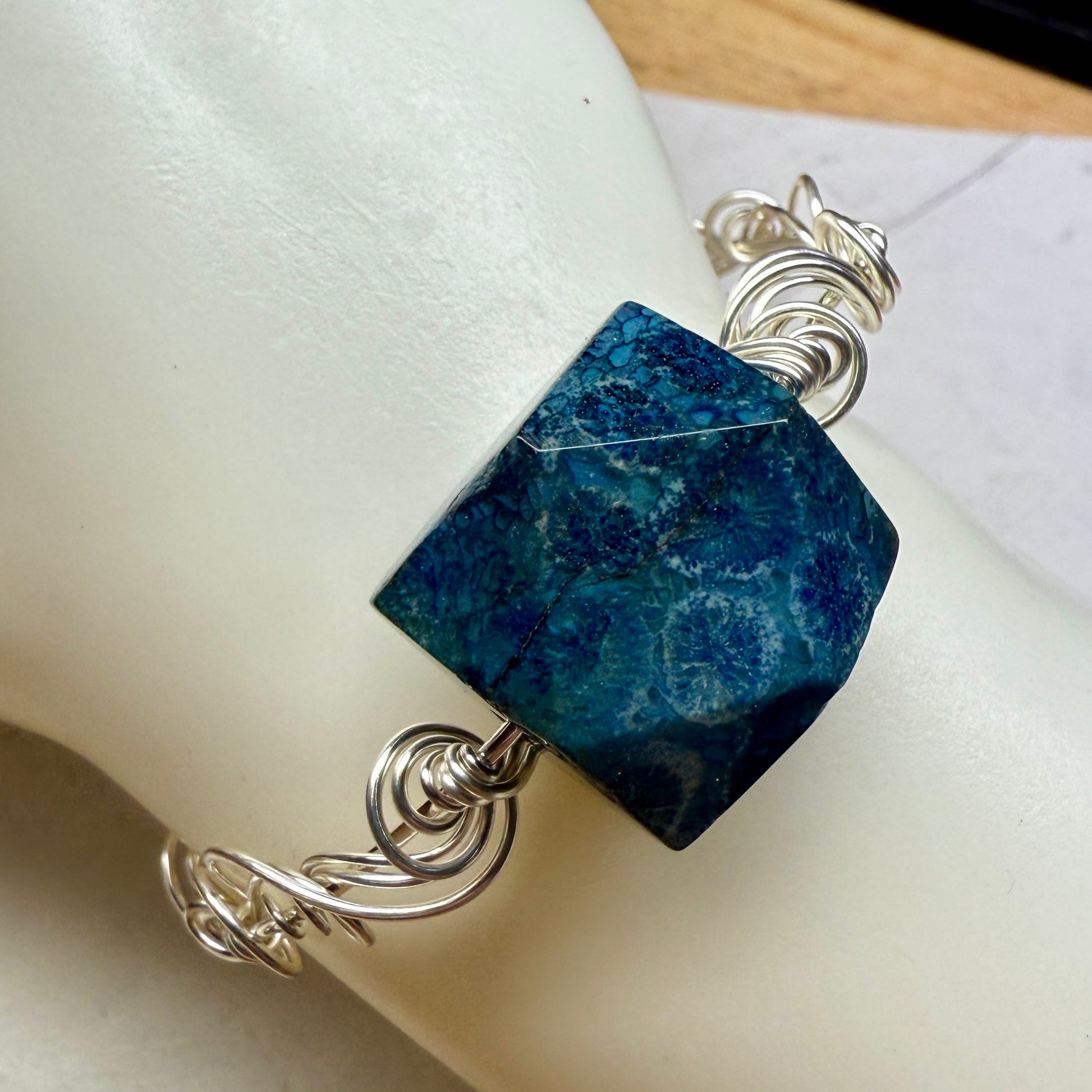 A bold chunk of color-treated fossilized coral on a narrow band of swirling sculpted wire.