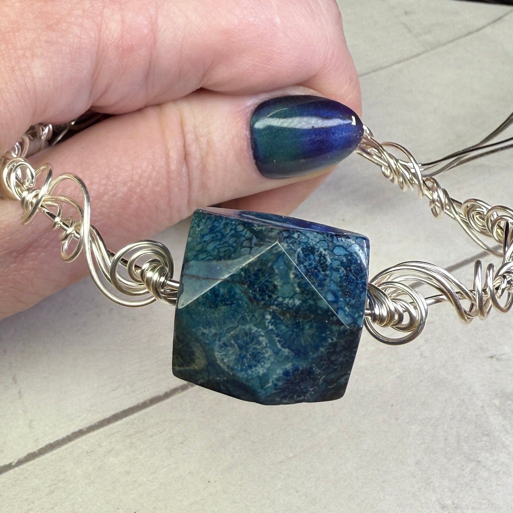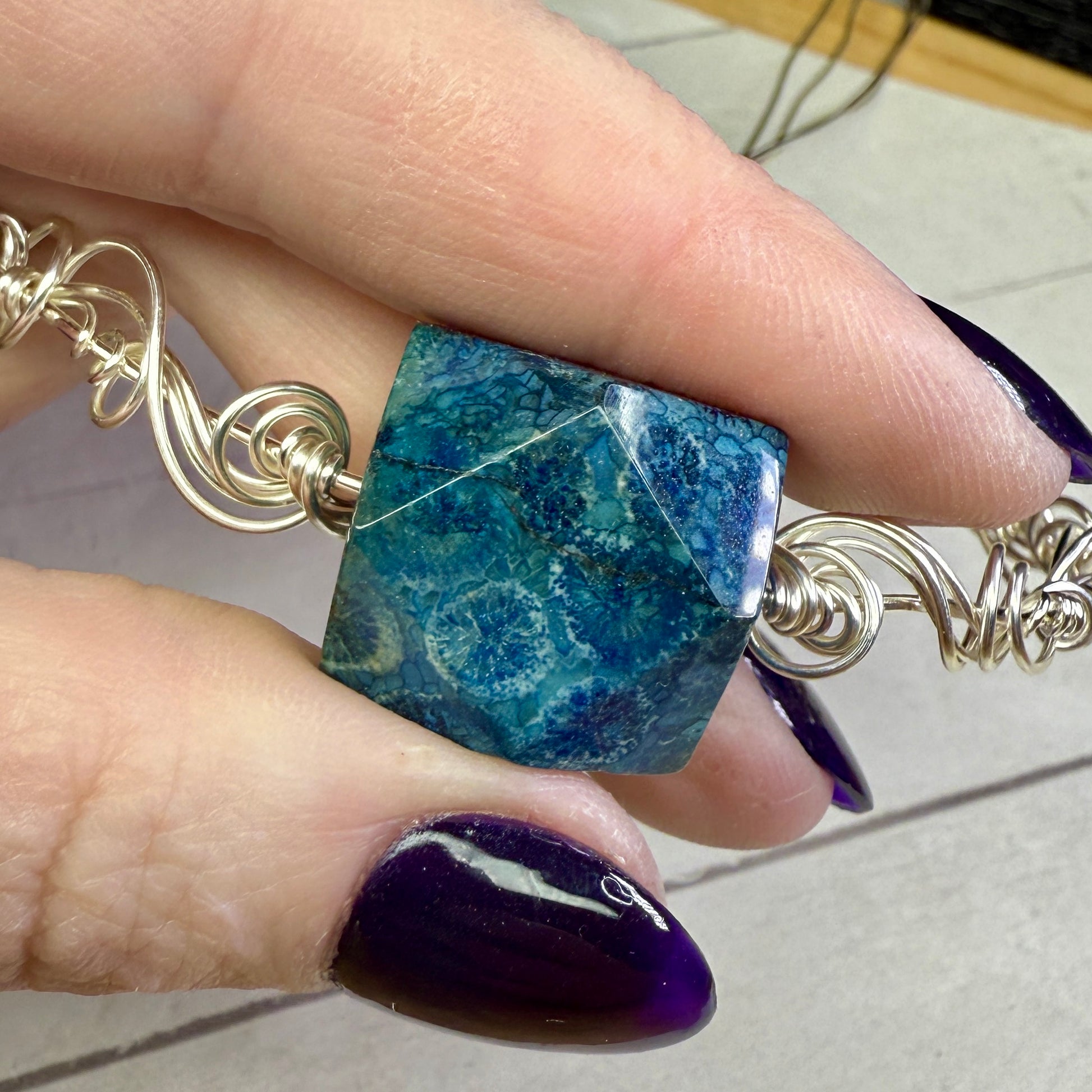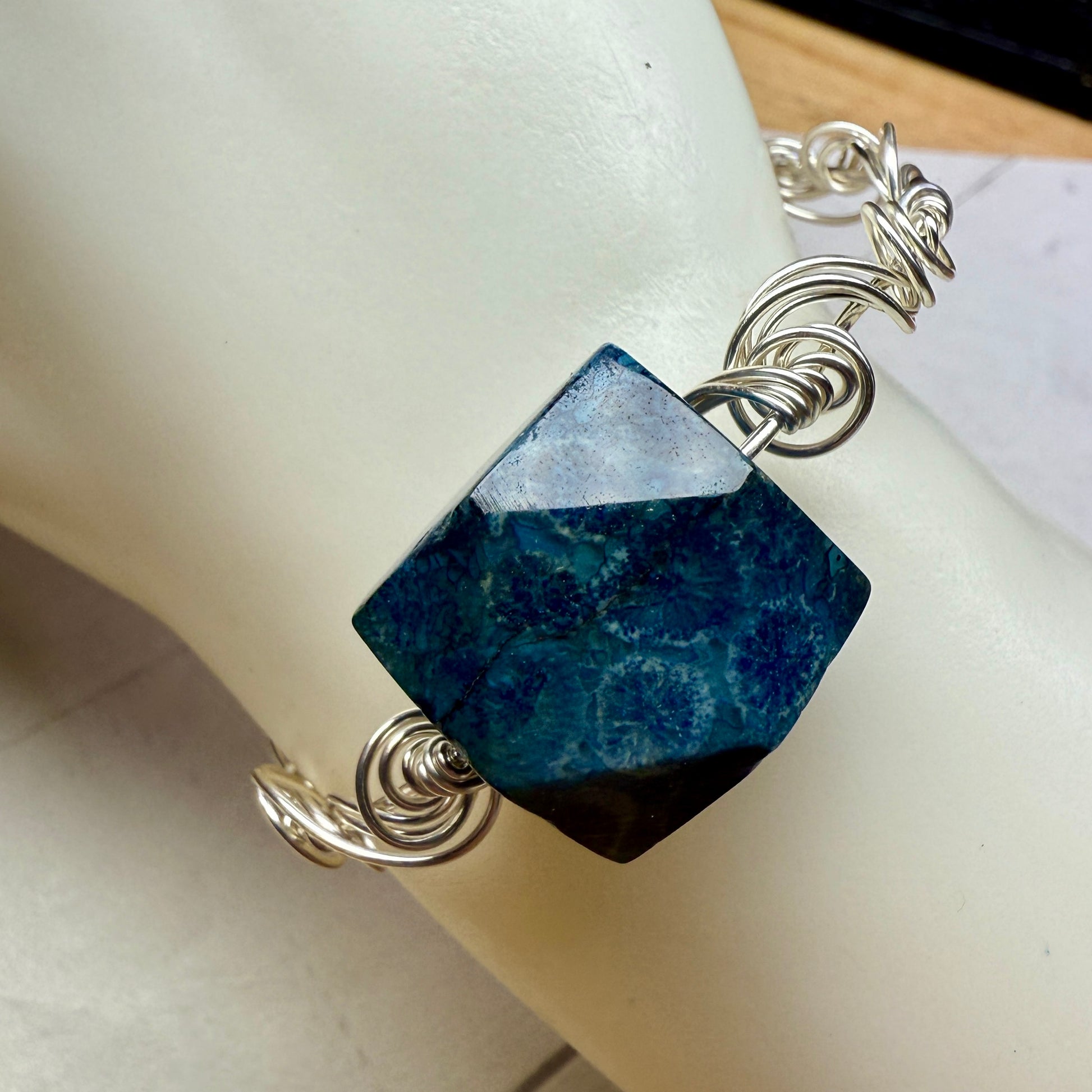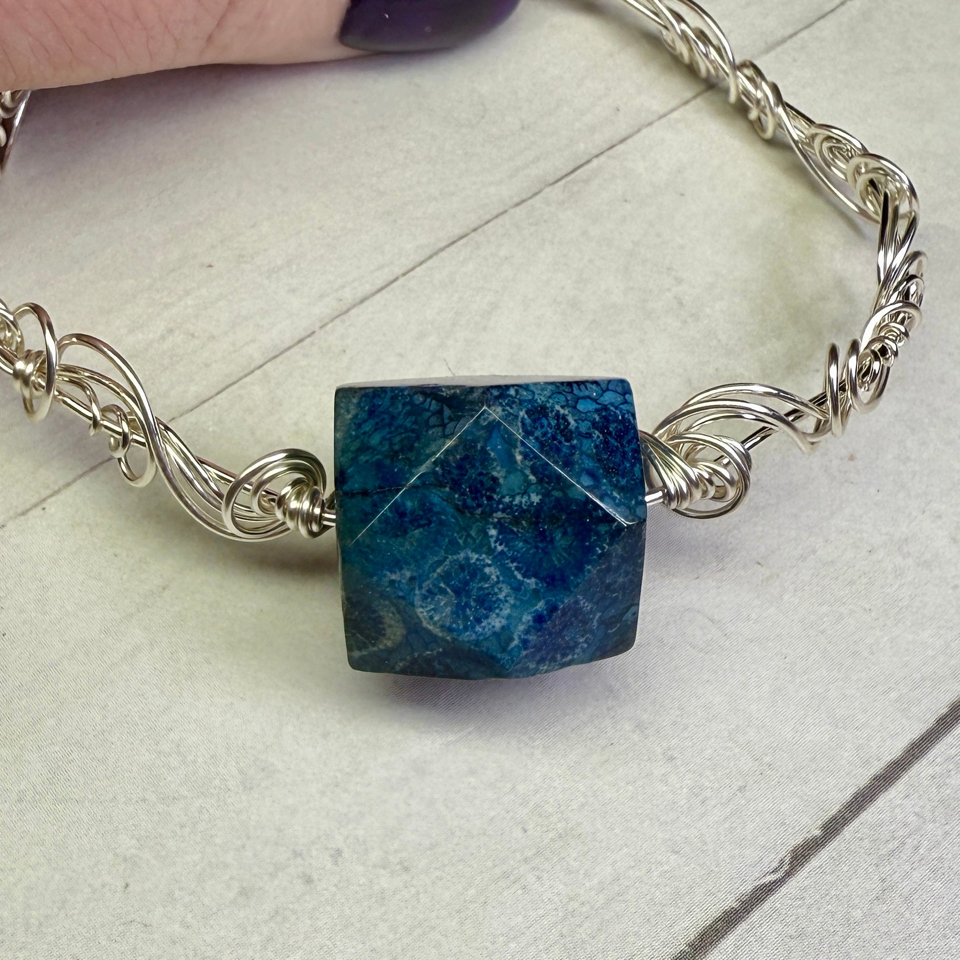 A bold chunk of color-treated fossilized coral on a narrow band of swirling sculpted wire.