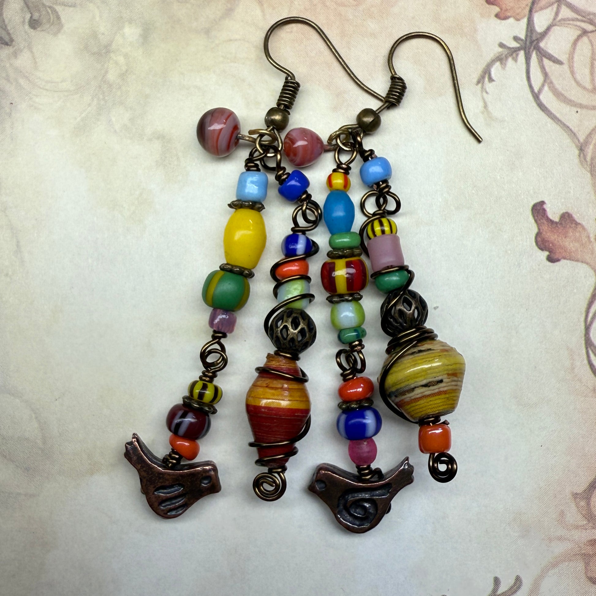 Small copper birds handmade in Mykonos in Greece, with vintage paper beads (probably 1970s) and African glass beads (age unknown, but definitely vintage at the very least) and some neat salvaged lampwork glass beads that were shaped directly onto brass wire (the swirly orange ones at the very top.) Lots of motion in these!