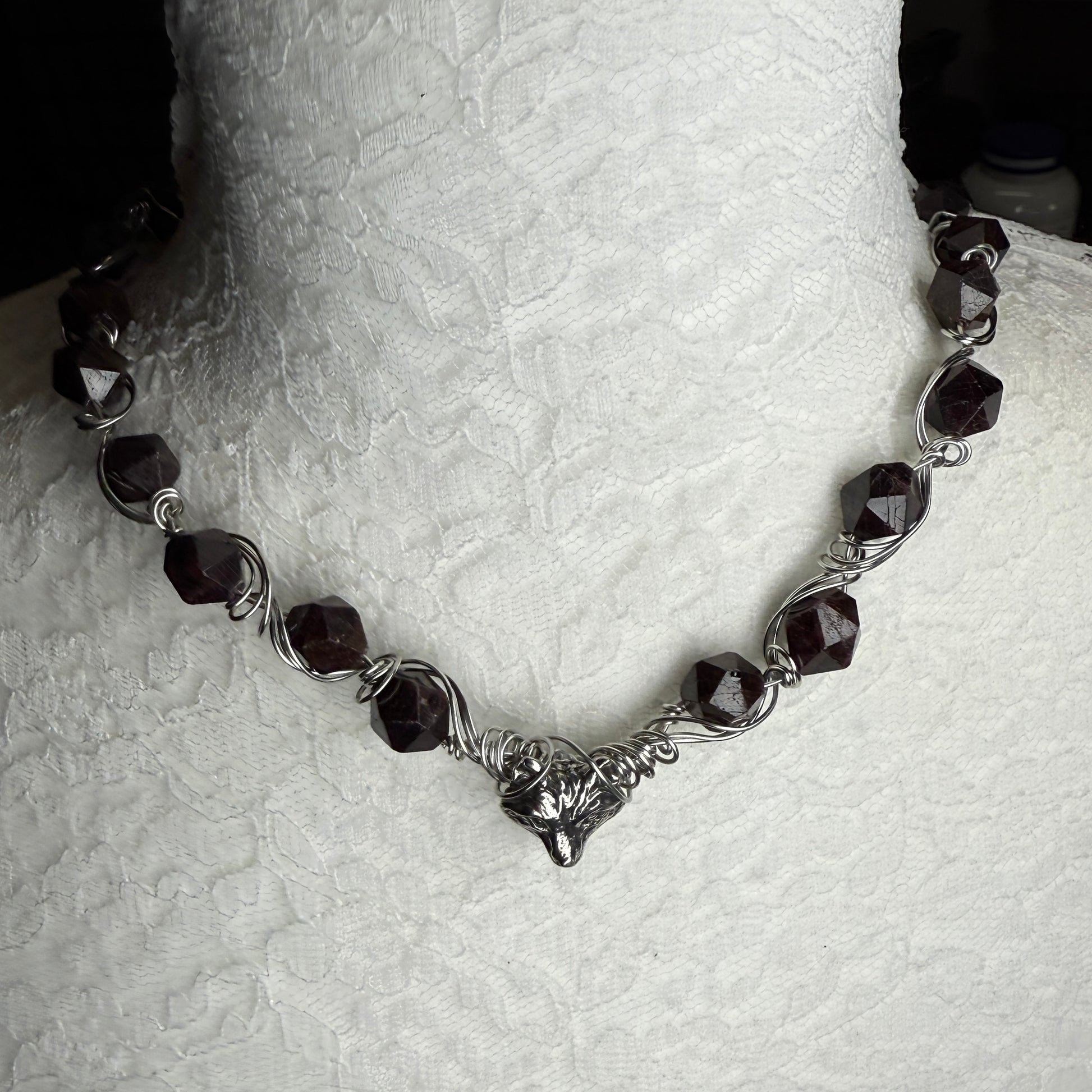 An adorable Green Girl Studios fox bead and chunky faceted garnets on antiqued silver wire.