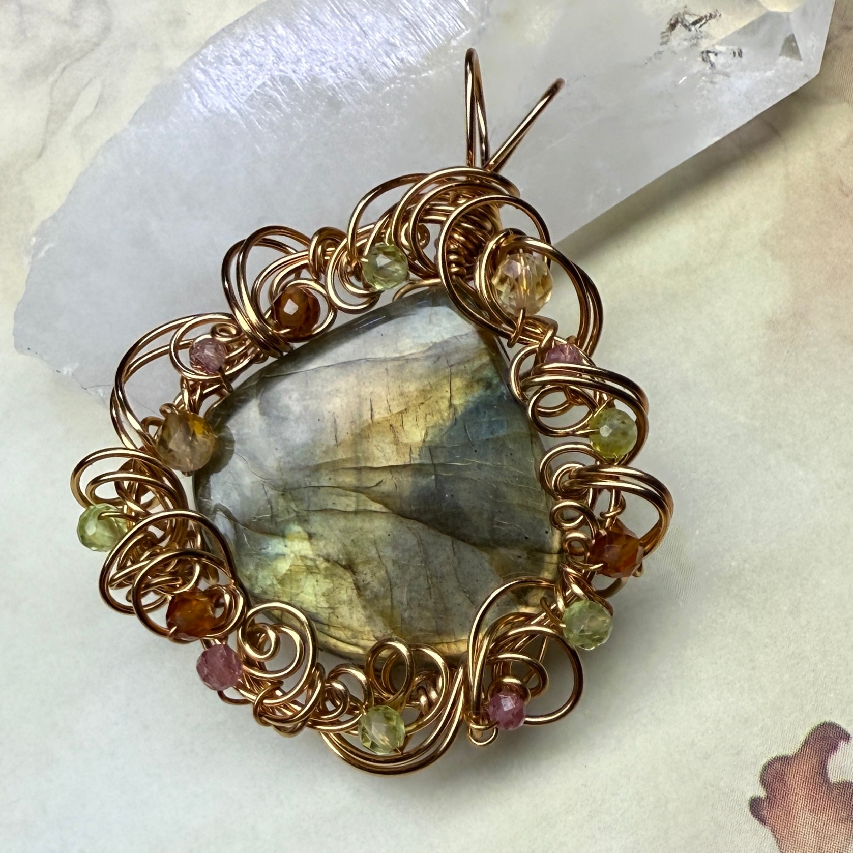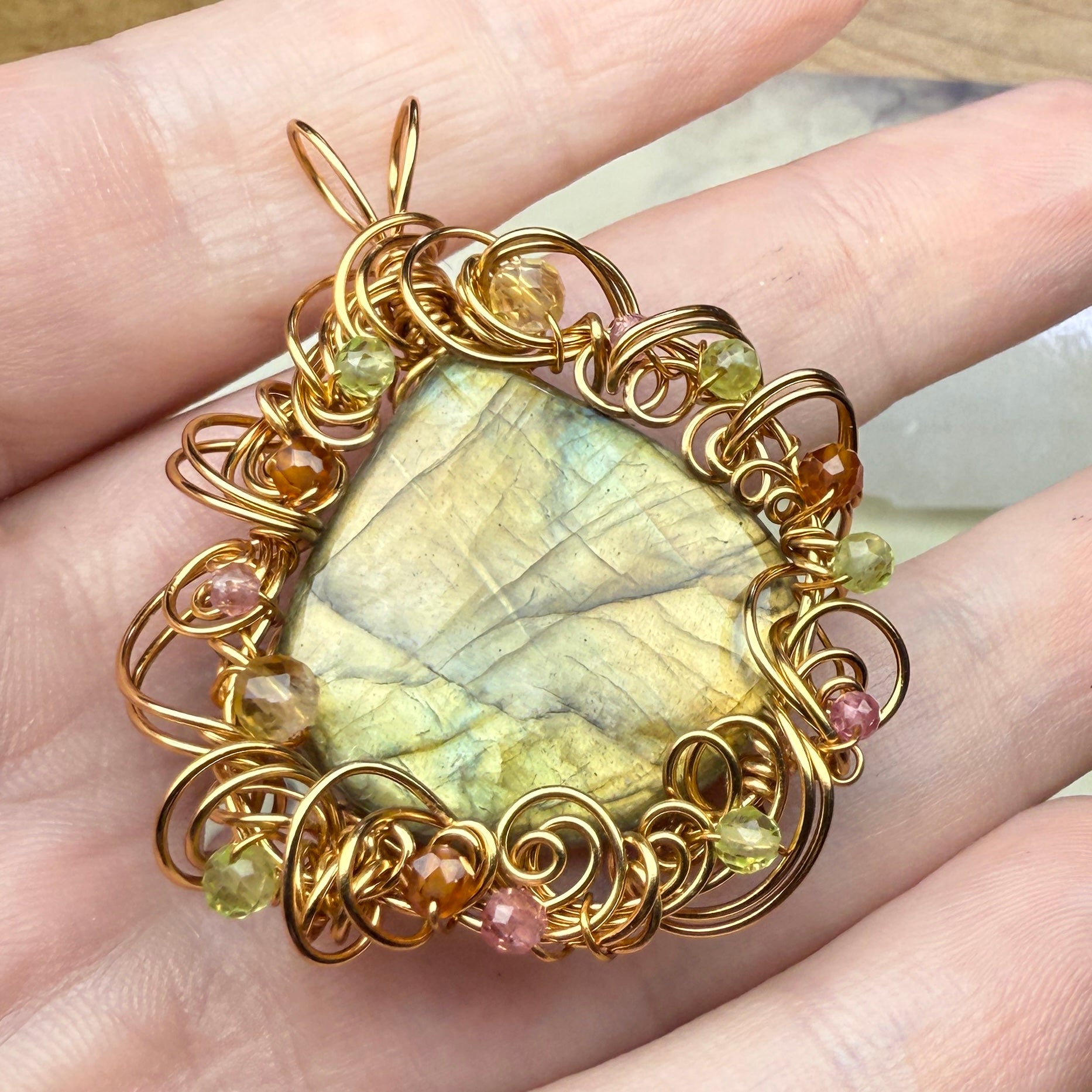 A large teardrop of labradorite with gold and green flash, set in harvest gold wire with peridot, pink tourmaline, hessonite, and citrine. One of a kind. There’s a really pretty little rainbow hiding in it too.