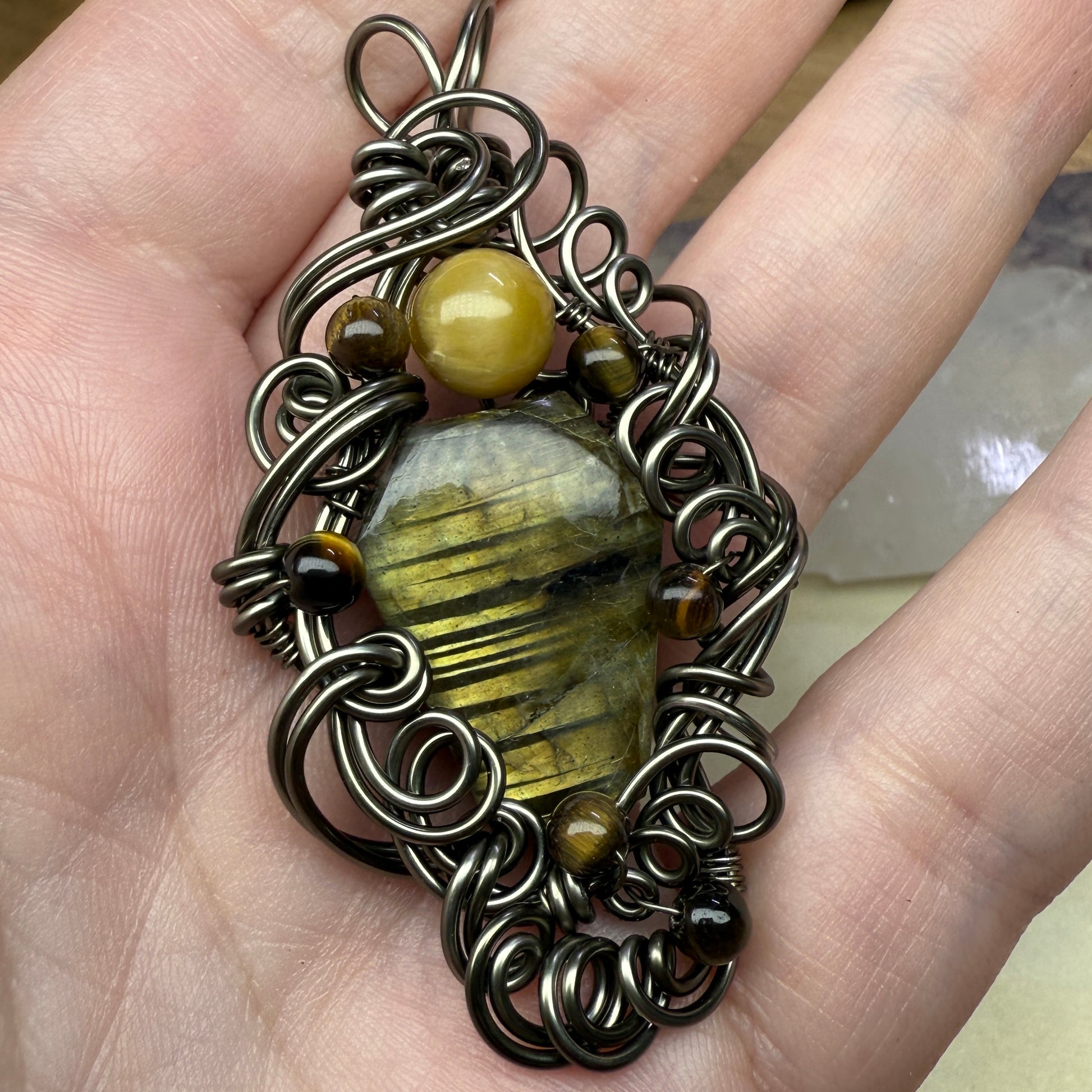 A really unusual coffin-shaped piece of labradorite with green and gold striped flash, set in dark antiqued silver wire with two colors of tigerseye. One of a kind.