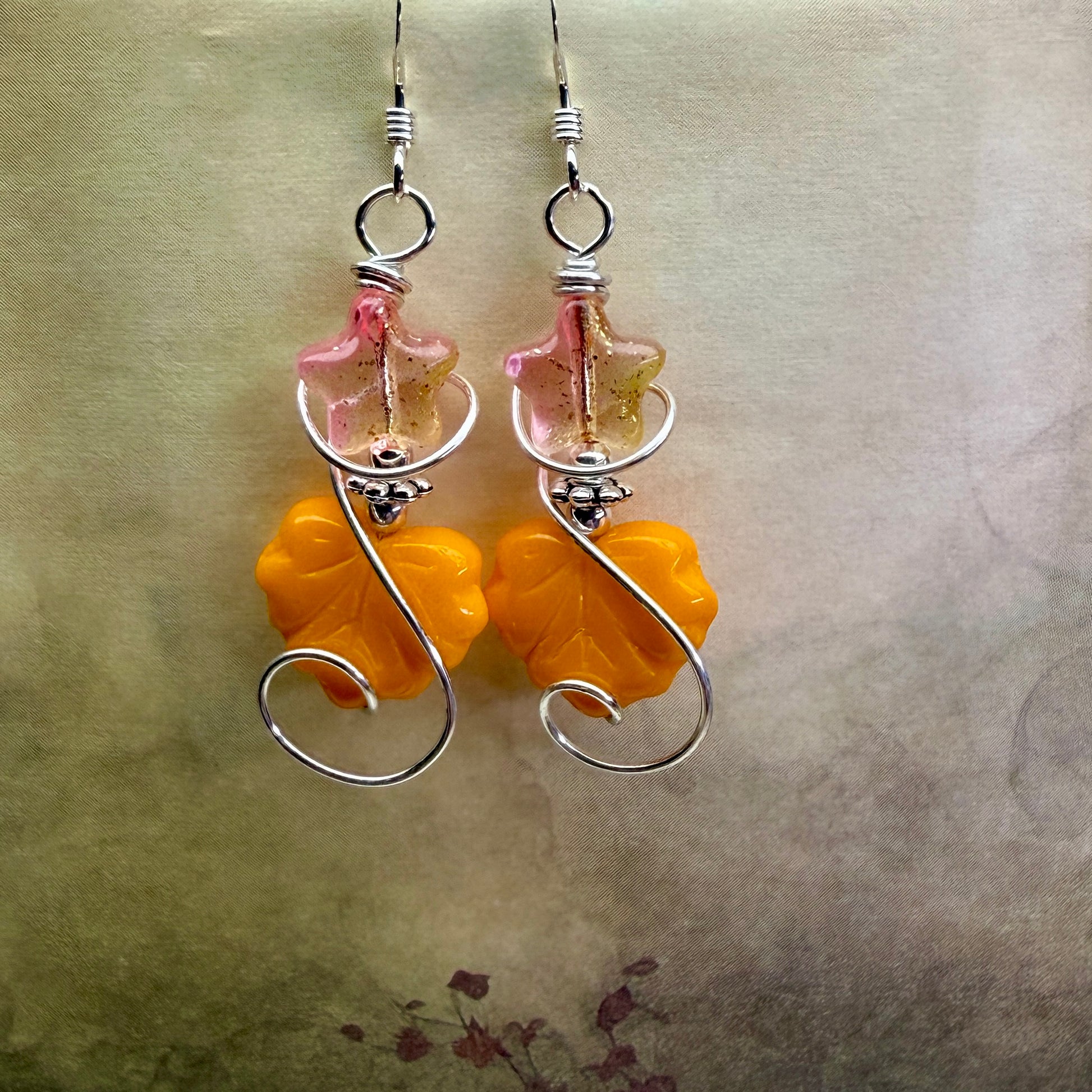 Bright orange glass leaves and sparkly peachy-pink and gold glass stars in swirly wire - shown in silver but these are made to order and I am happy to do them in gold or rose gold as well!