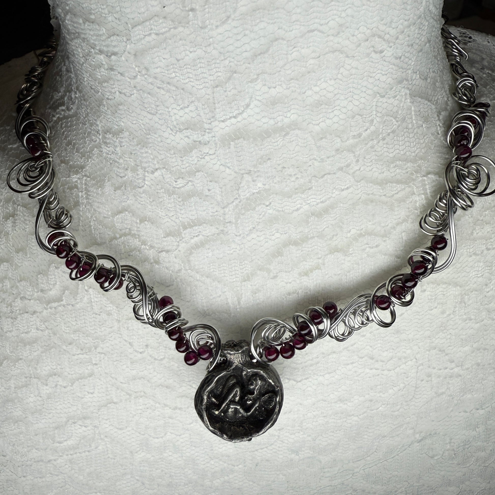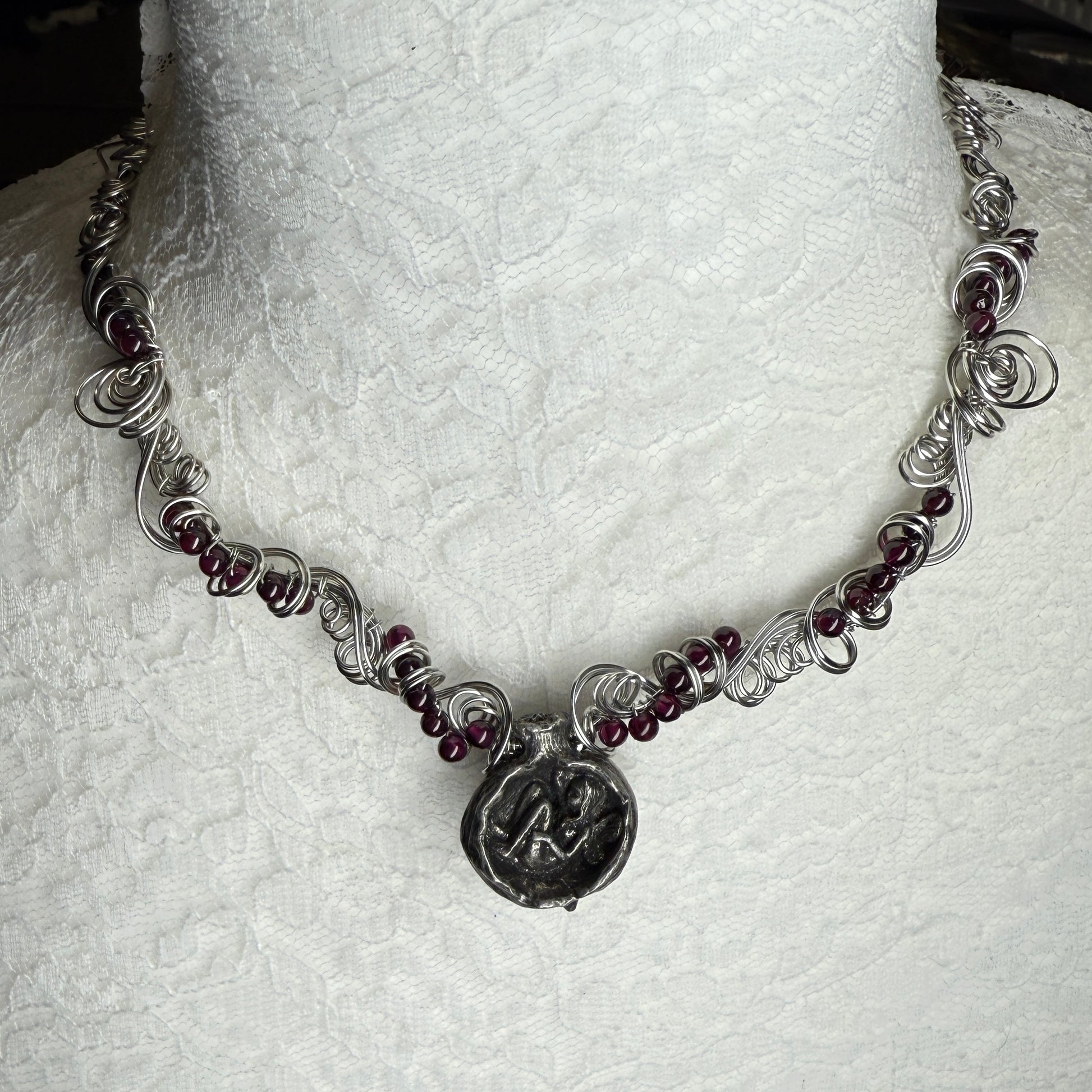 A pewter focal bead from Green Girl Studios of a fairy curled up for a nap inside a pomegranate (#goals, honestly) with many small garnet beads on antiqued silver wire