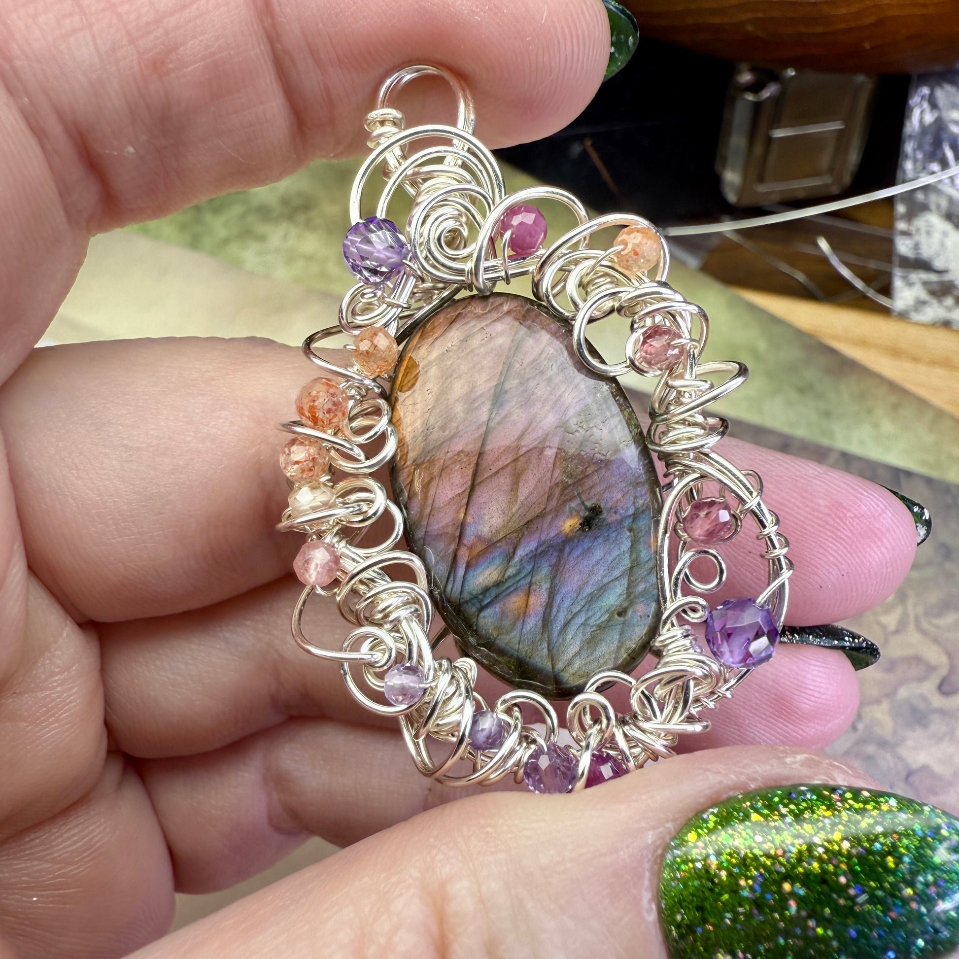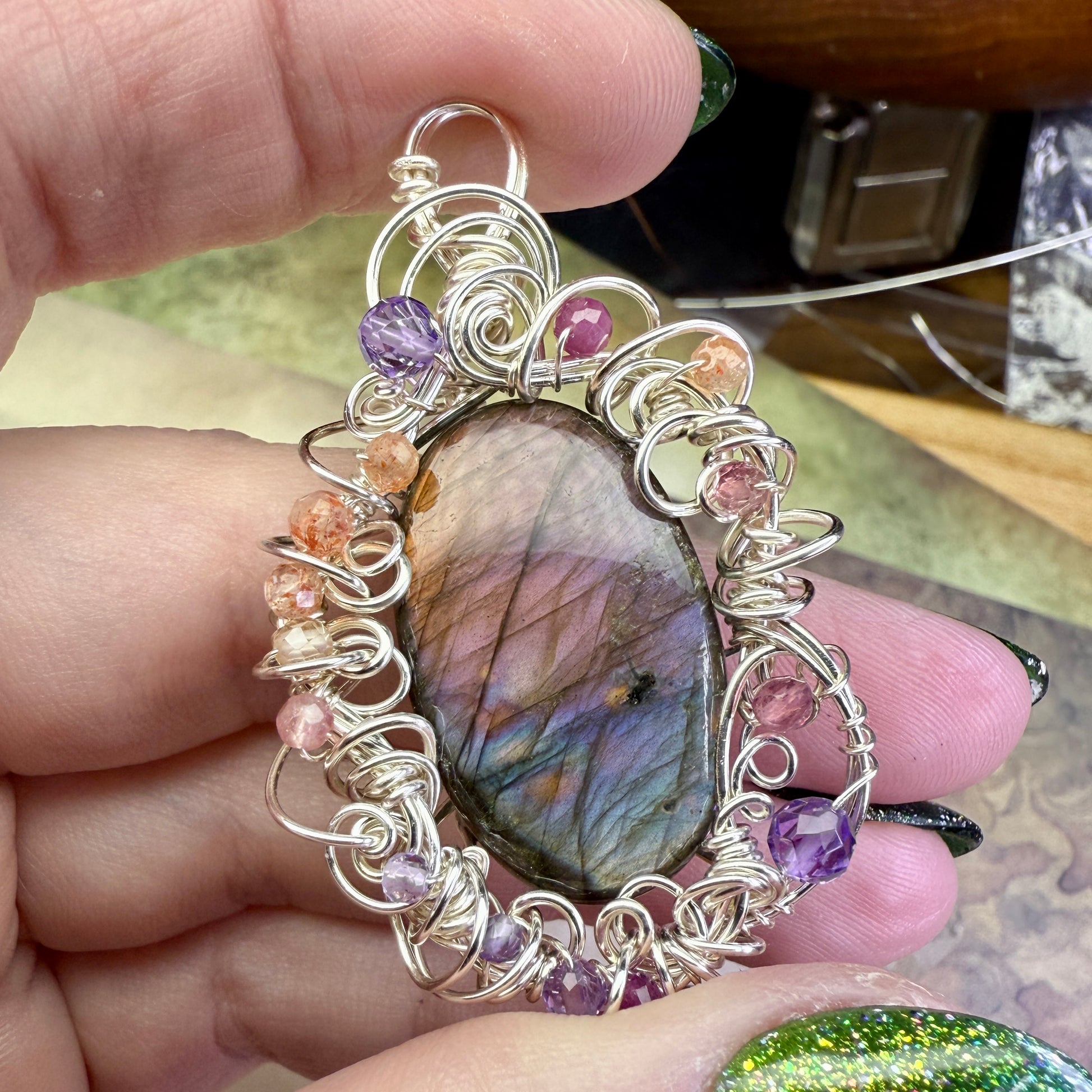 A stunning oval labradorite cabochon with purple and pink and blue flash, set in swirling wire with accents of amethyst, sunstone, pink tourmaline, fluorite, and zircon. One of a kind and absolutely gorgeous.