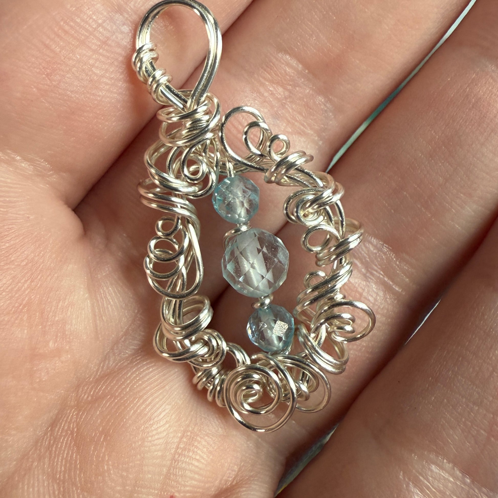 A simple little pendant of blue topaz - probably color-treated, but very pretty - and swirling wire.
