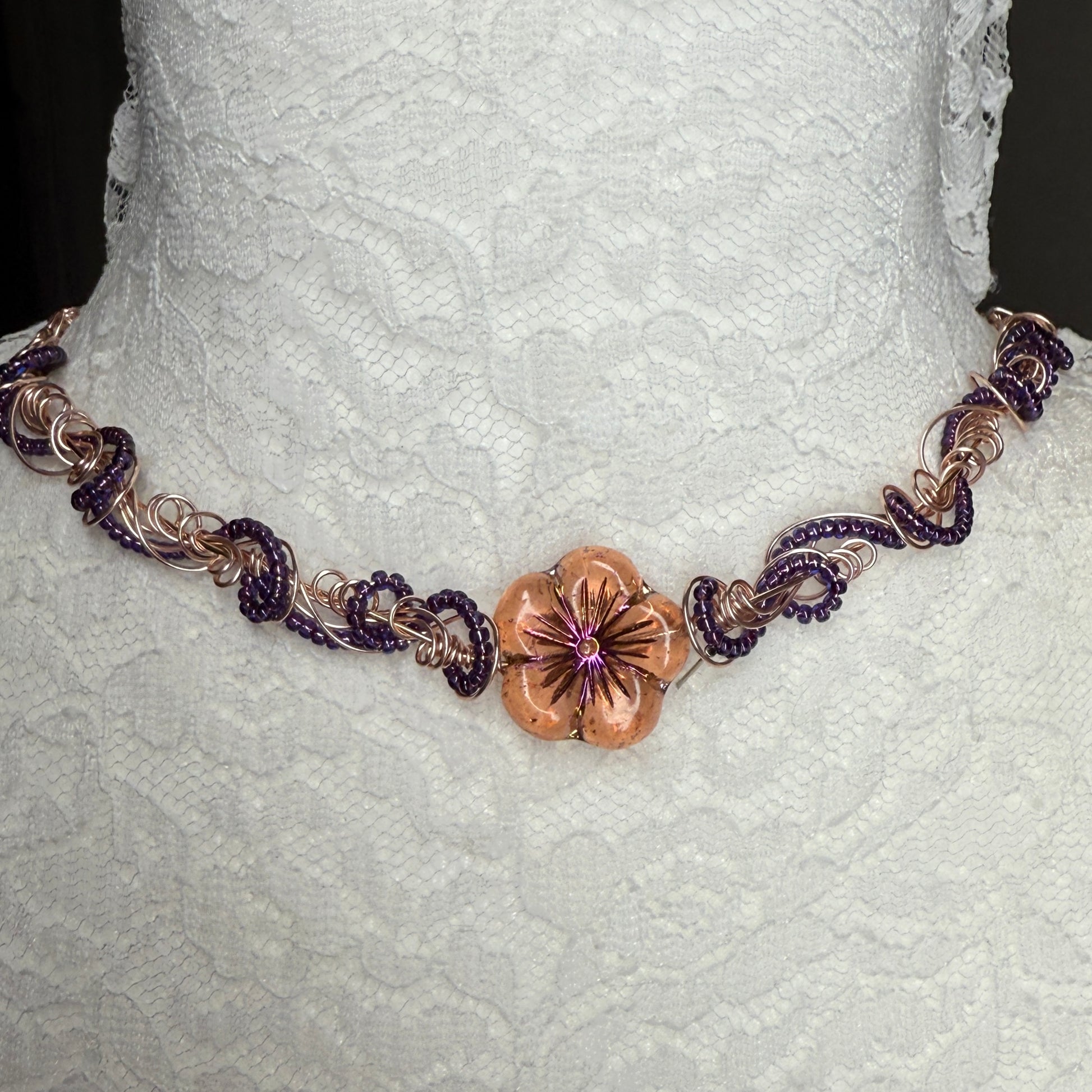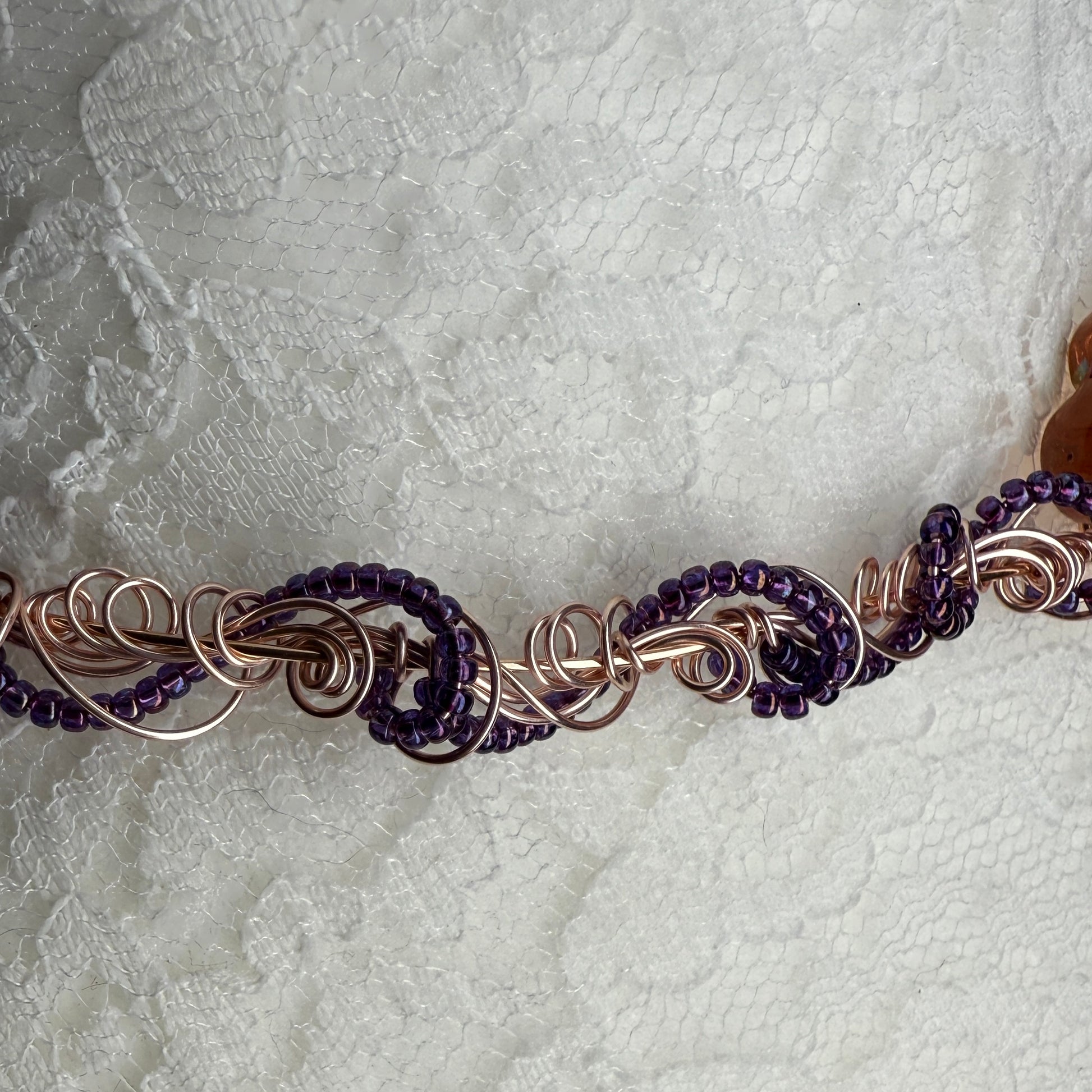 Czech pressed glass in a beautiful pinkish-orange shade with shimmery purple-gold wash, set into elaborate swirls of rose-gold copper with a strand of tiny seed beads woven through the wirework.