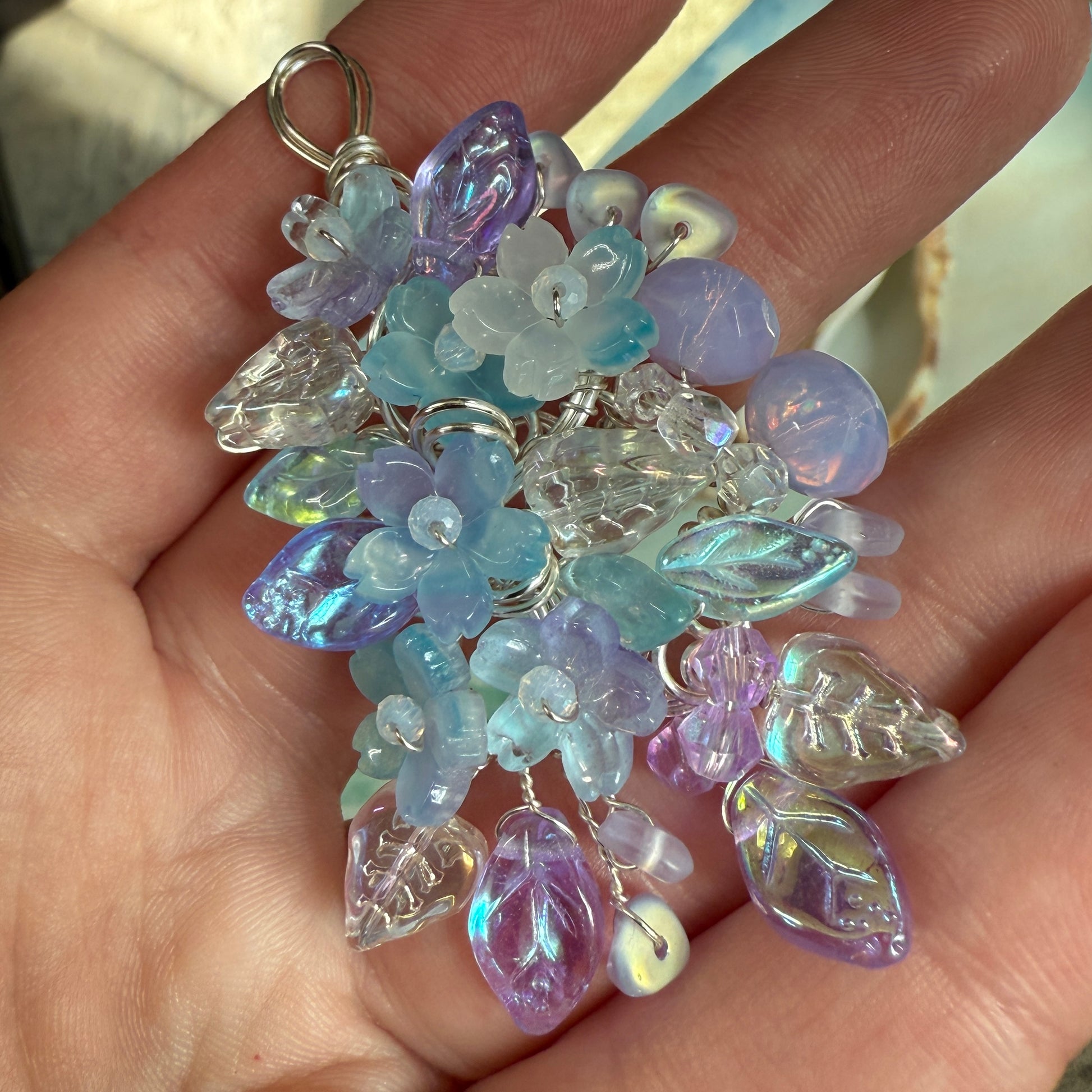 A large statement pendant made from densely clustered glass flowers and leaves and small glass beads in swirling wire. Some of the beads color-shift from purple to blue under different types of lighting.