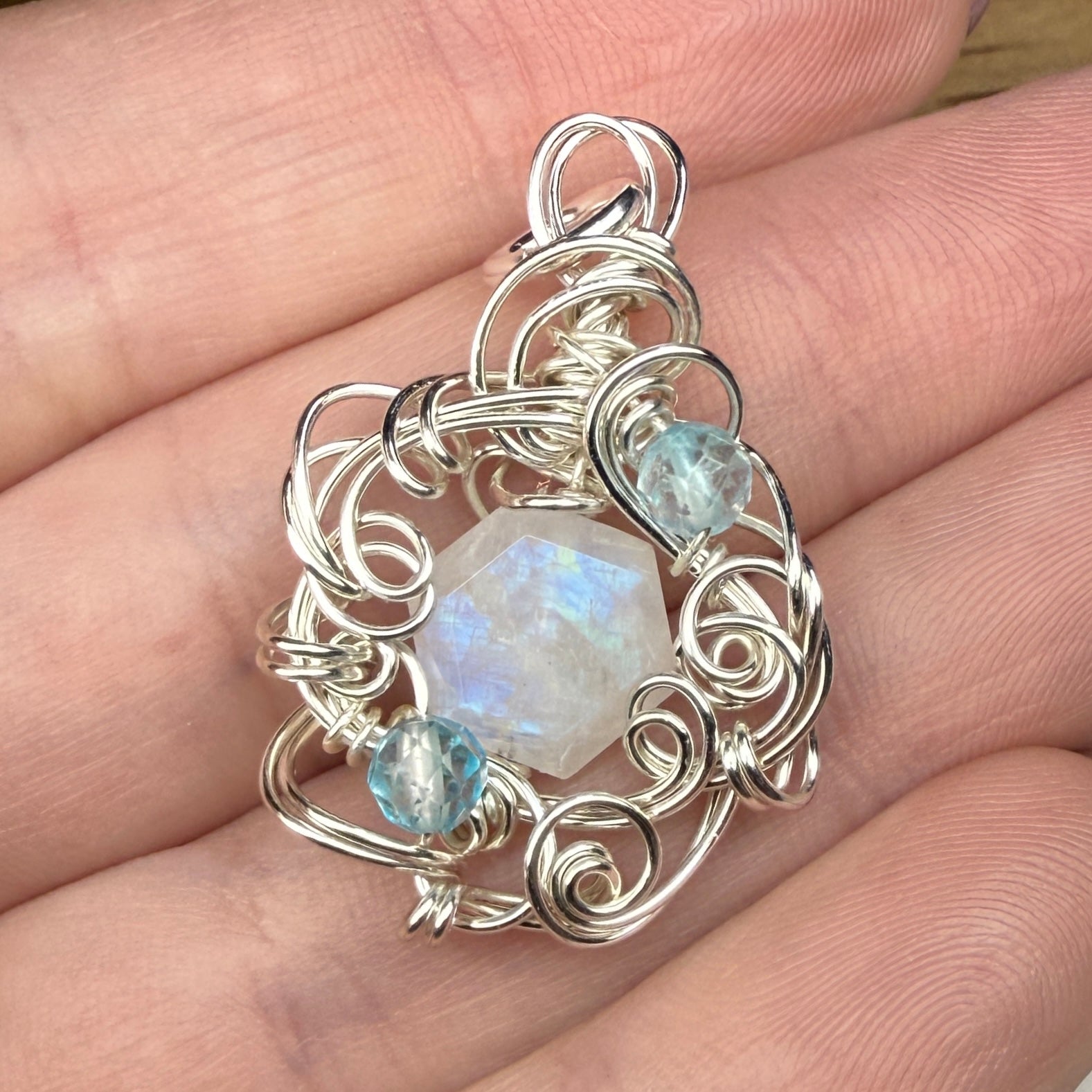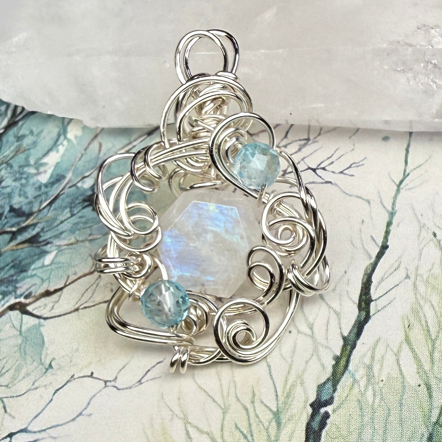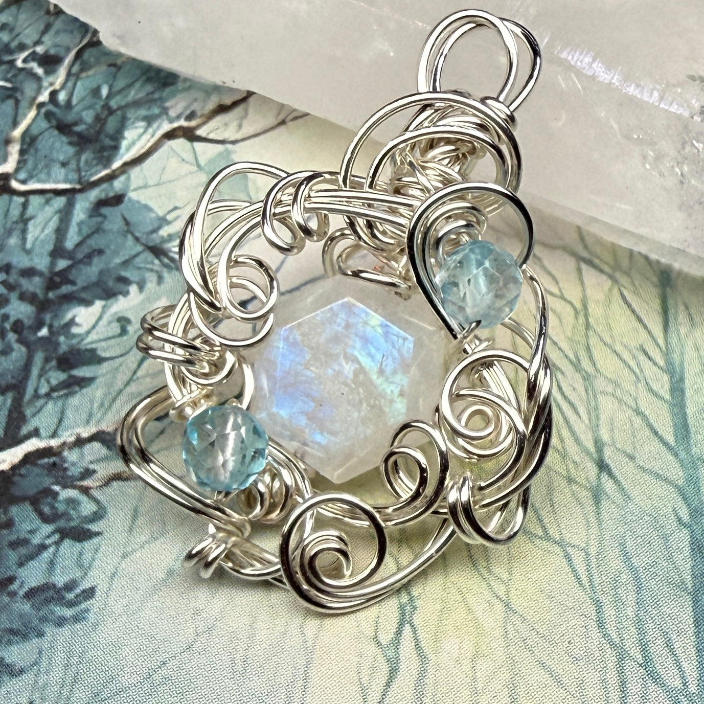 Rainbow moonstone and blue topaz in swirly silver wire. One of a kind.