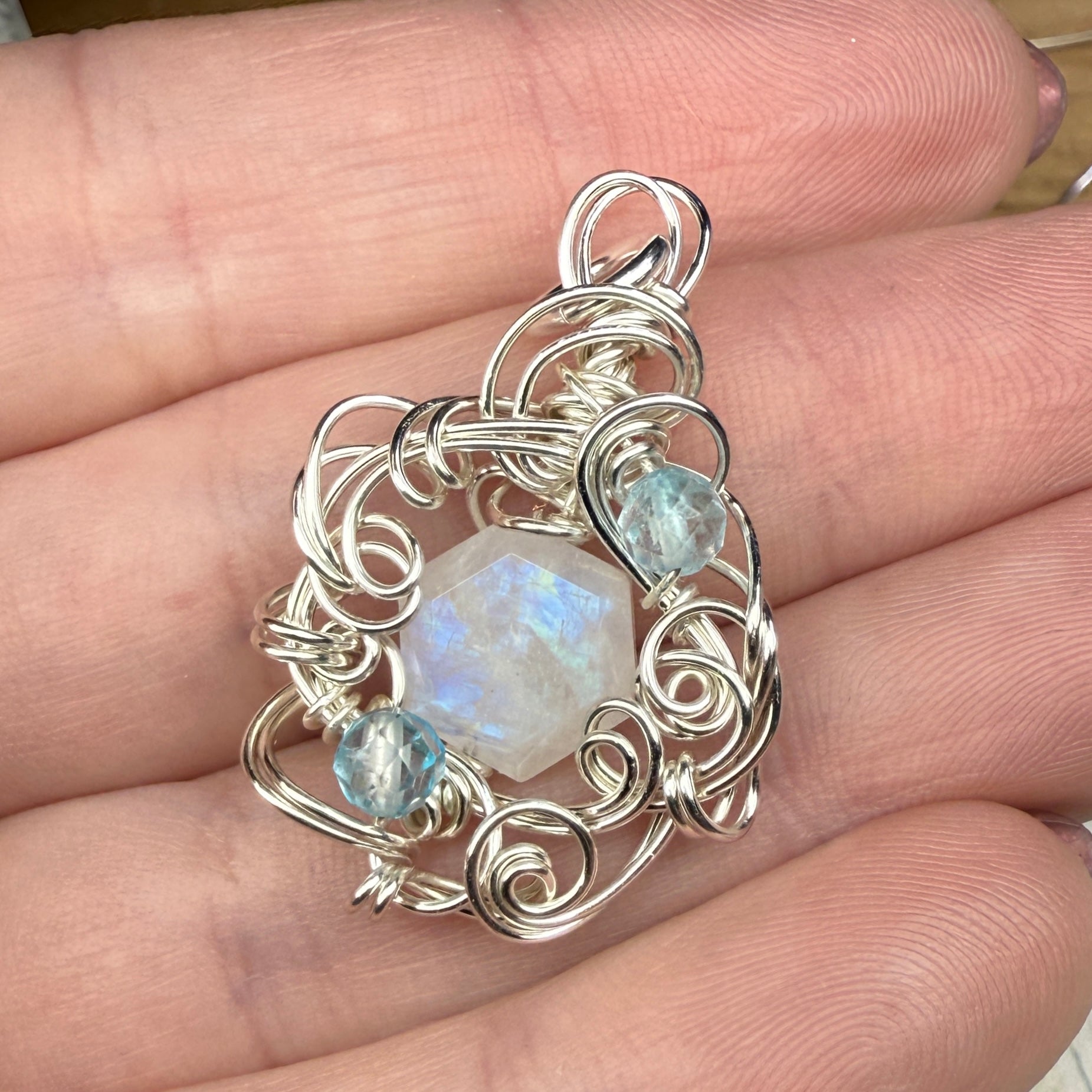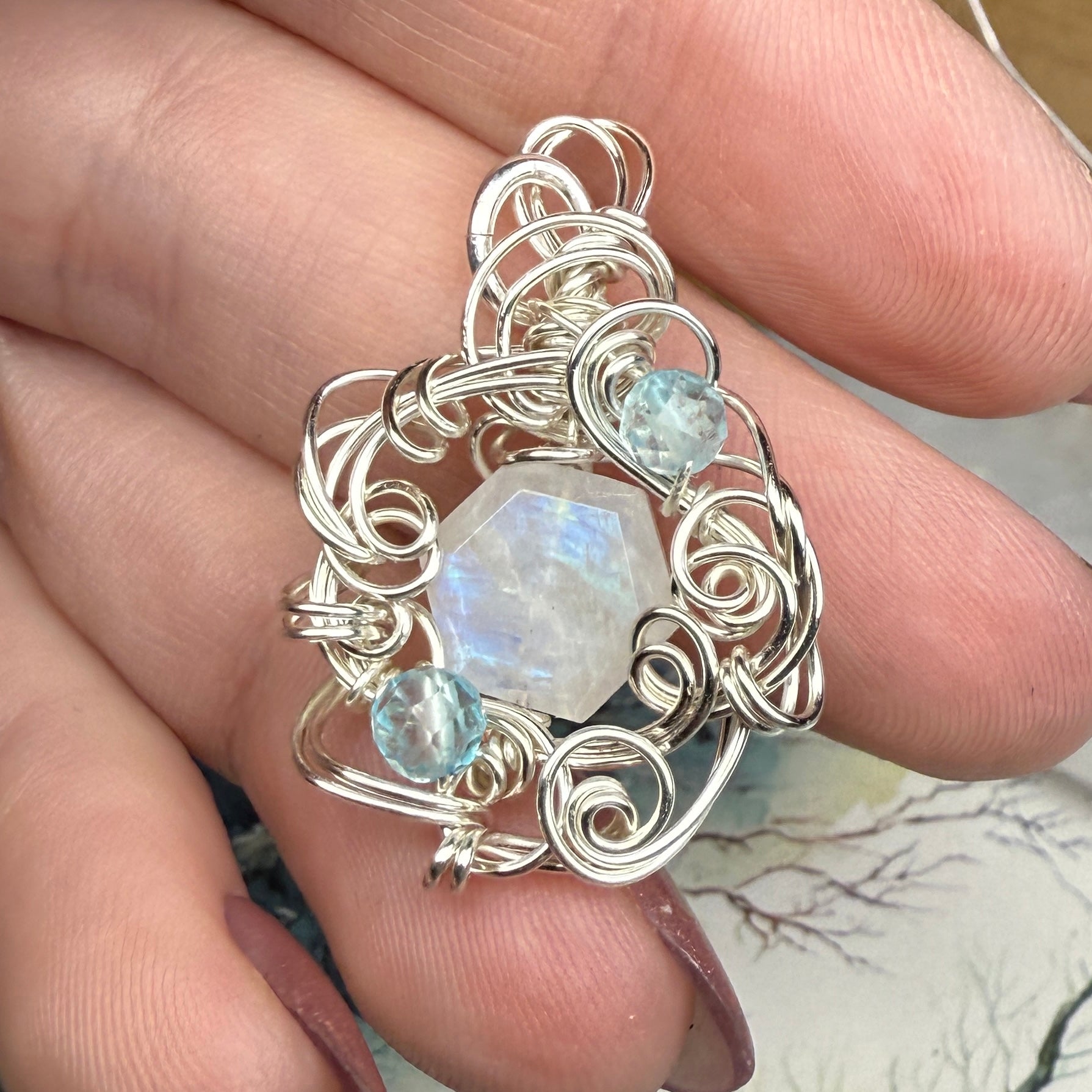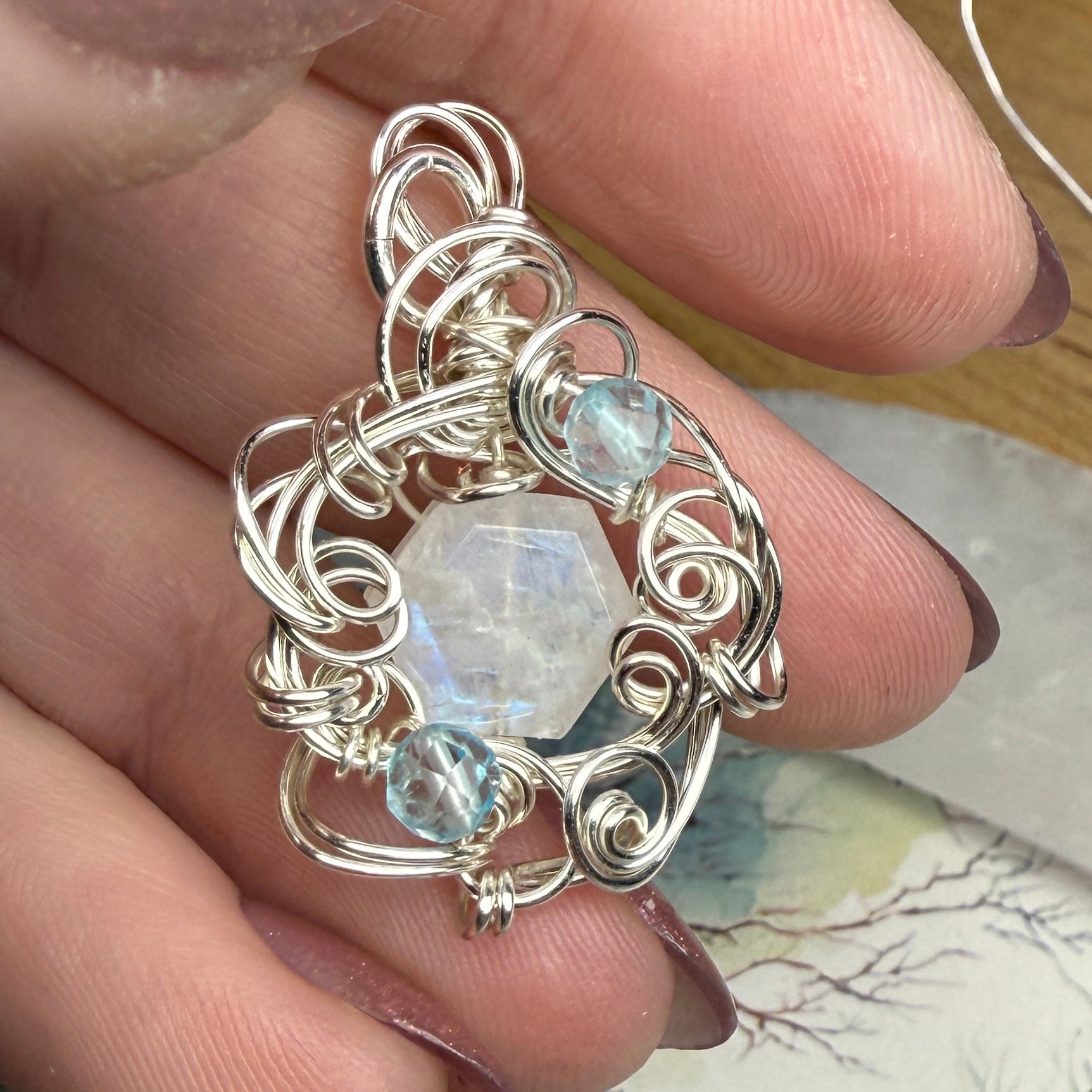 Rainbow moonstone and blue topaz in swirly silver wire. One of a kind.