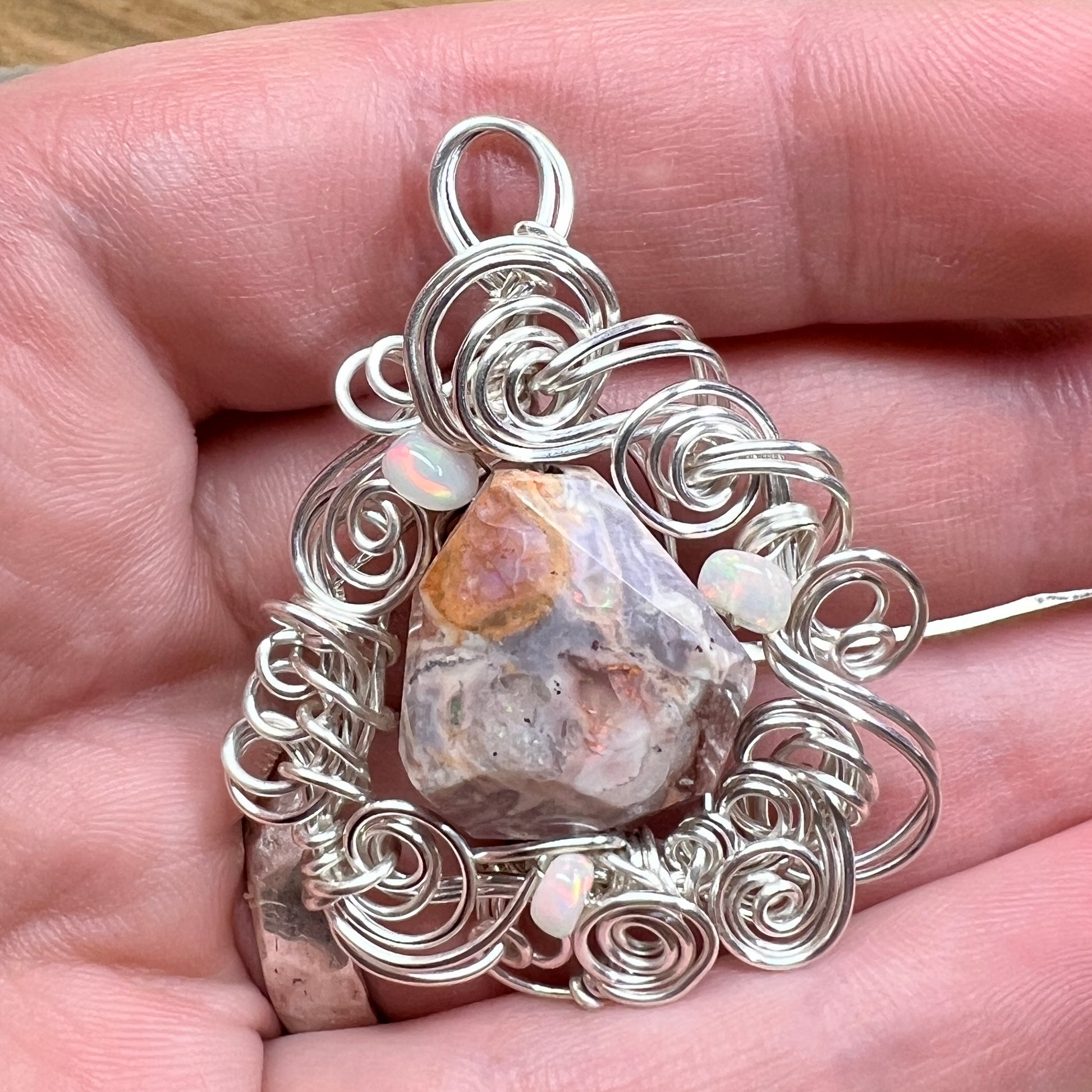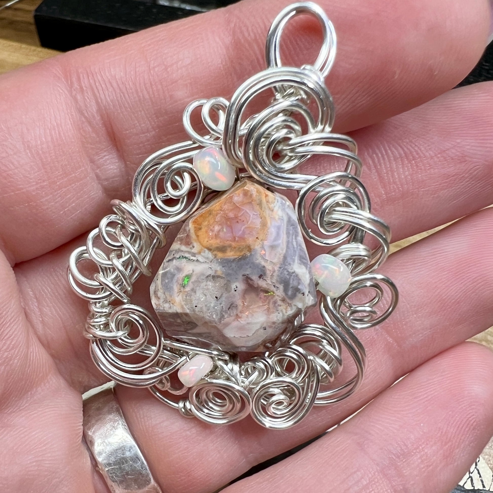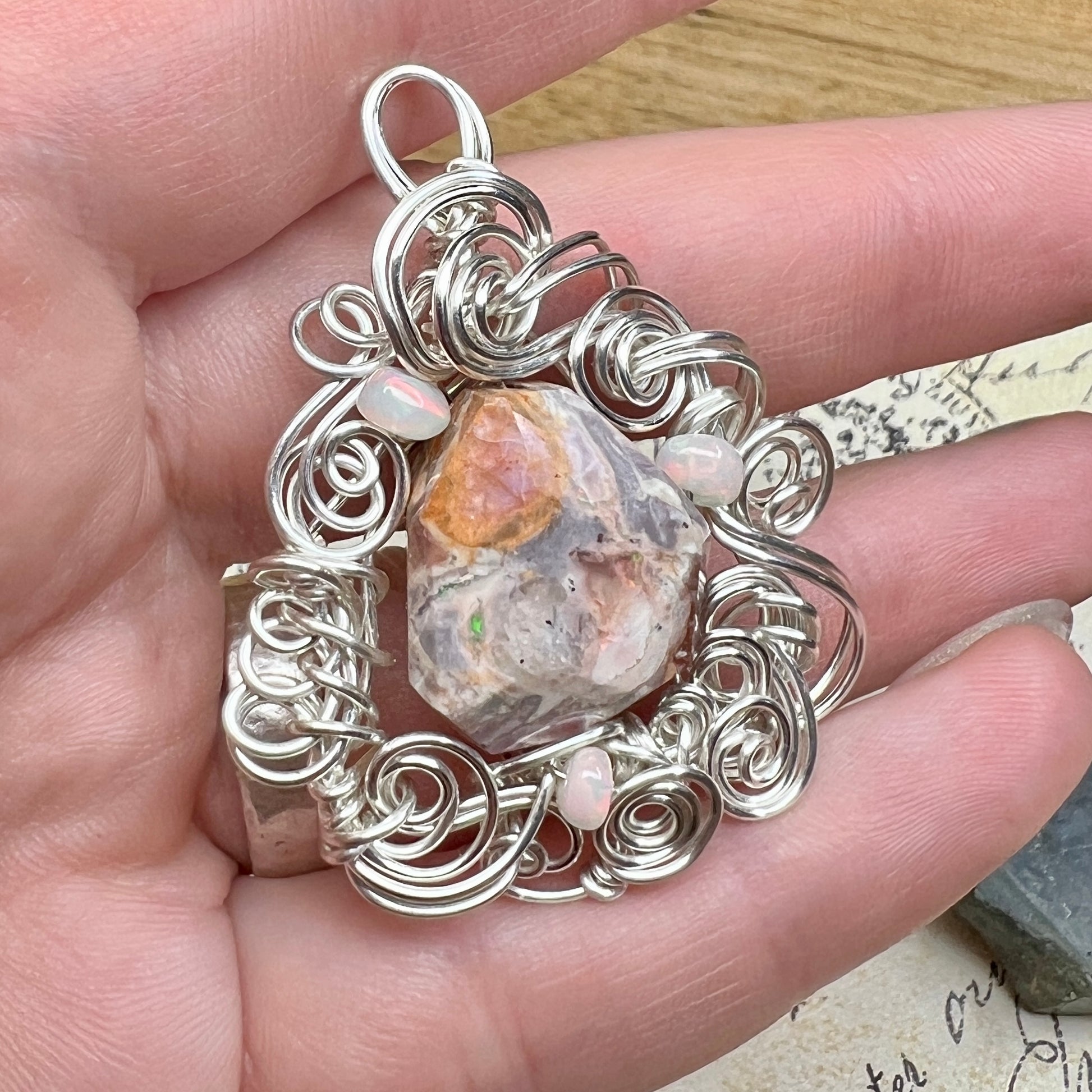 Mexican fire opal - mostly the agate matrix, but with fiery sparks of green and orange fire - set in sculpted silver wire and accented with Ethiopian opals with brilliant red fire.