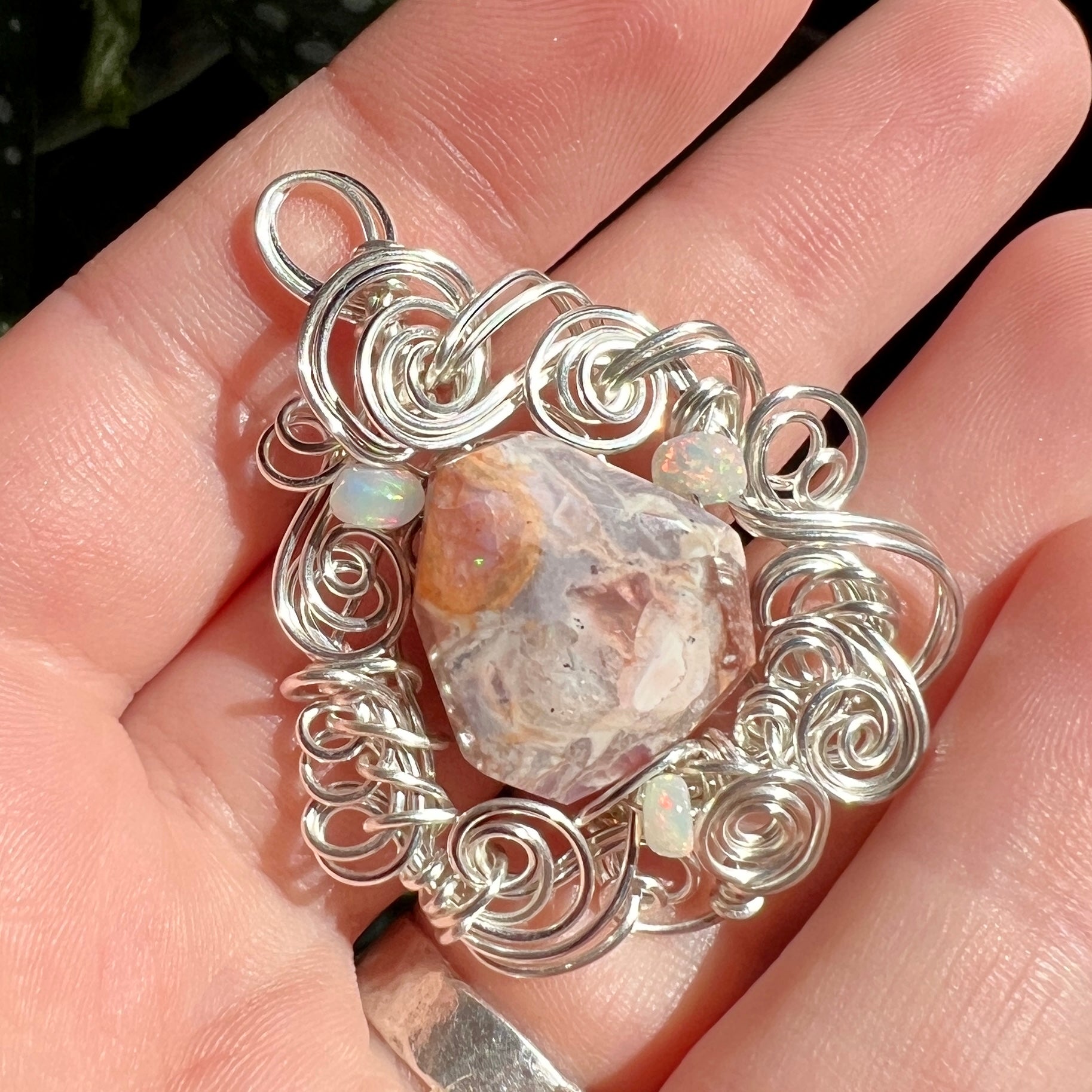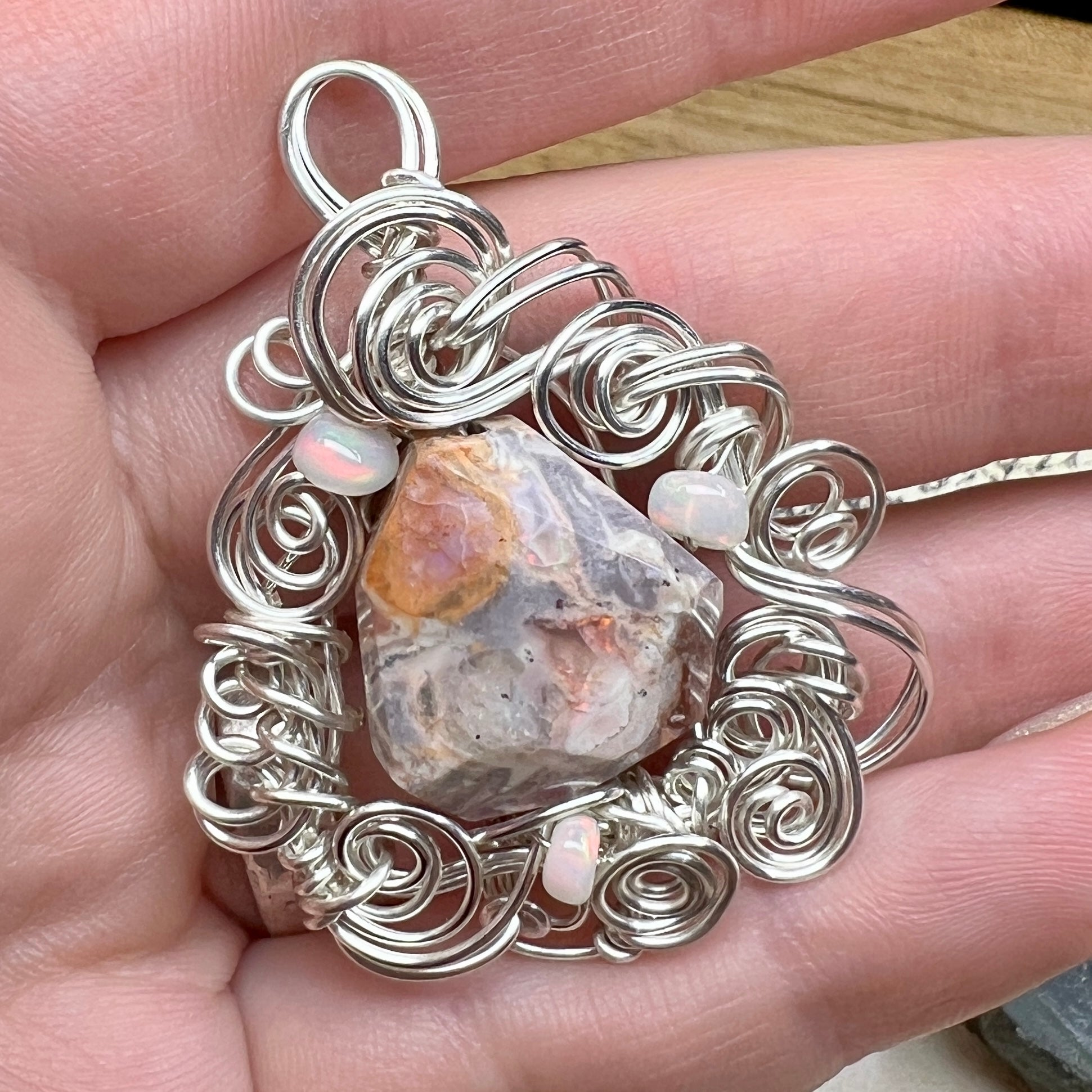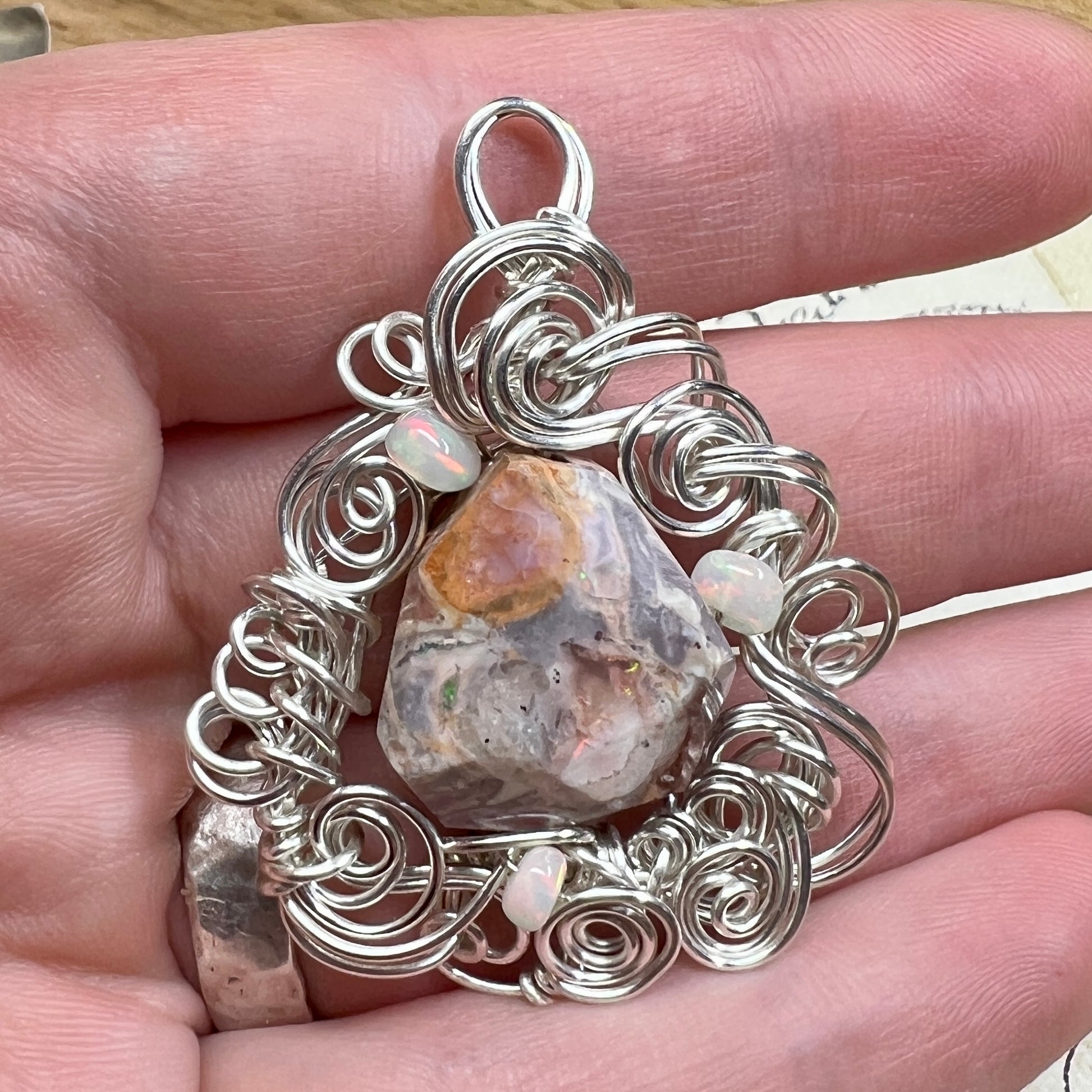 Mexican fire opal - mostly the agate matrix, but with fiery sparks of green and orange fire - set in sculpted silver wire and accented with Ethiopian opals with brilliant red fire.