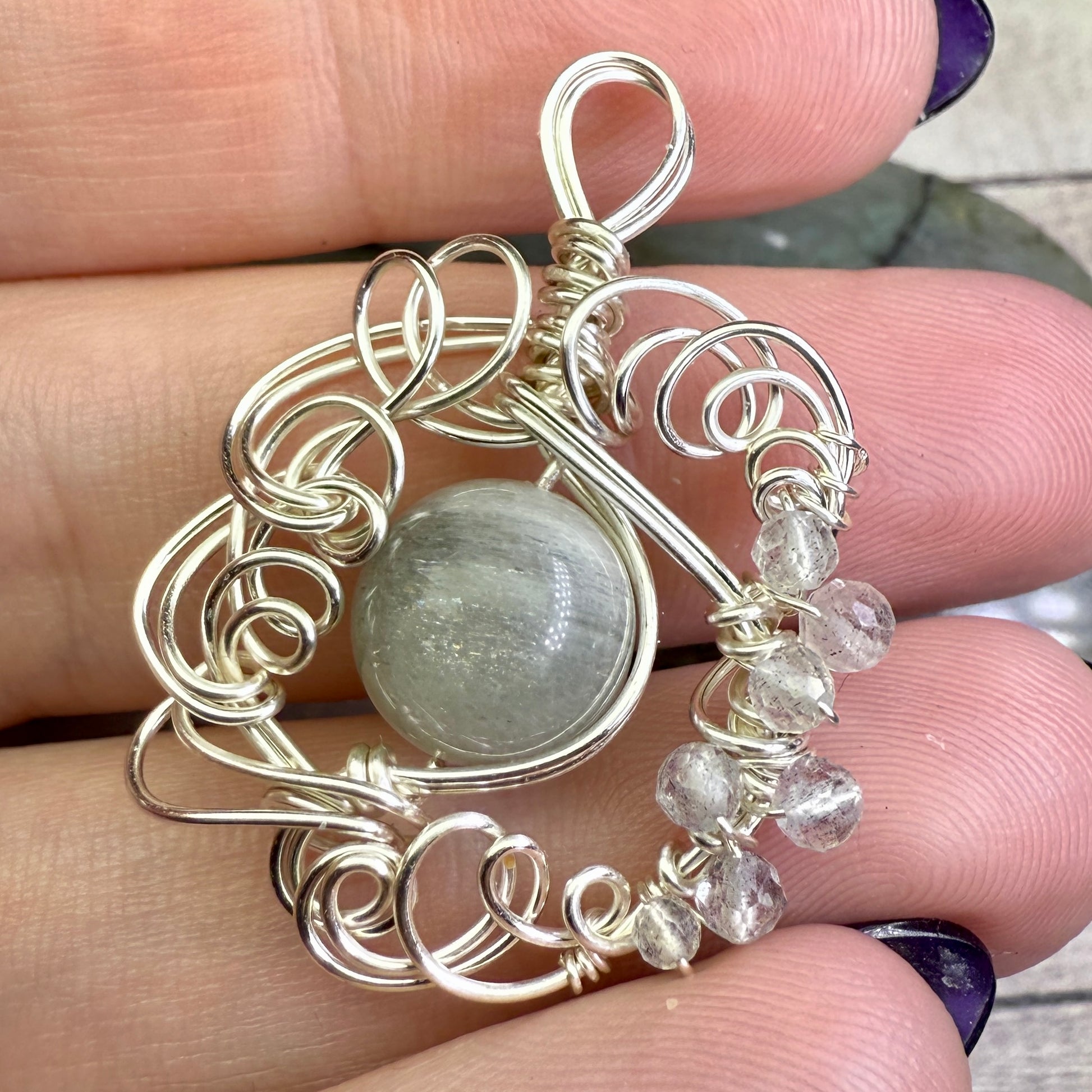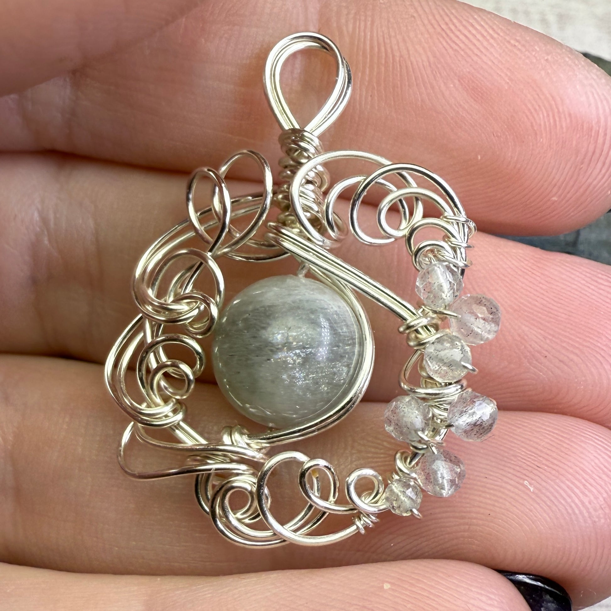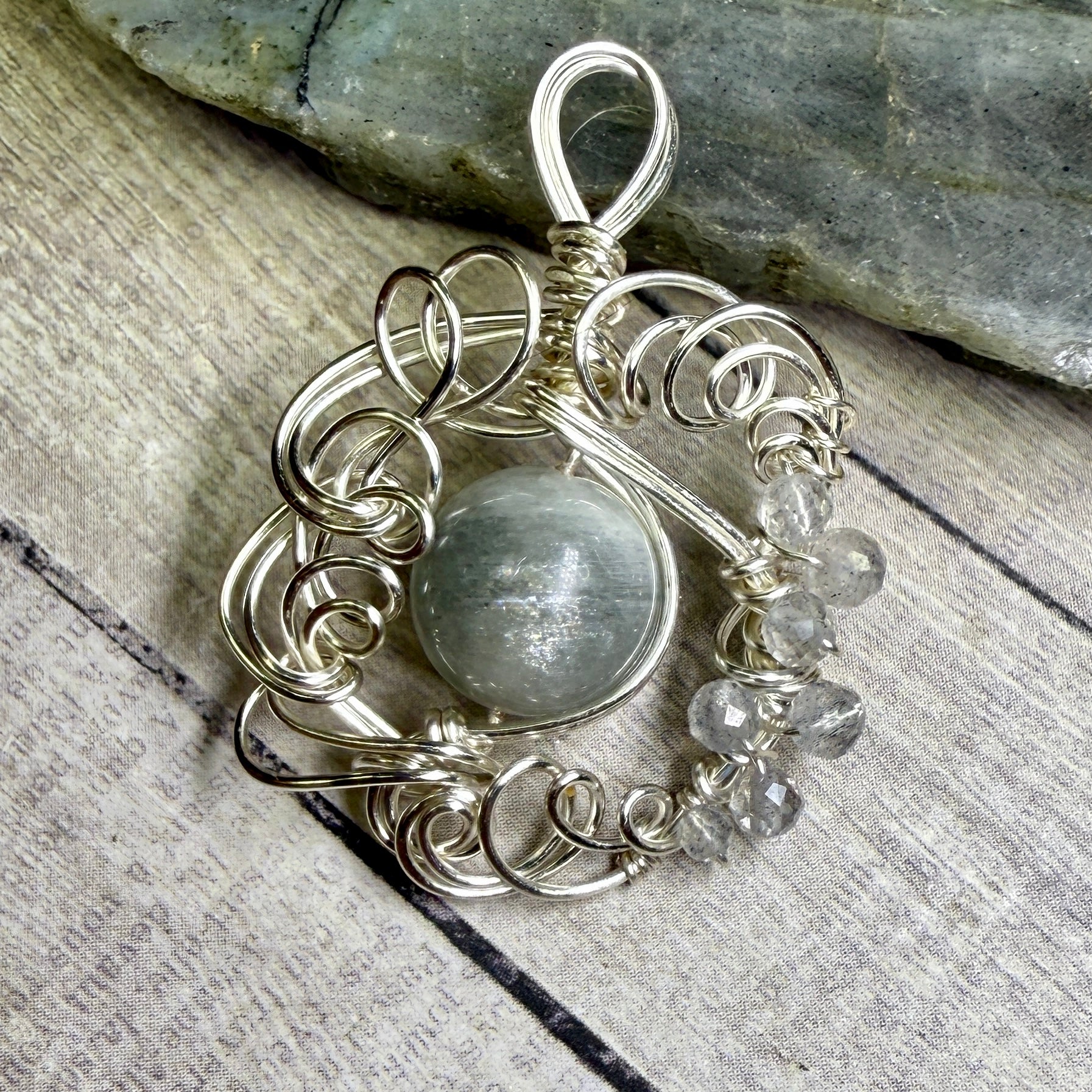 Silvery-grey Siberian moonstone, tiny sparkly labradorite beads, and sculpted silver wire.