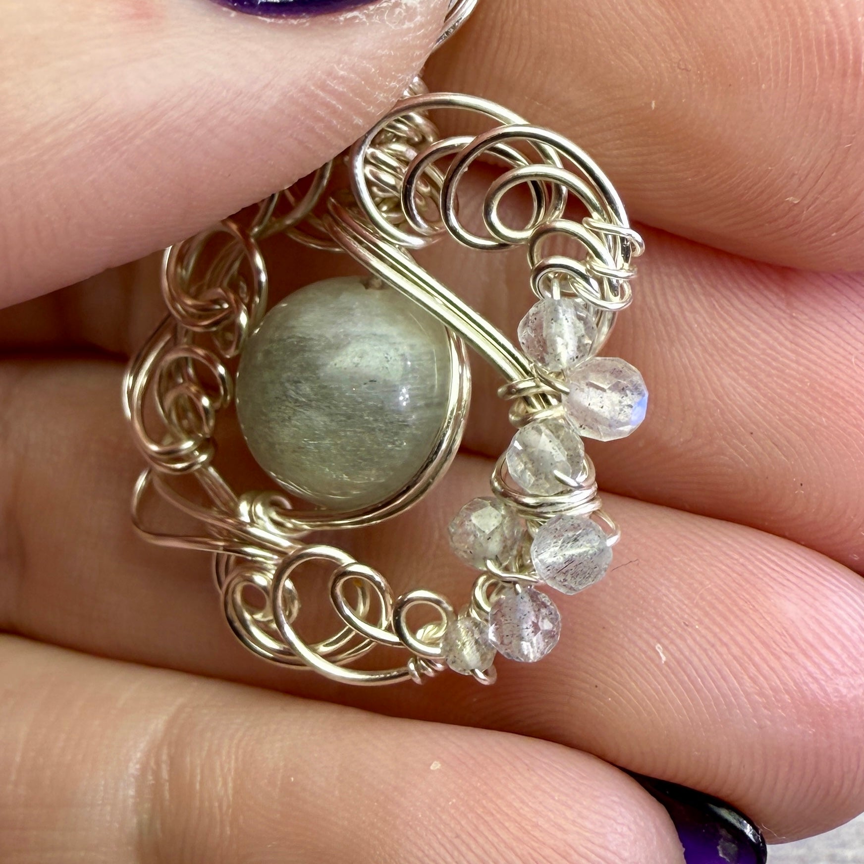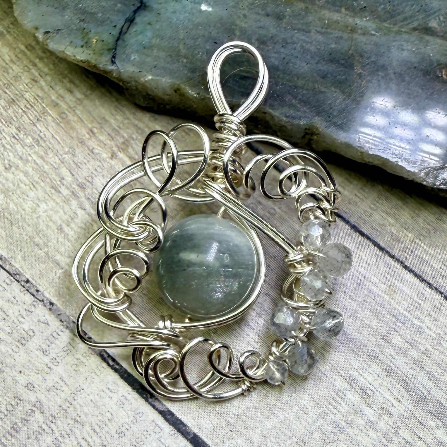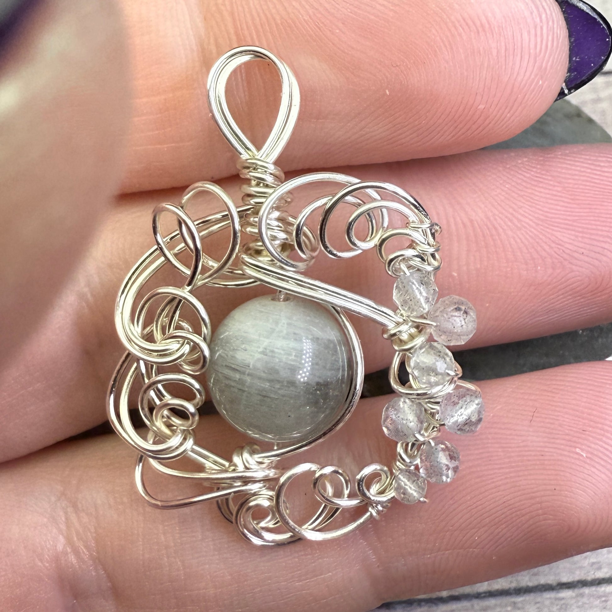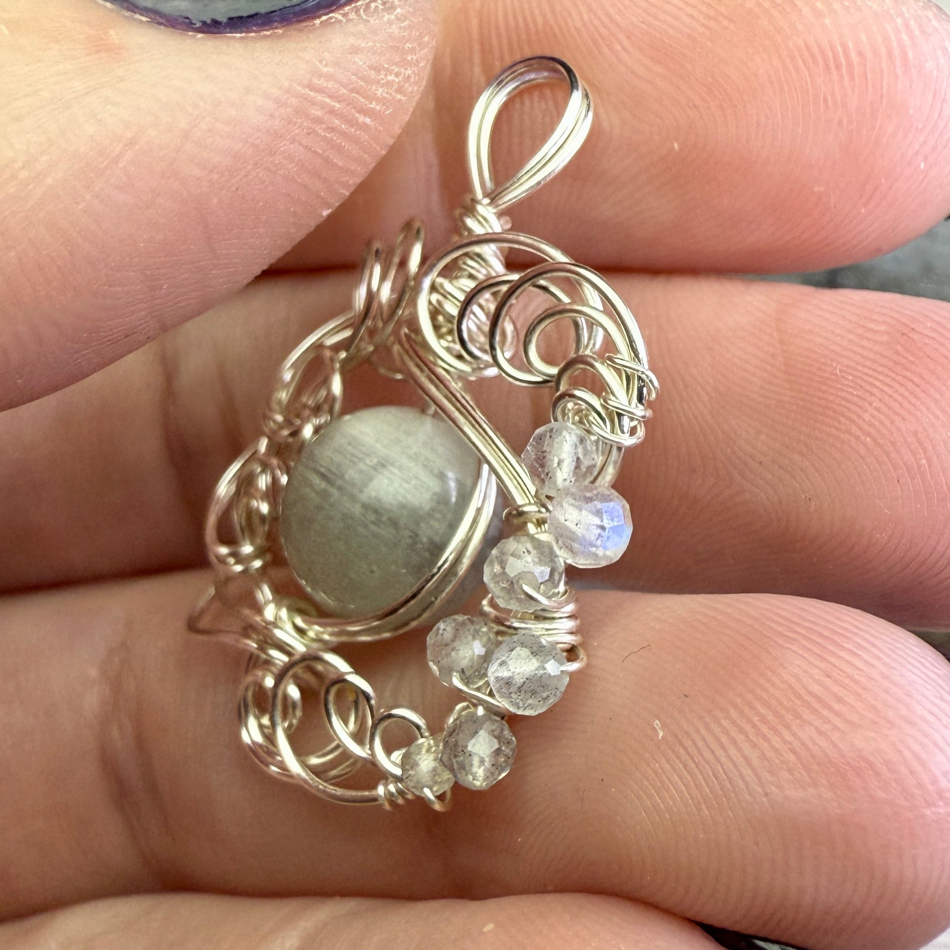 Silvery-grey Siberian moonstone, tiny sparkly labradorite beads, and sculpted silver wire.