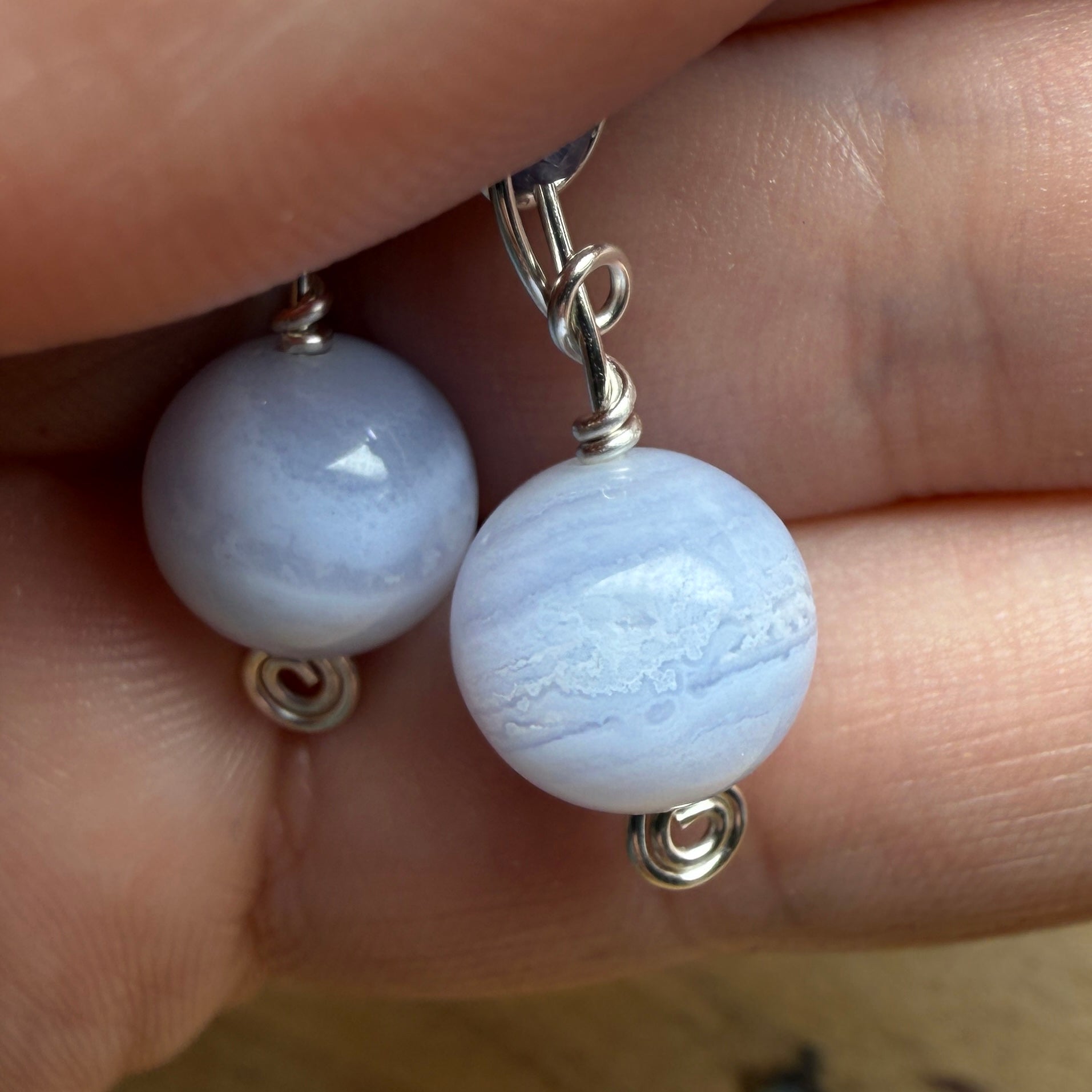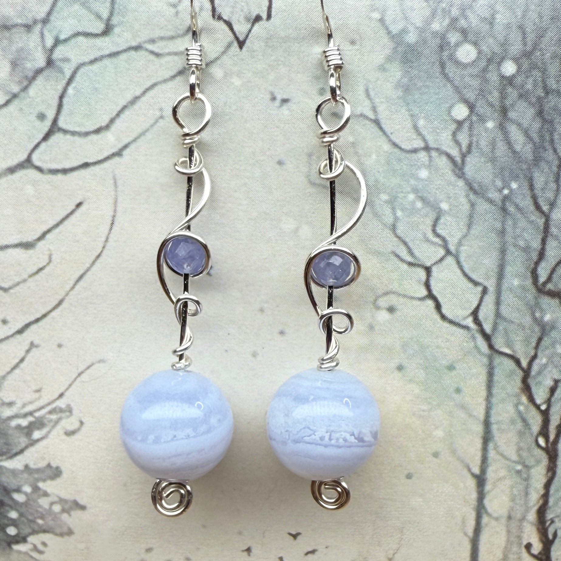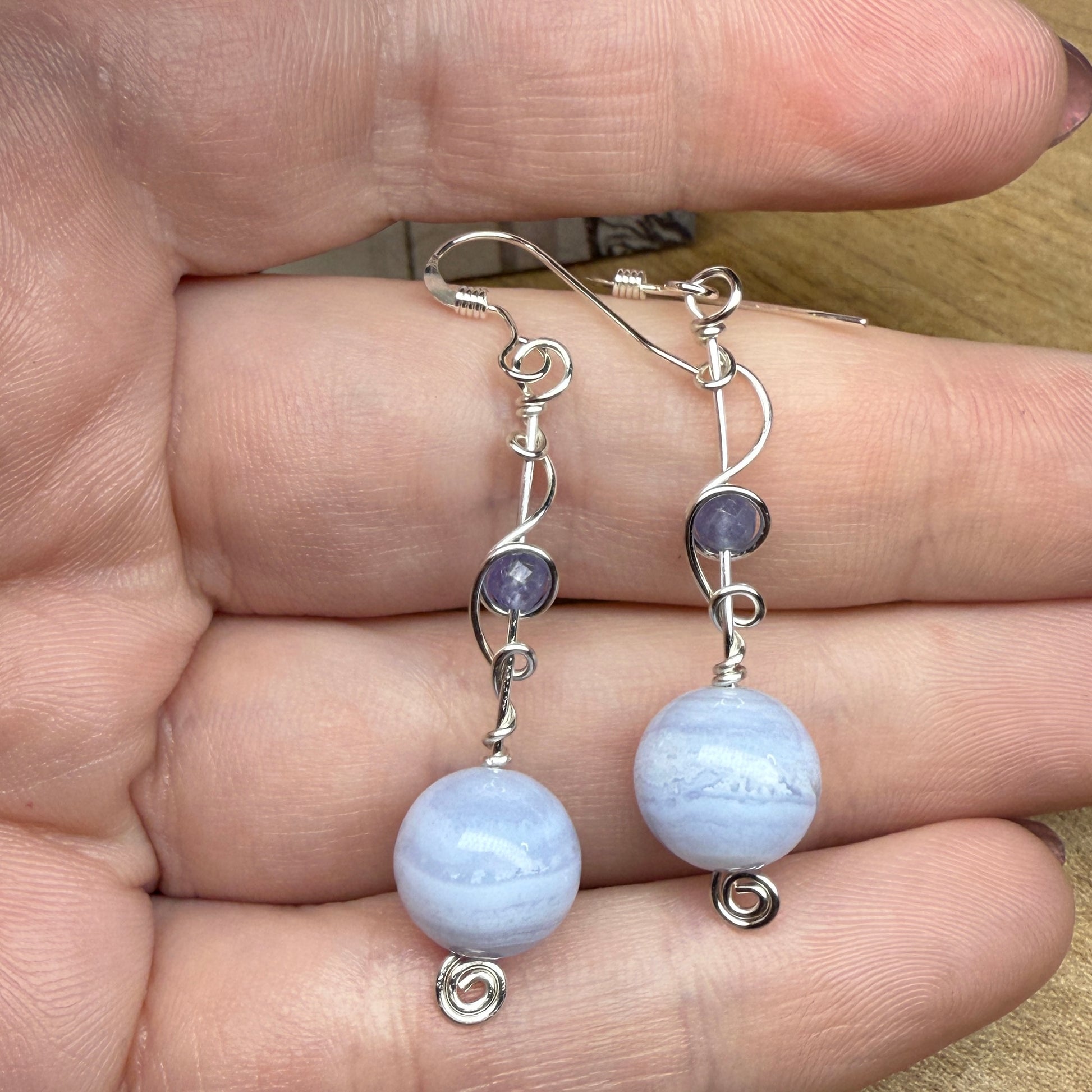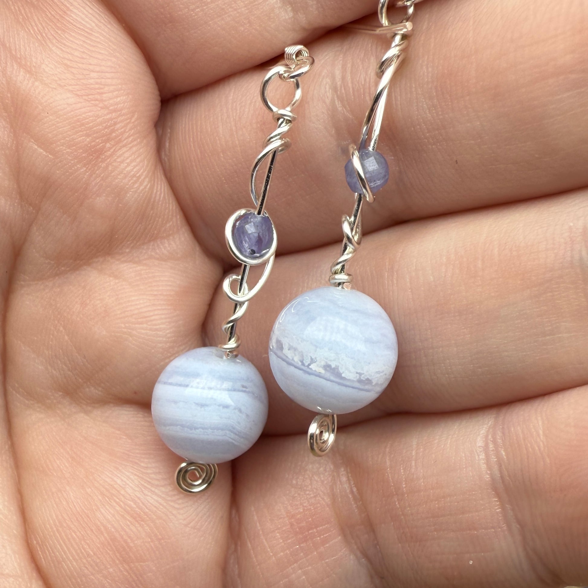 Frosty blue lace agate and violet tanzanite on silver wire. One of a kind.