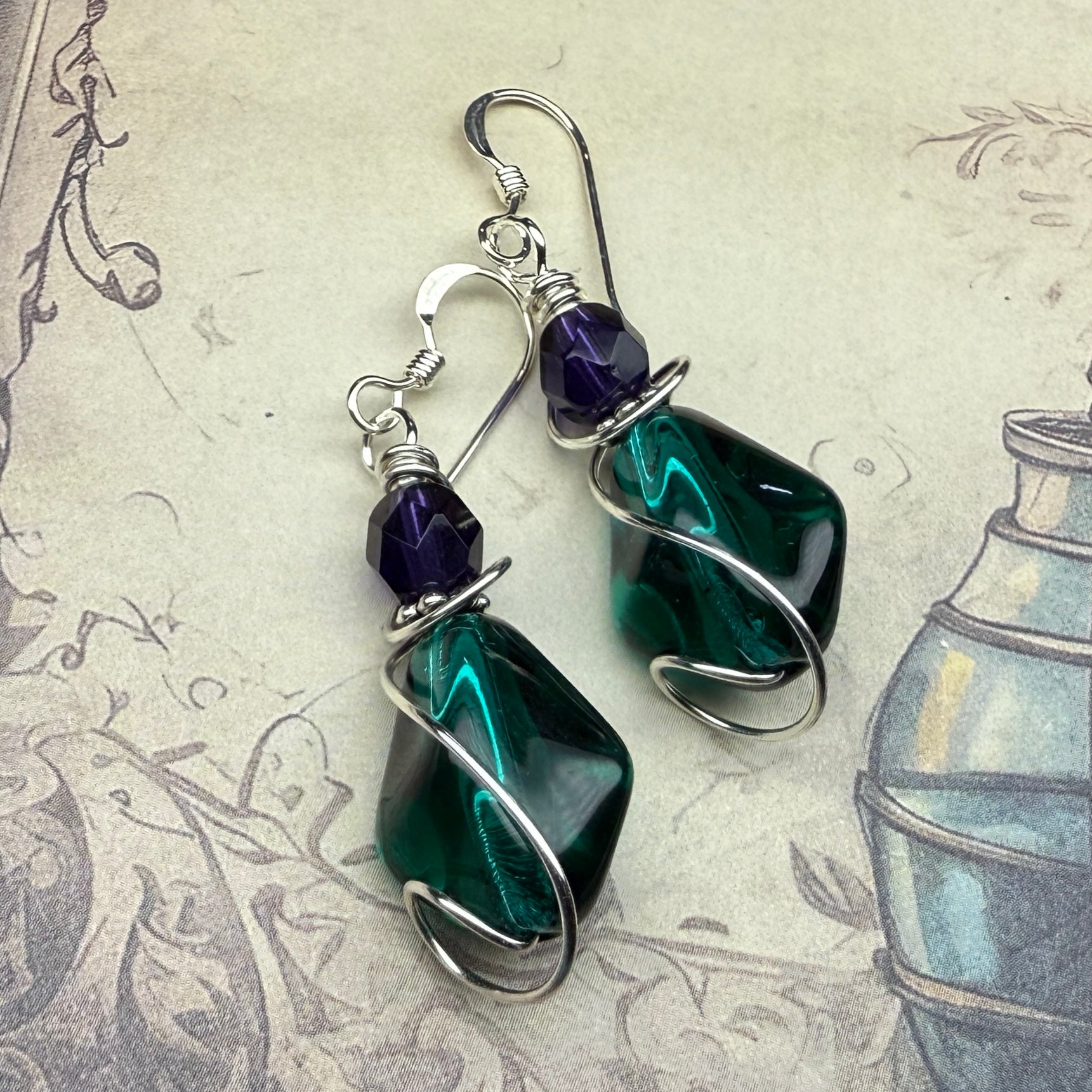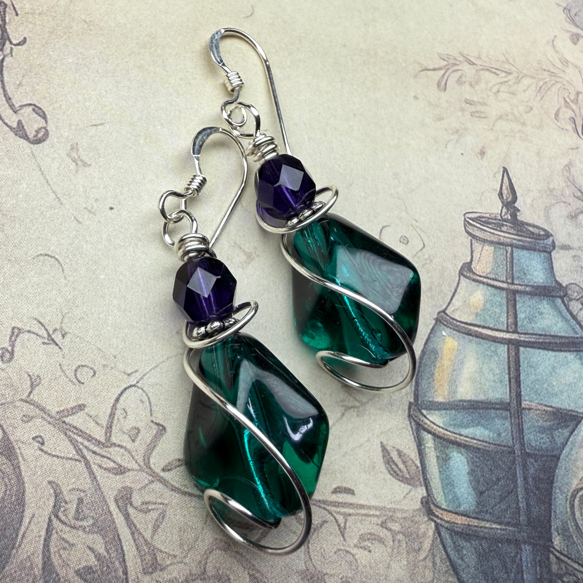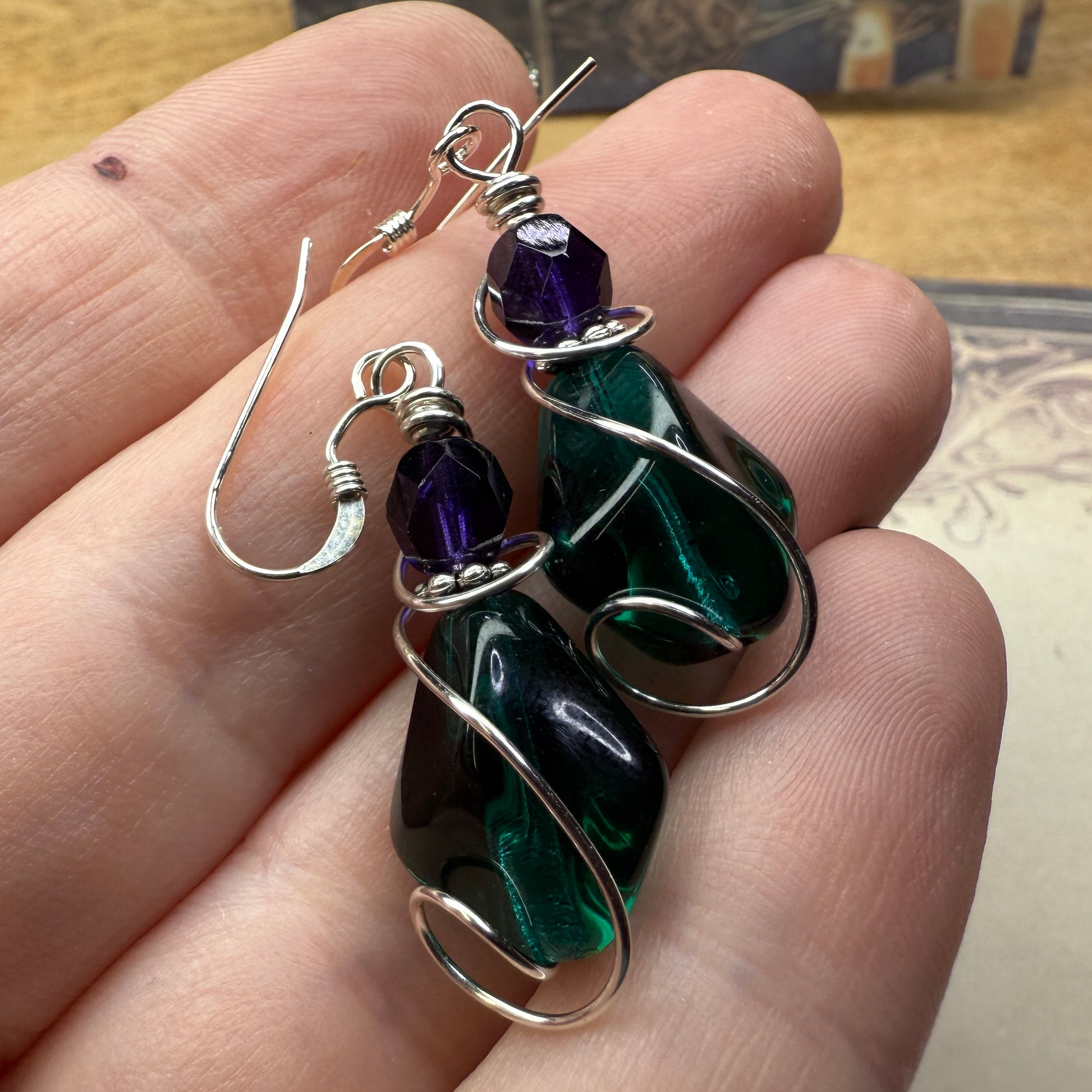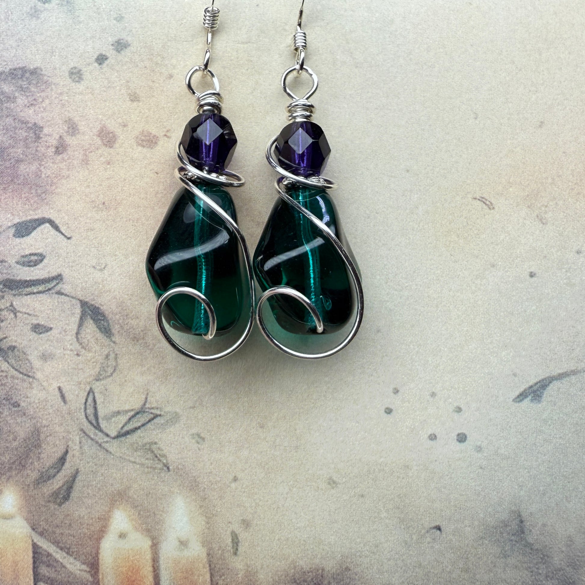 Deep teal green and deep purple vintage glass in swirling silver wire.