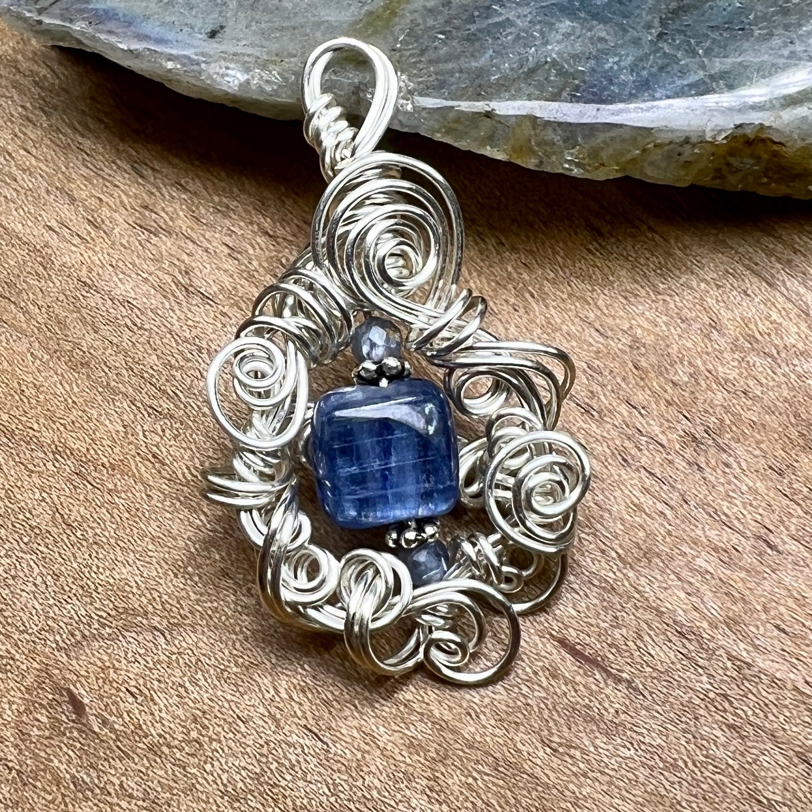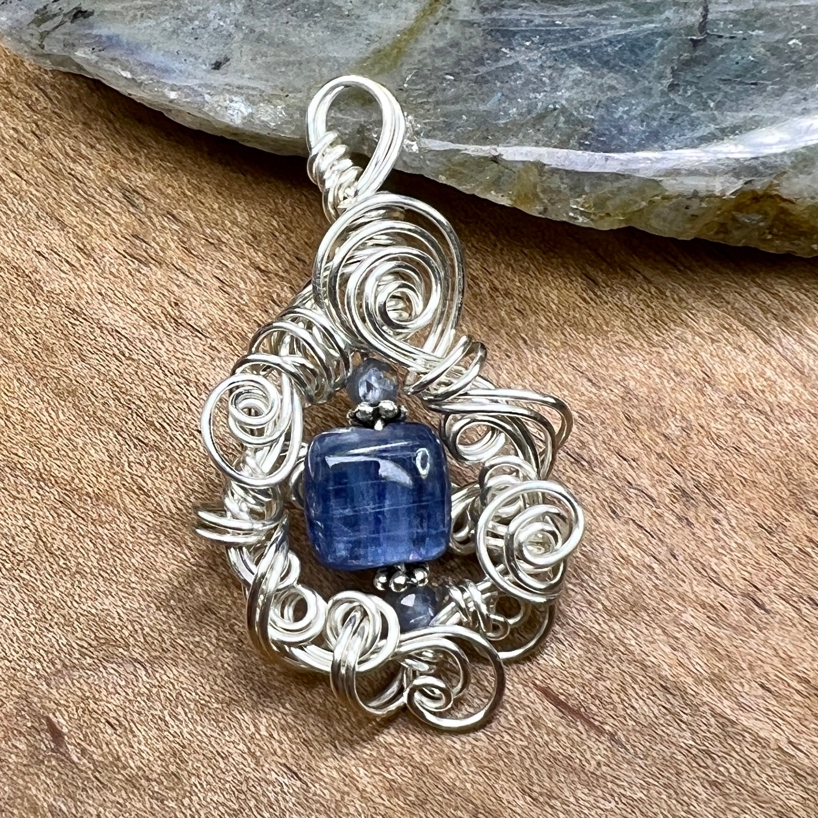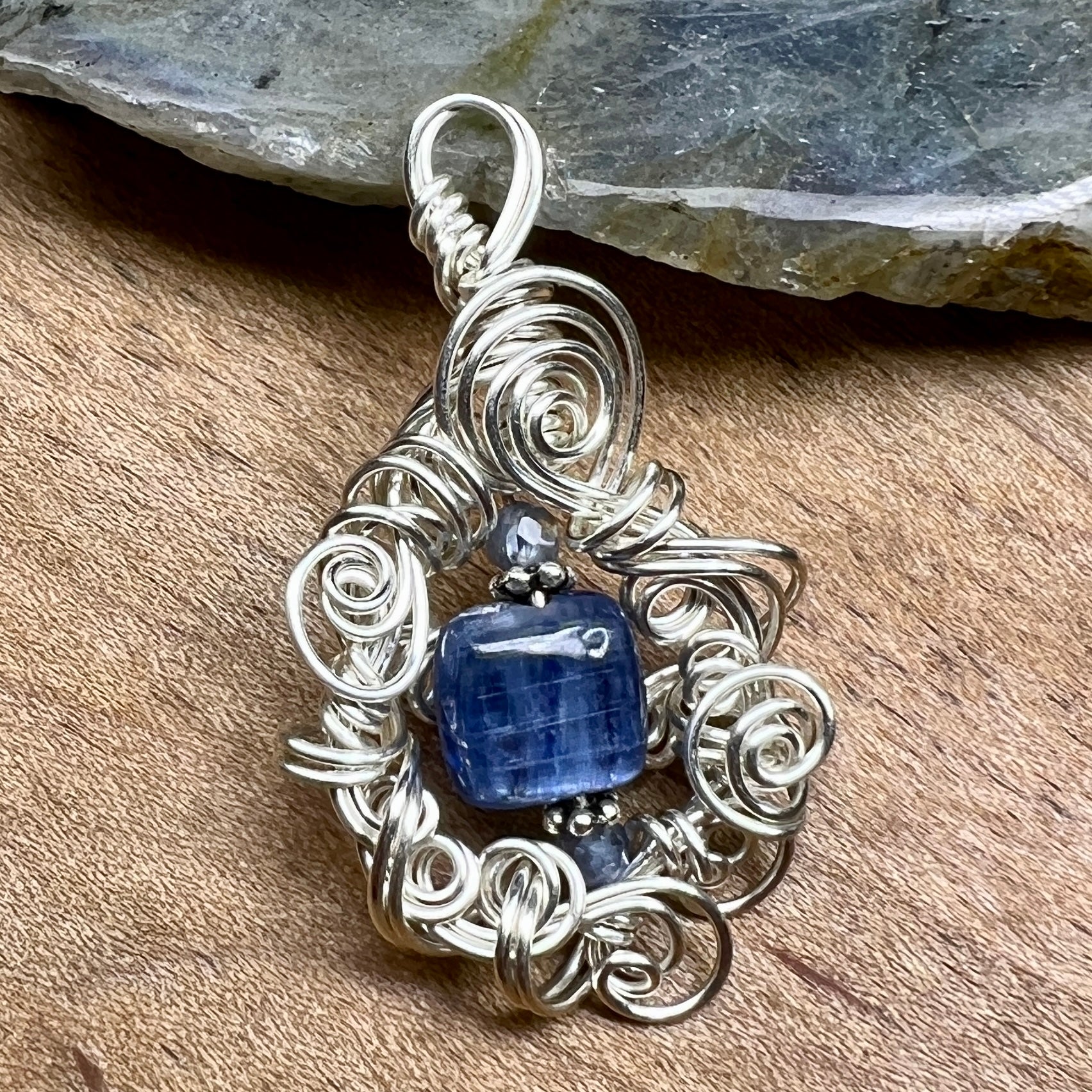 Deep blue kyanite accented with tiny lighter blue kyanite beads, set in swirling silver wire.