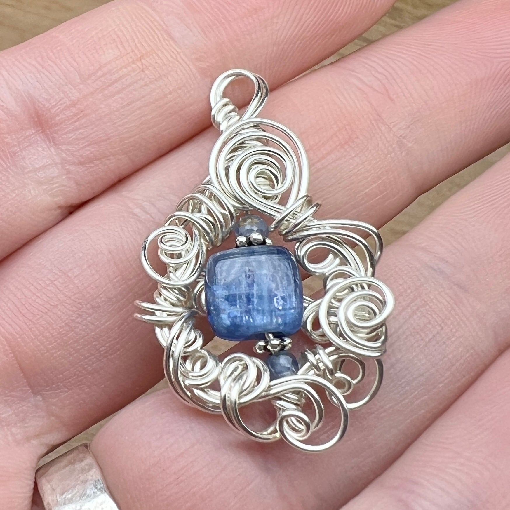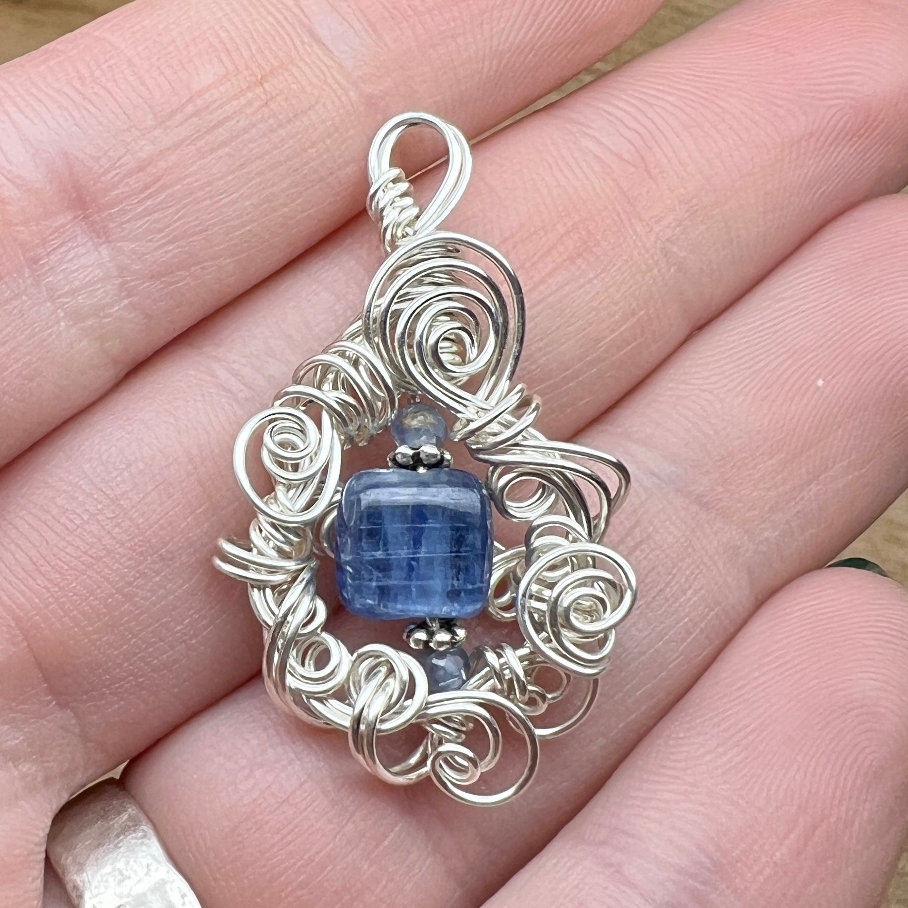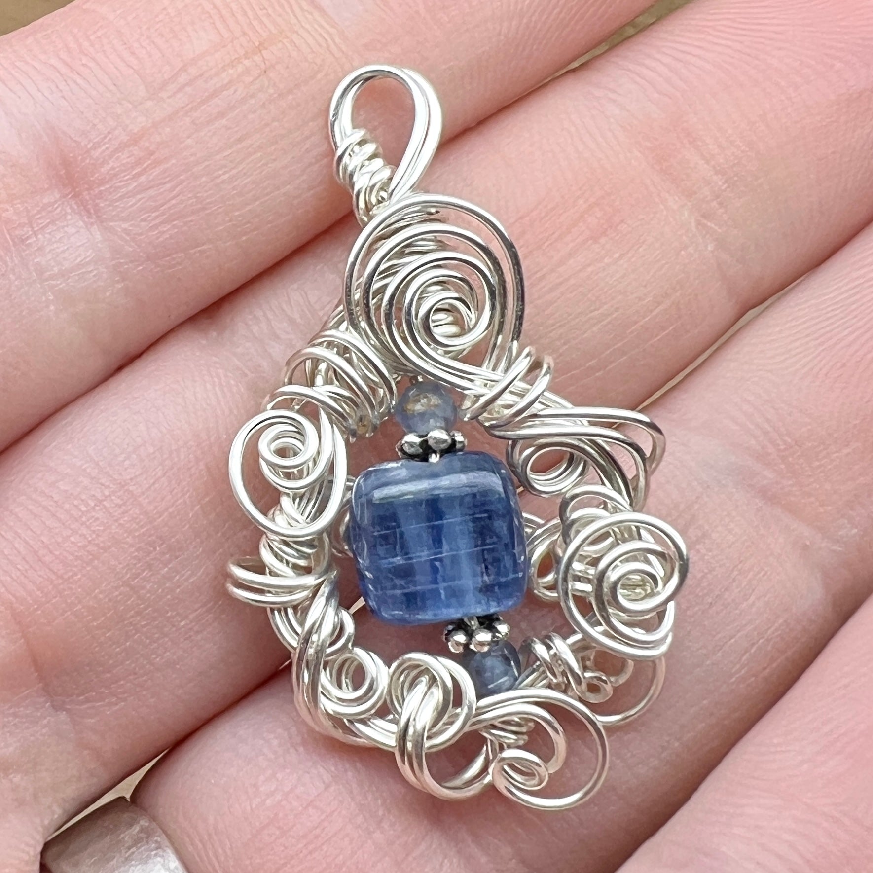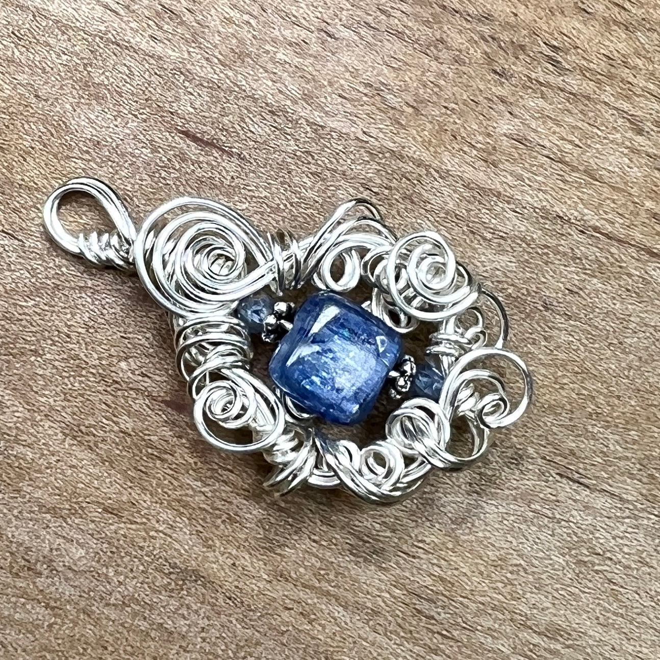 Deep blue kyanite accented with tiny lighter blue kyanite beads, set in swirling silver wire.