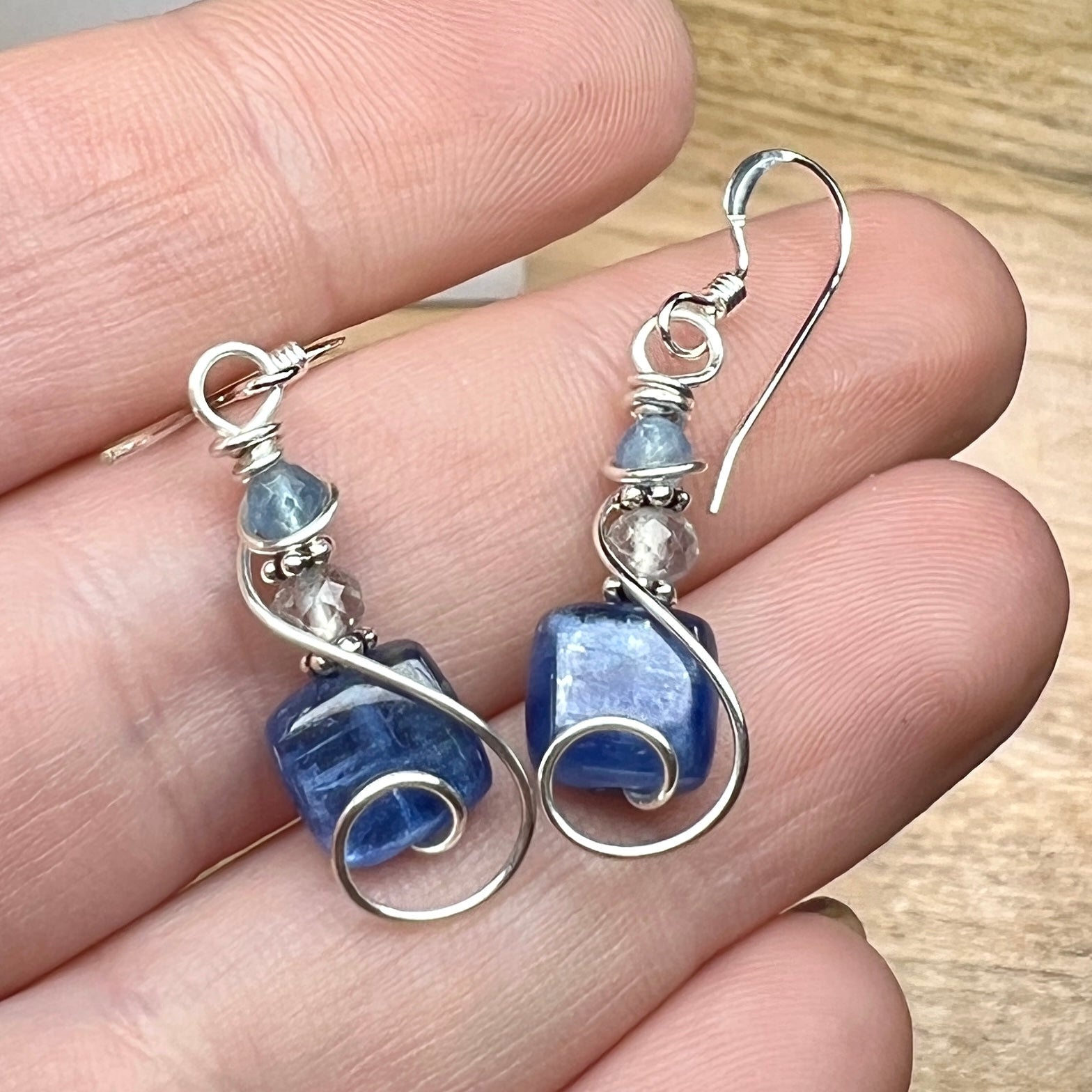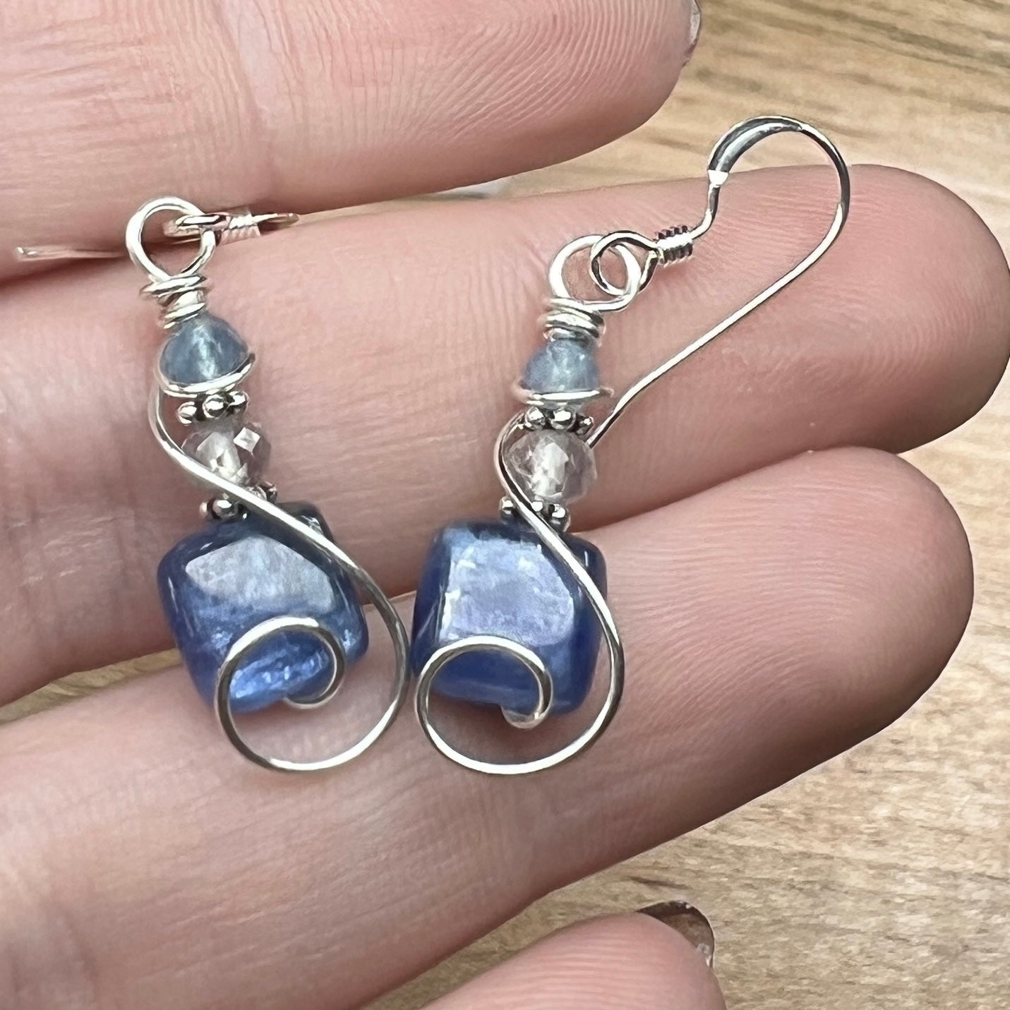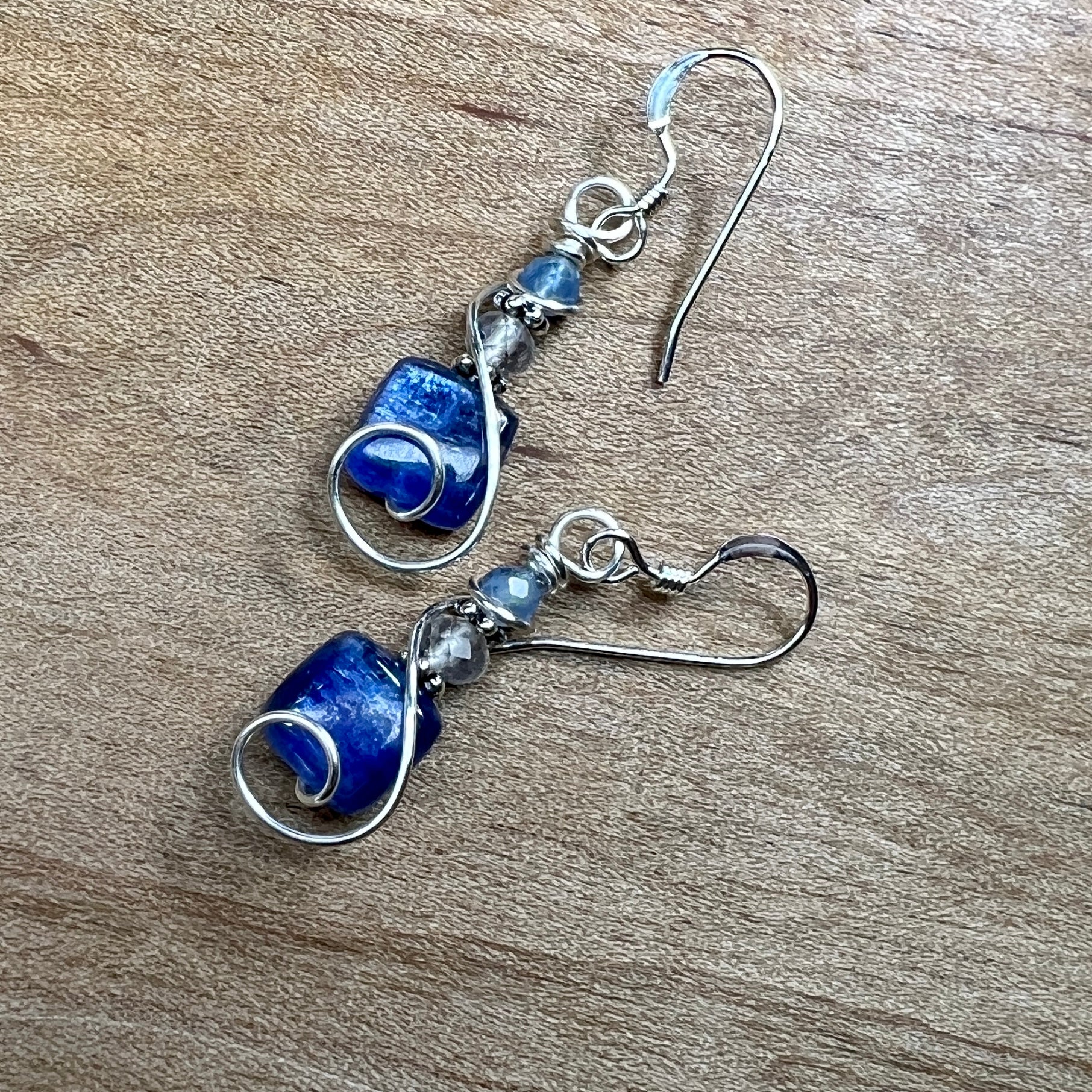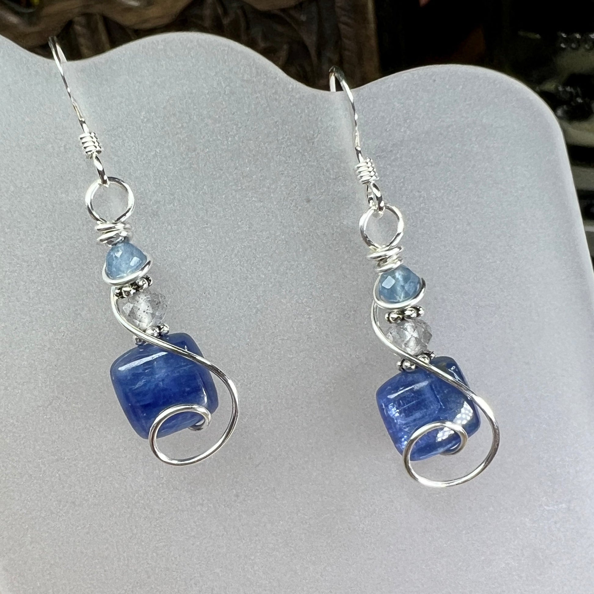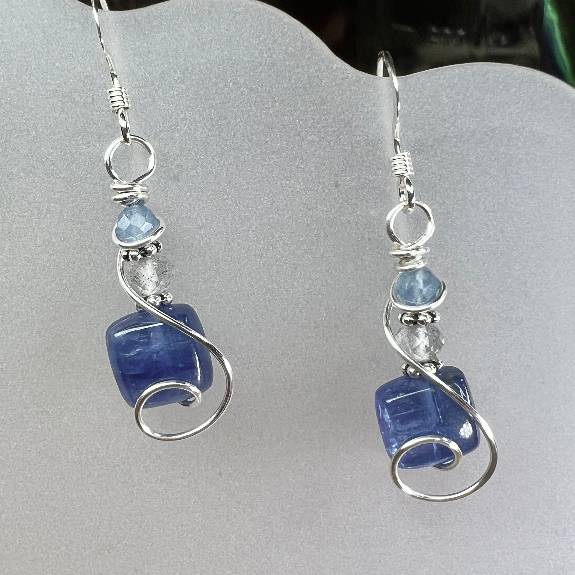Kyanite with accents of labradorite and aquamarine in a swirl of silver wire. Limited edition, please allow for very minor natural variation in the stones.