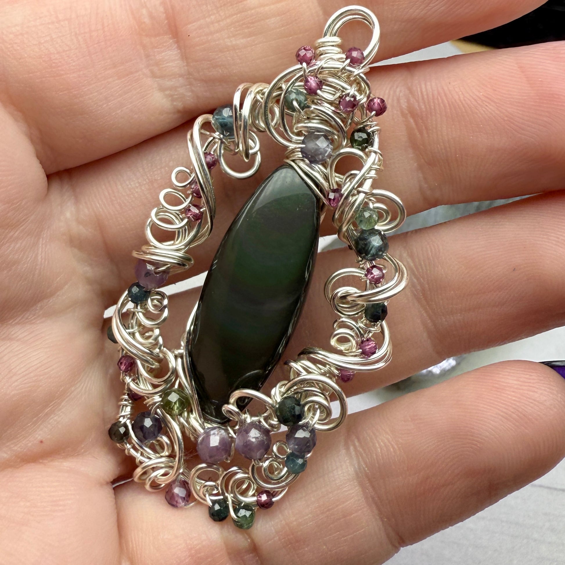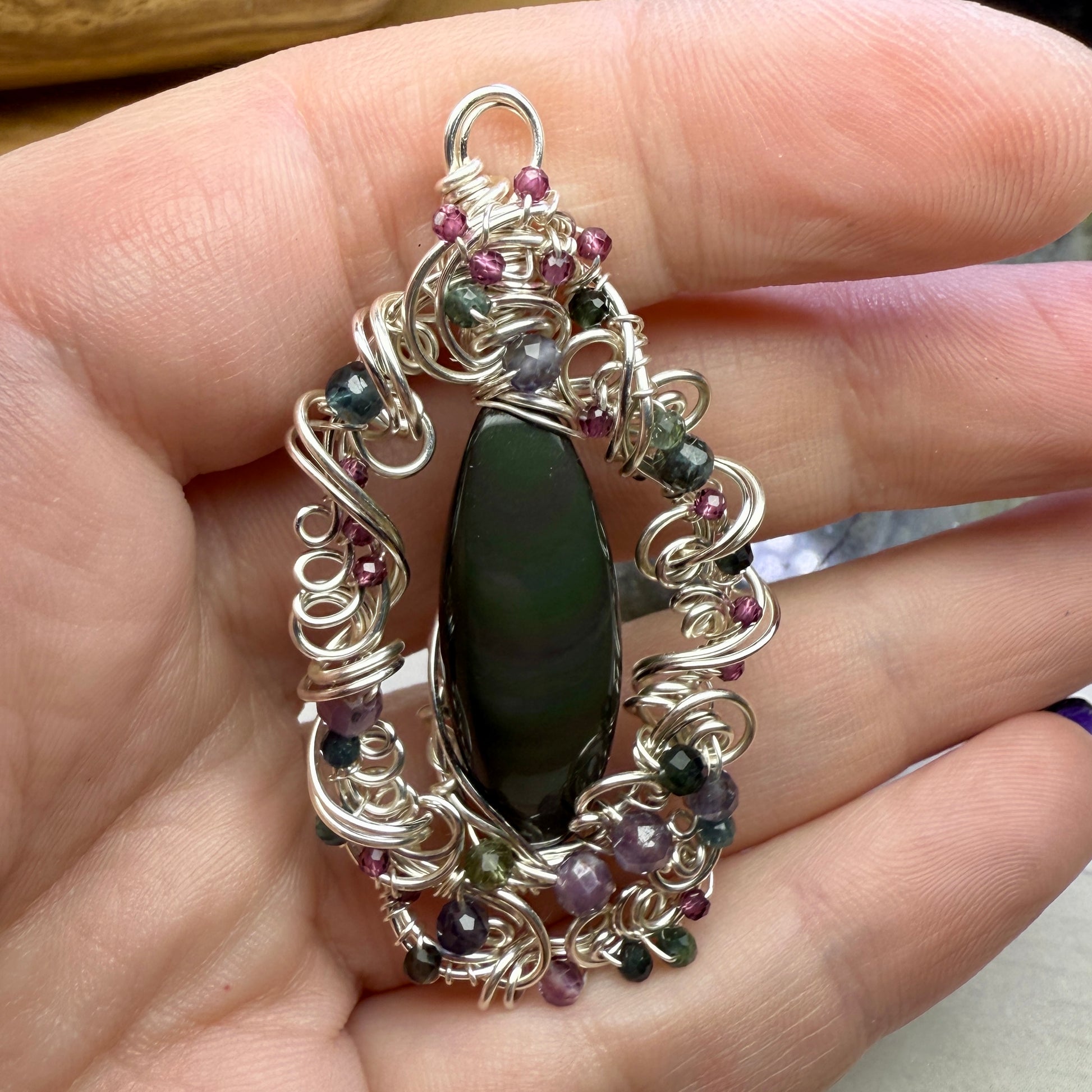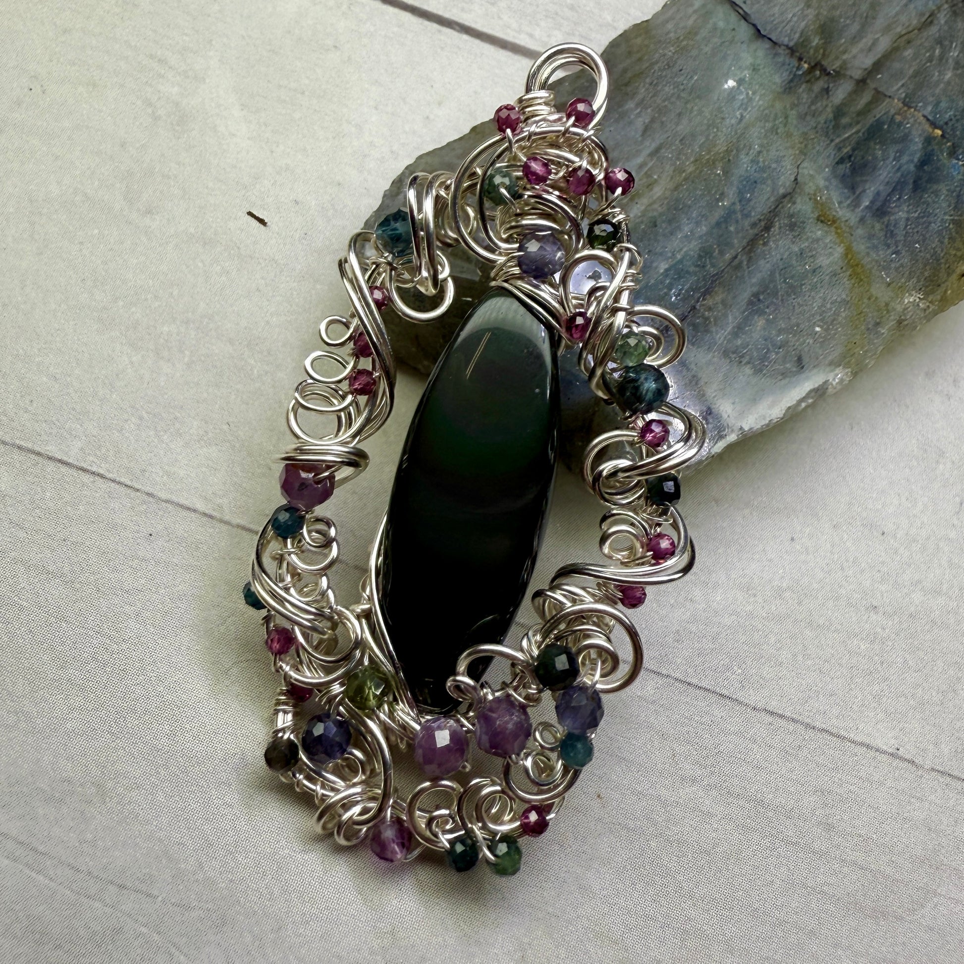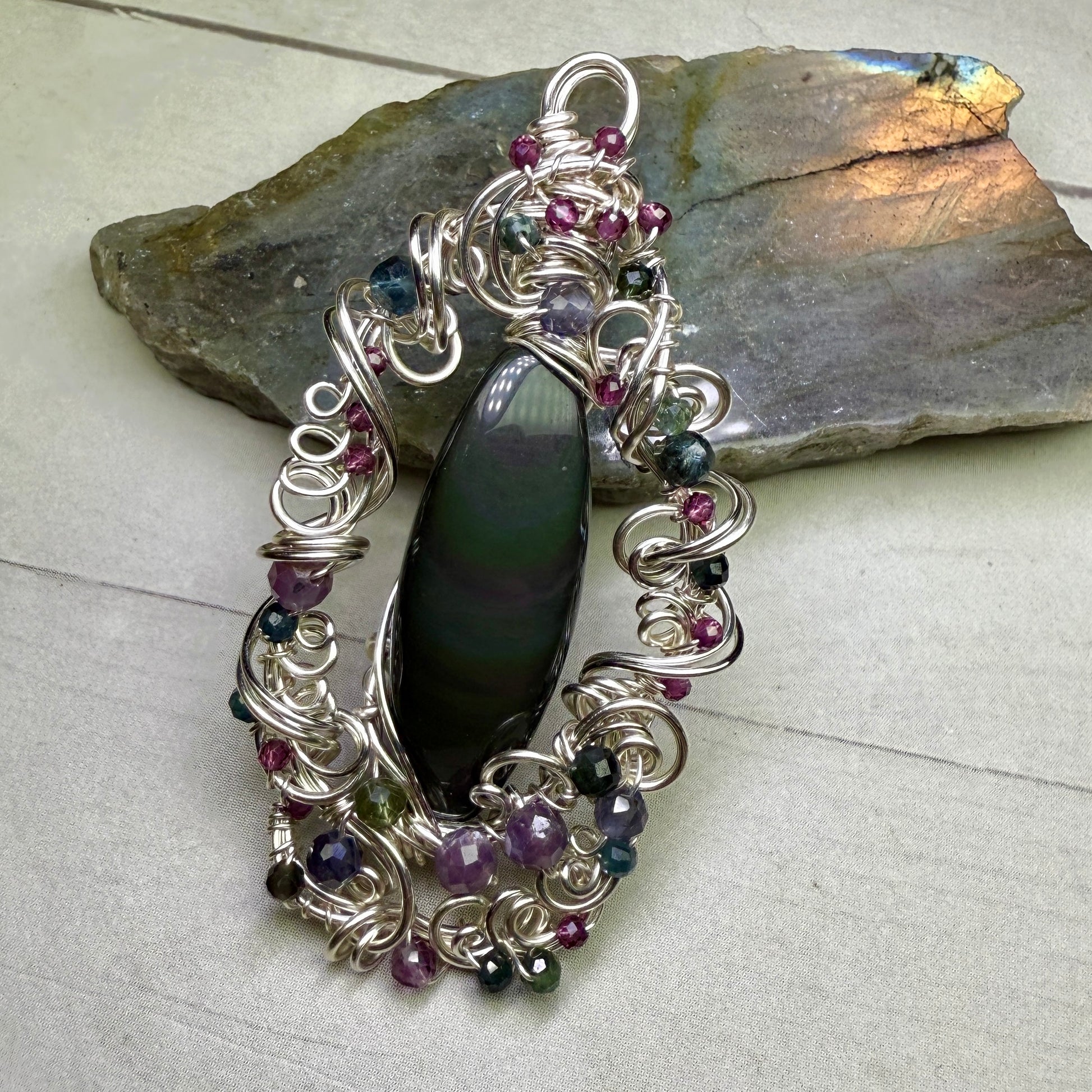 Rainbow obsidian in sculpted silver wire with dozens of tiny gemstone accents: purple garnet, blue and green tourmaline, iolite, purple star sapphires, and fluorite.