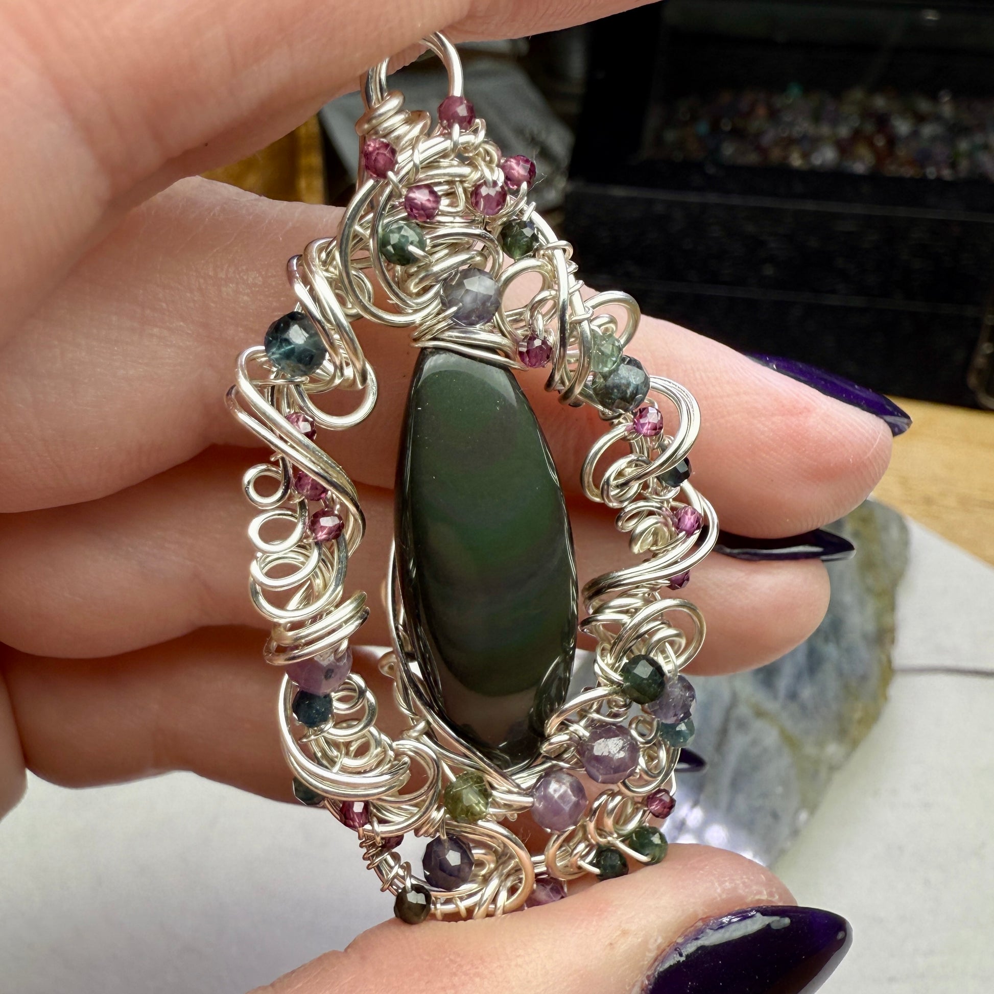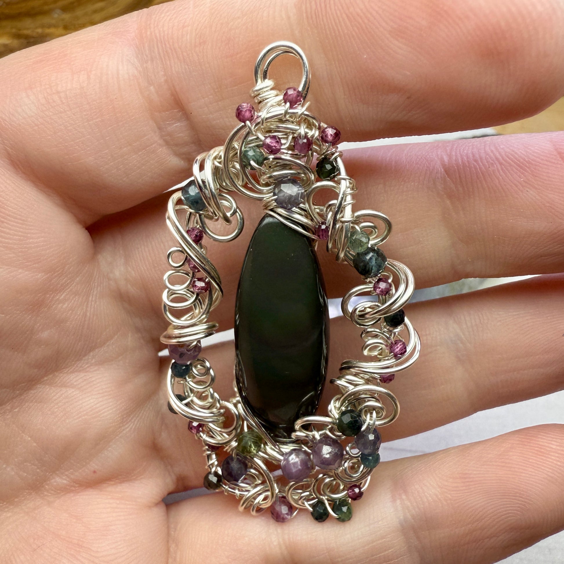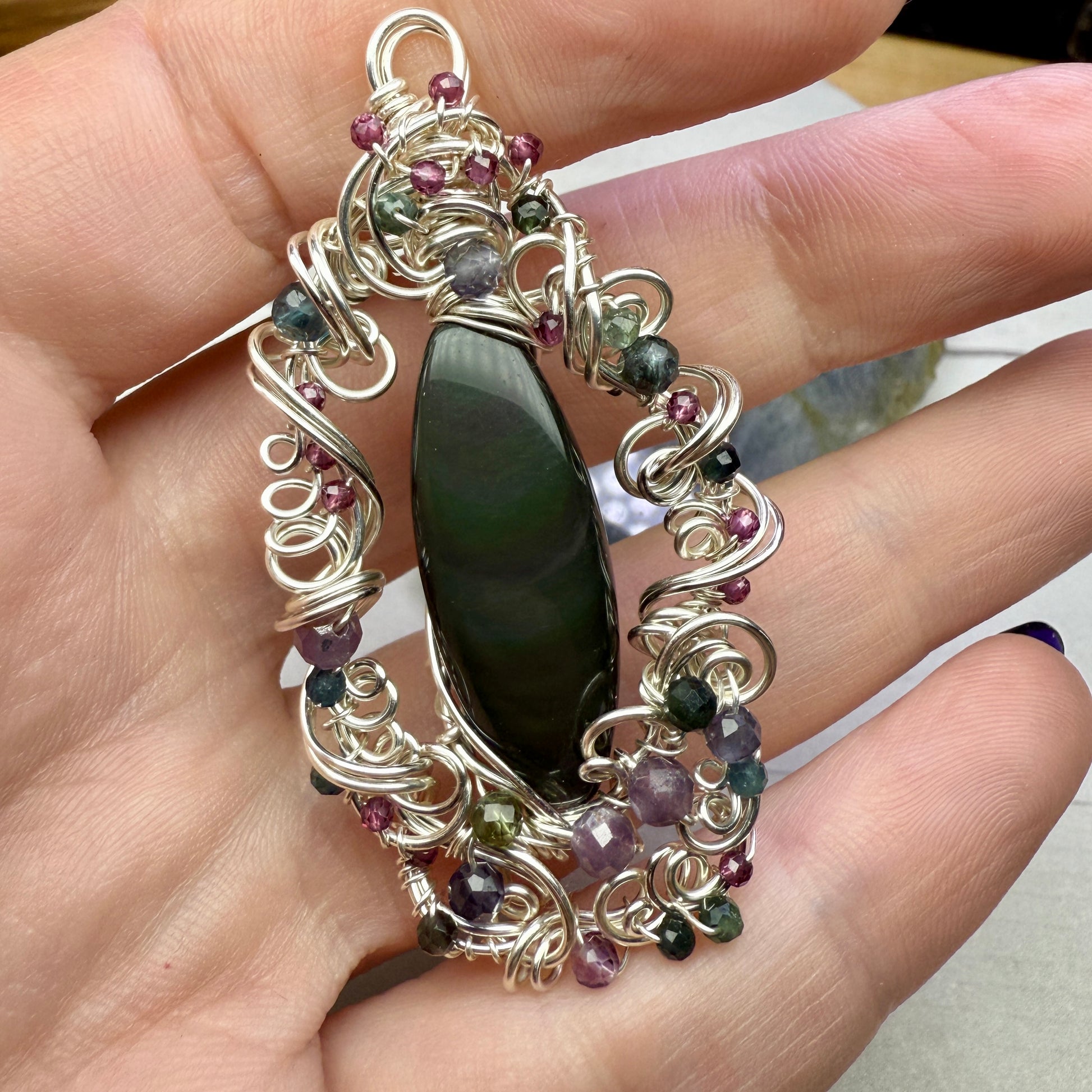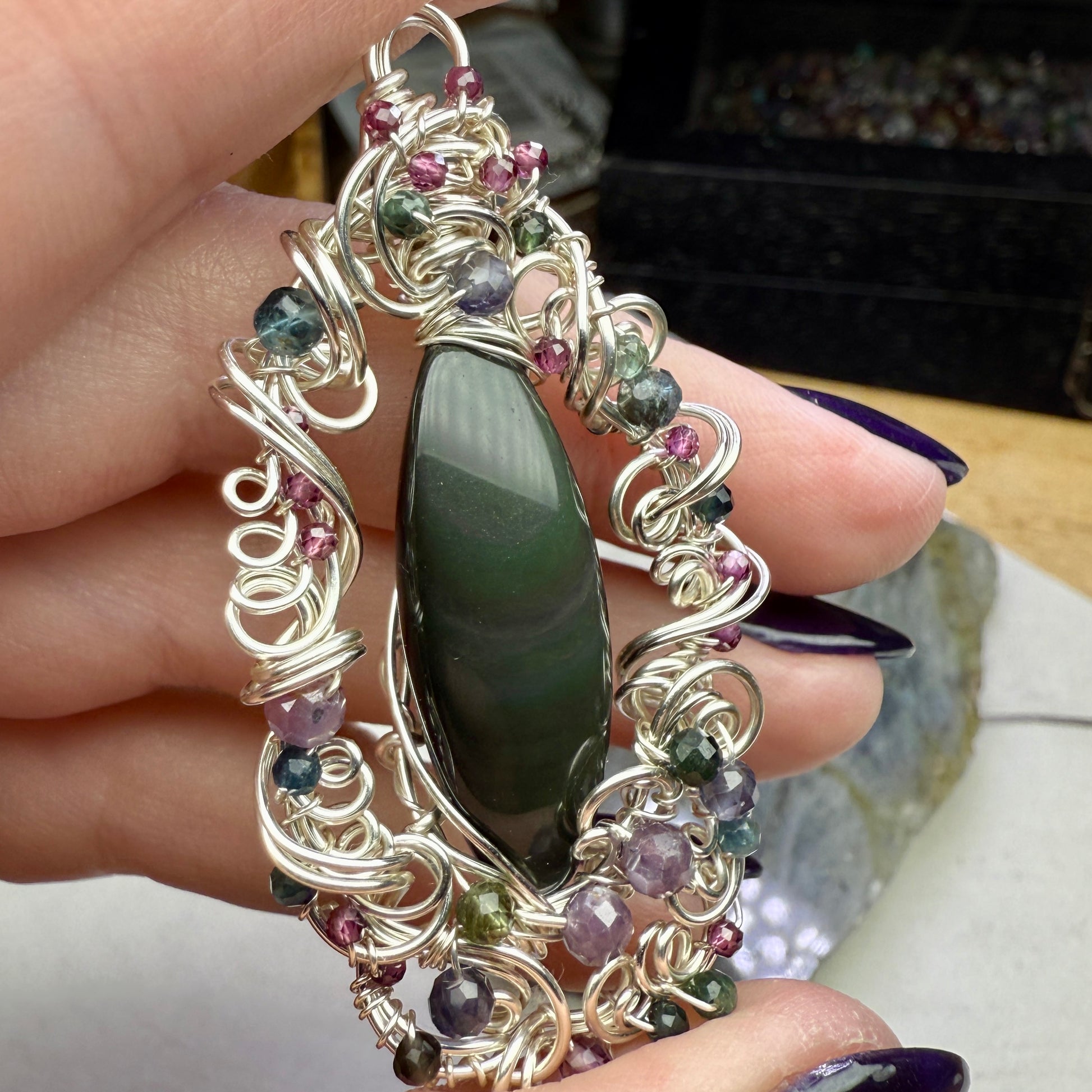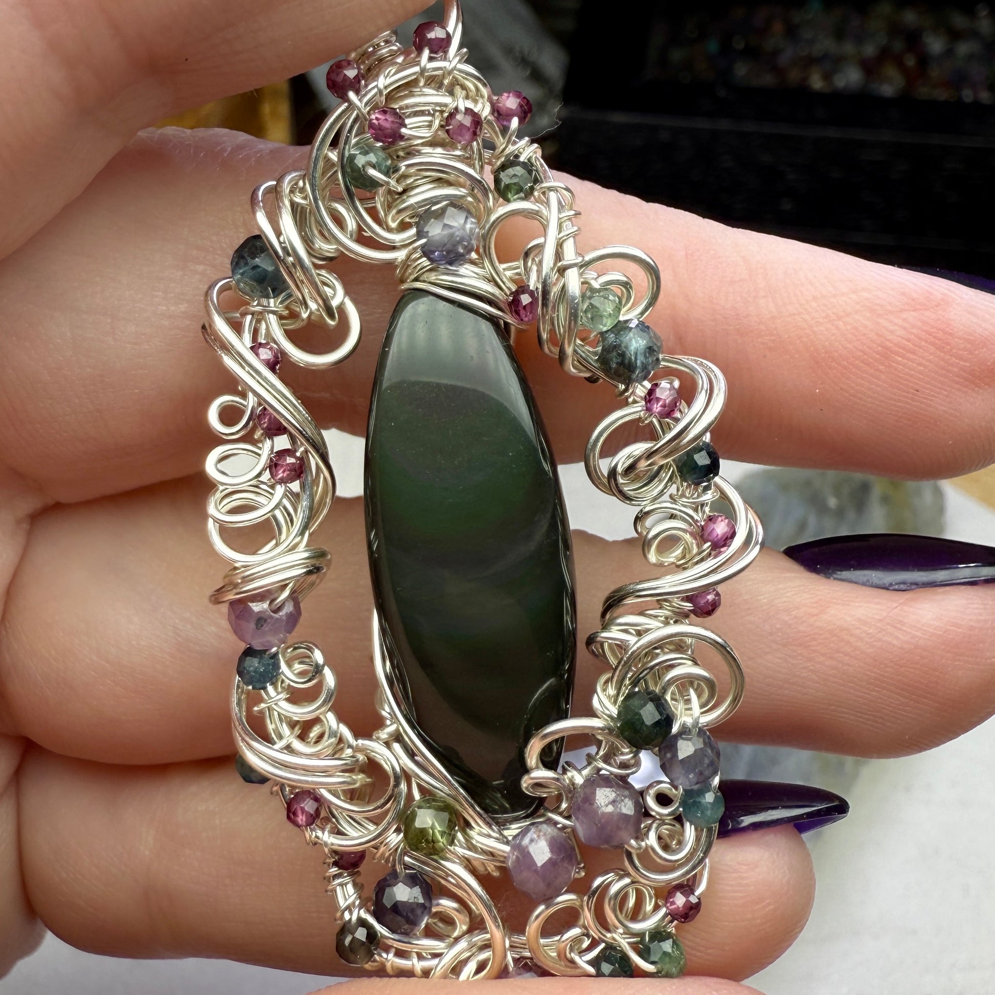 Rainbow obsidian in sculpted silver wire with dozens of tiny gemstone accents: purple garnet, blue and green tourmaline, iolite, purple star sapphires, and fluorite.