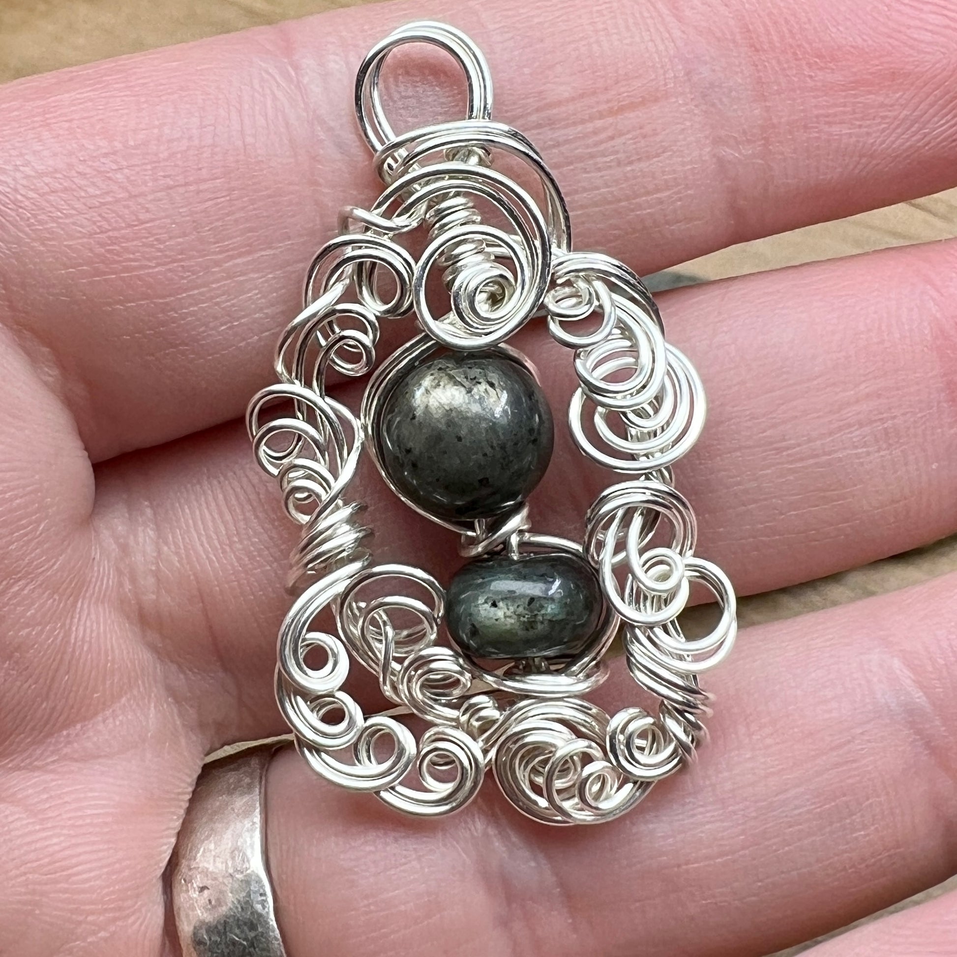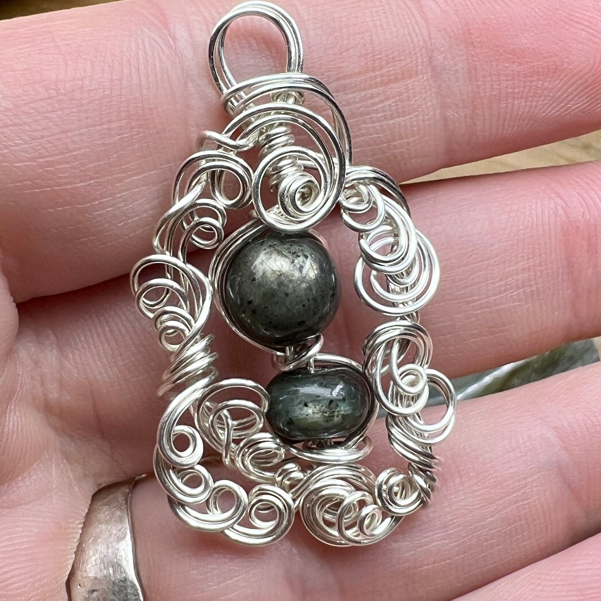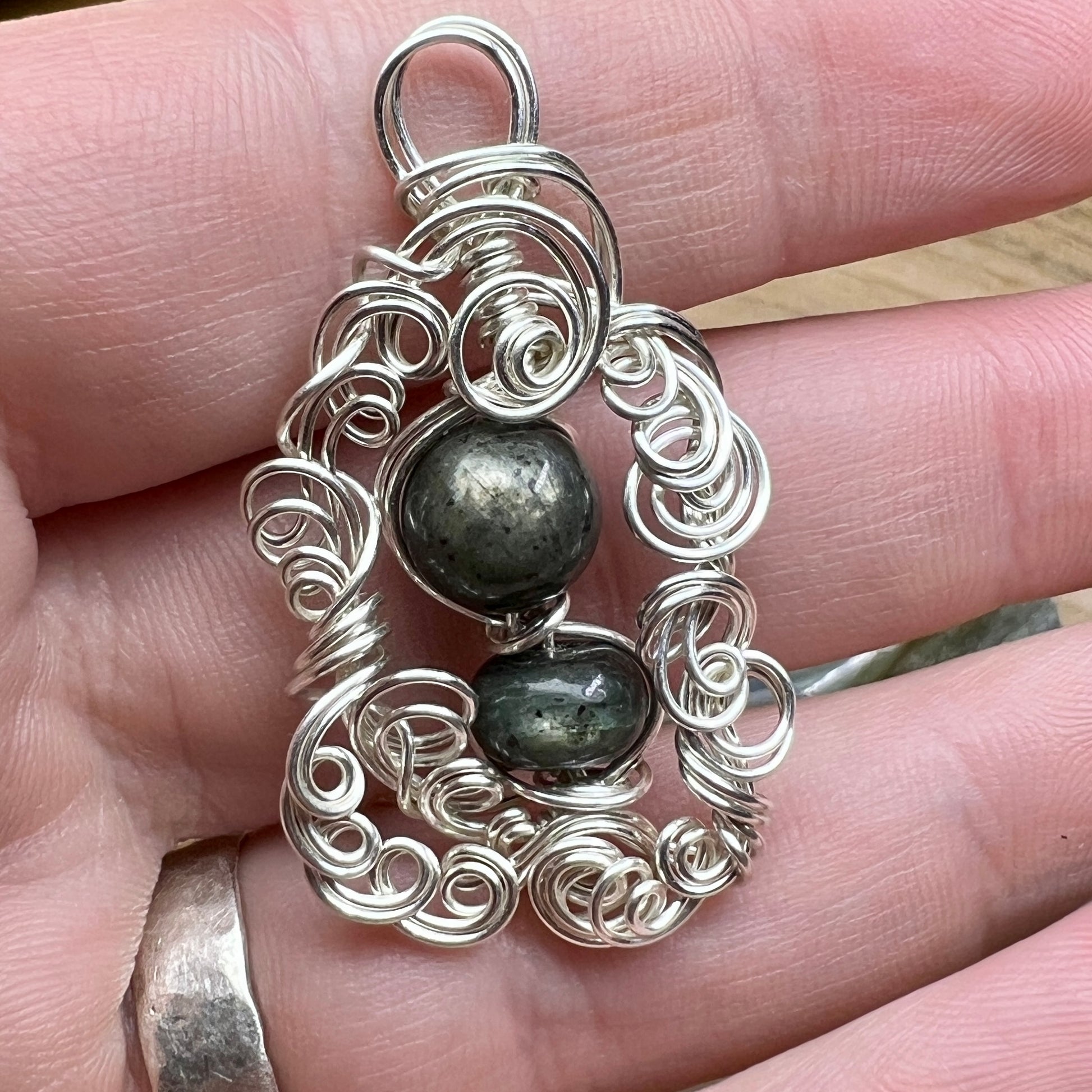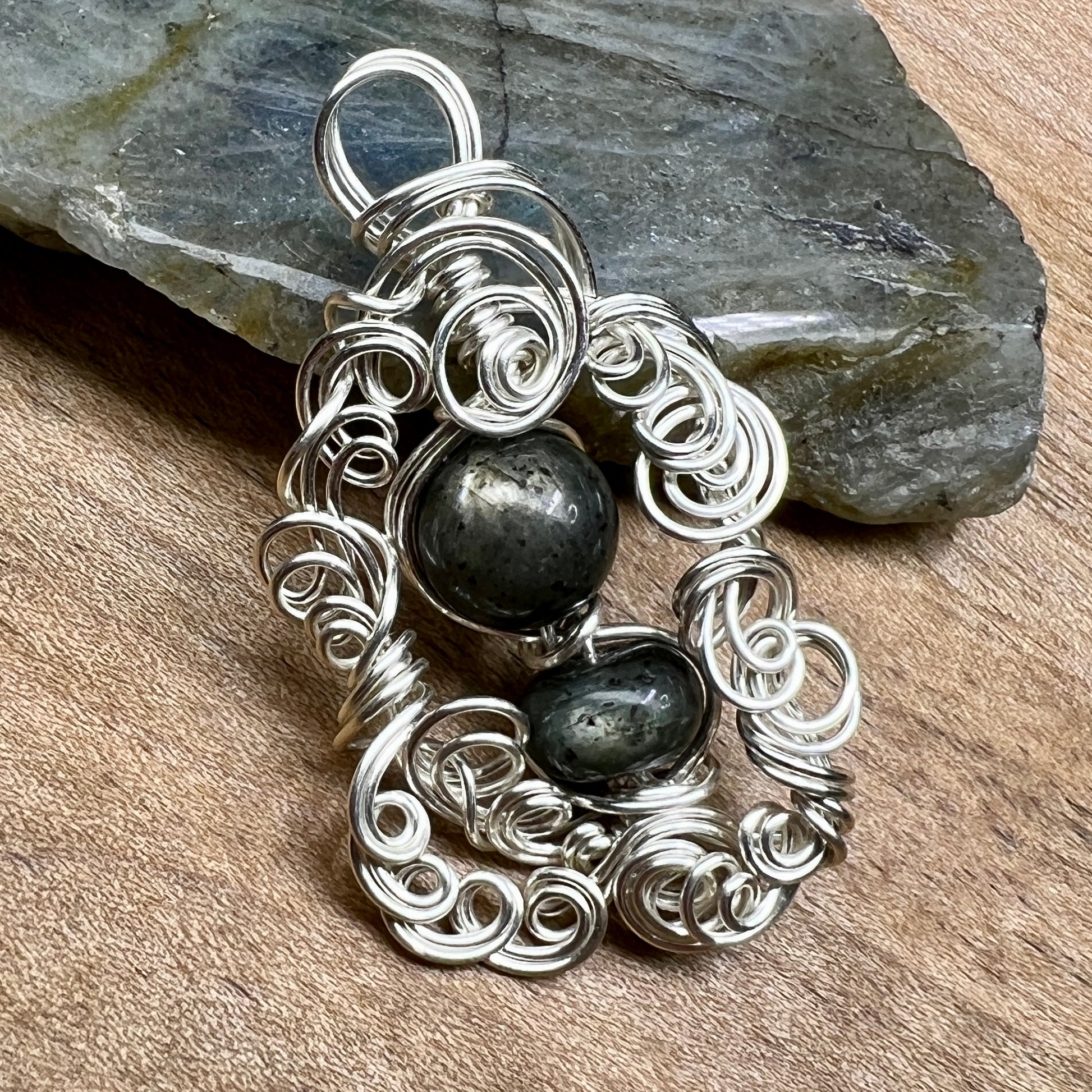 Larvikite with very unusual greenish-gold flash, set in silver wire.