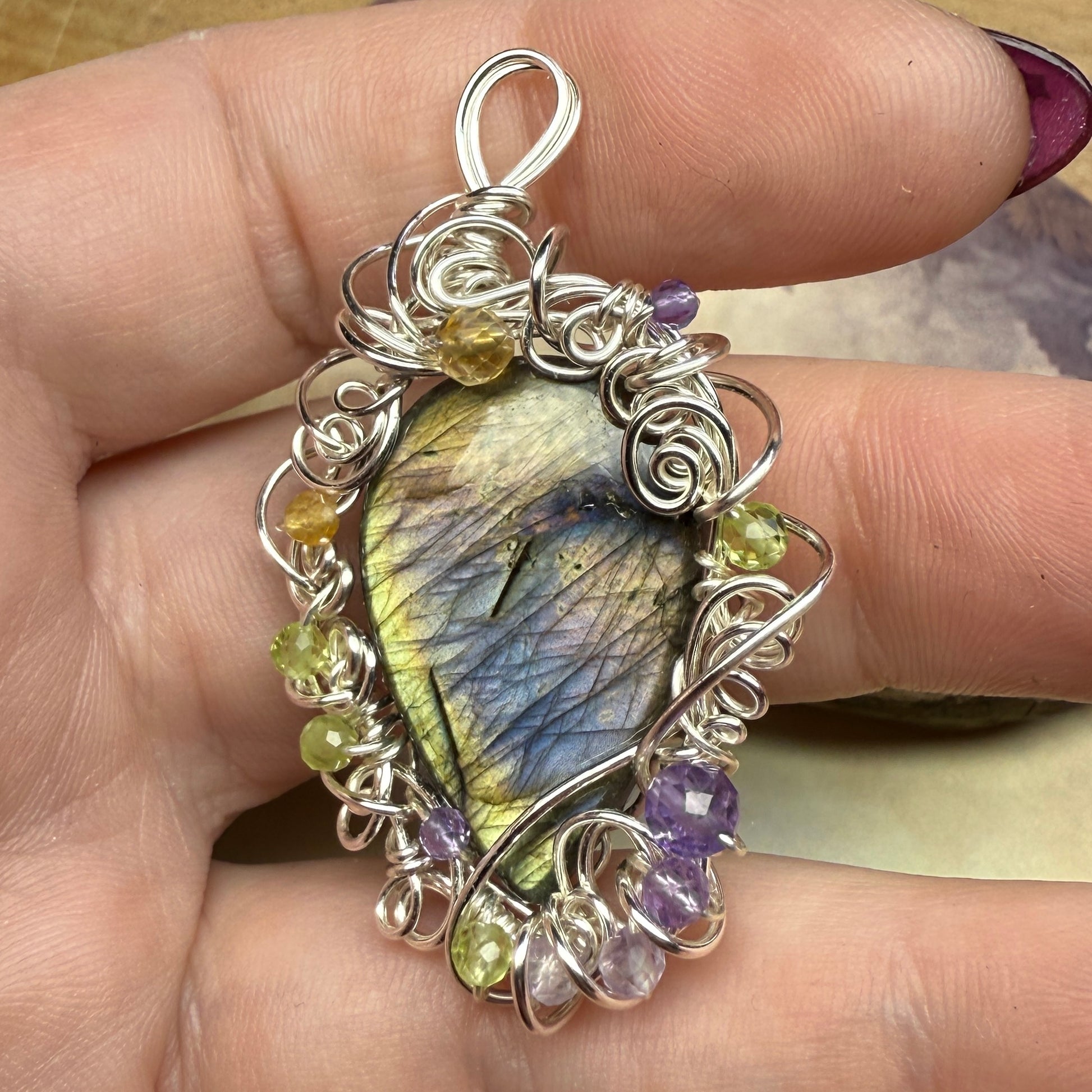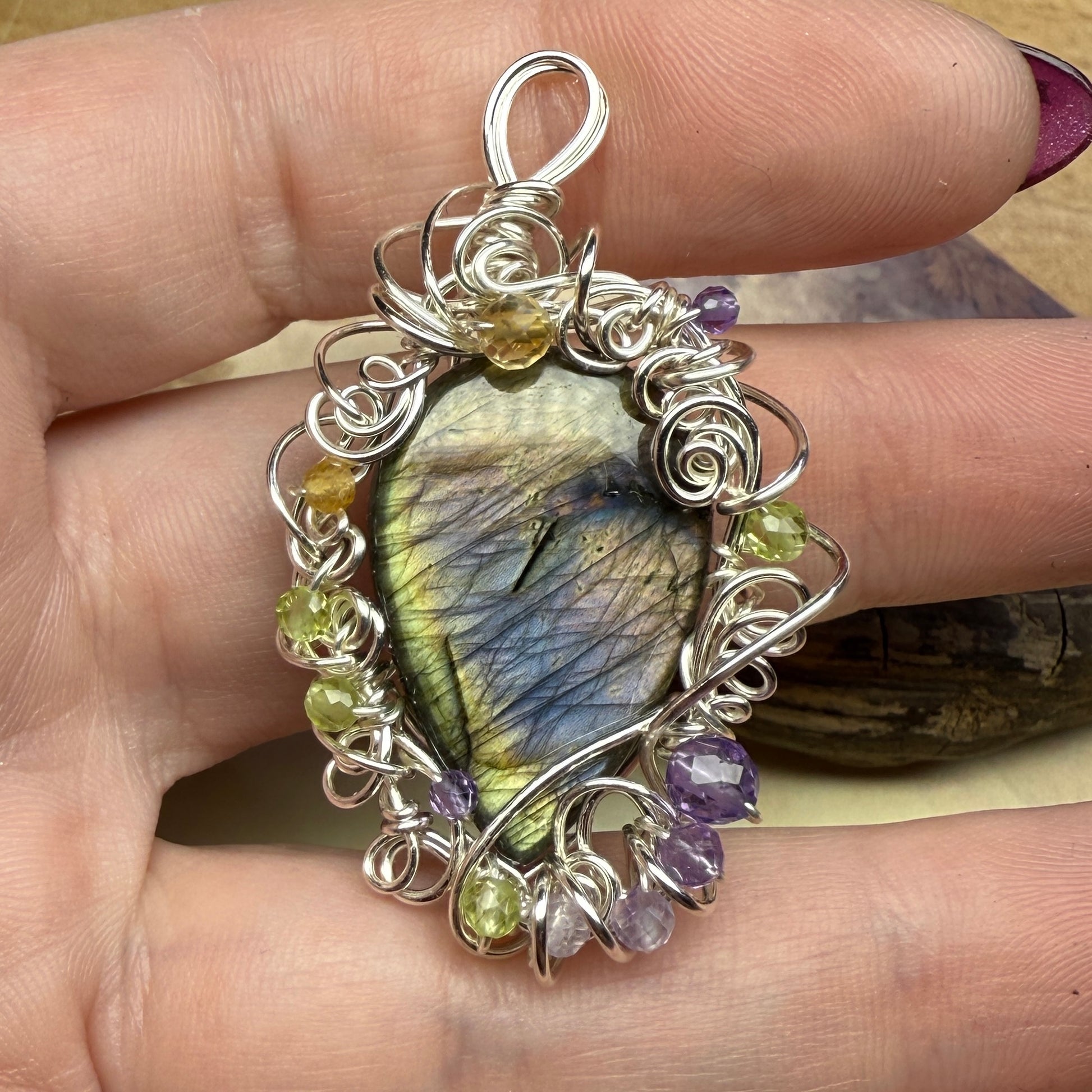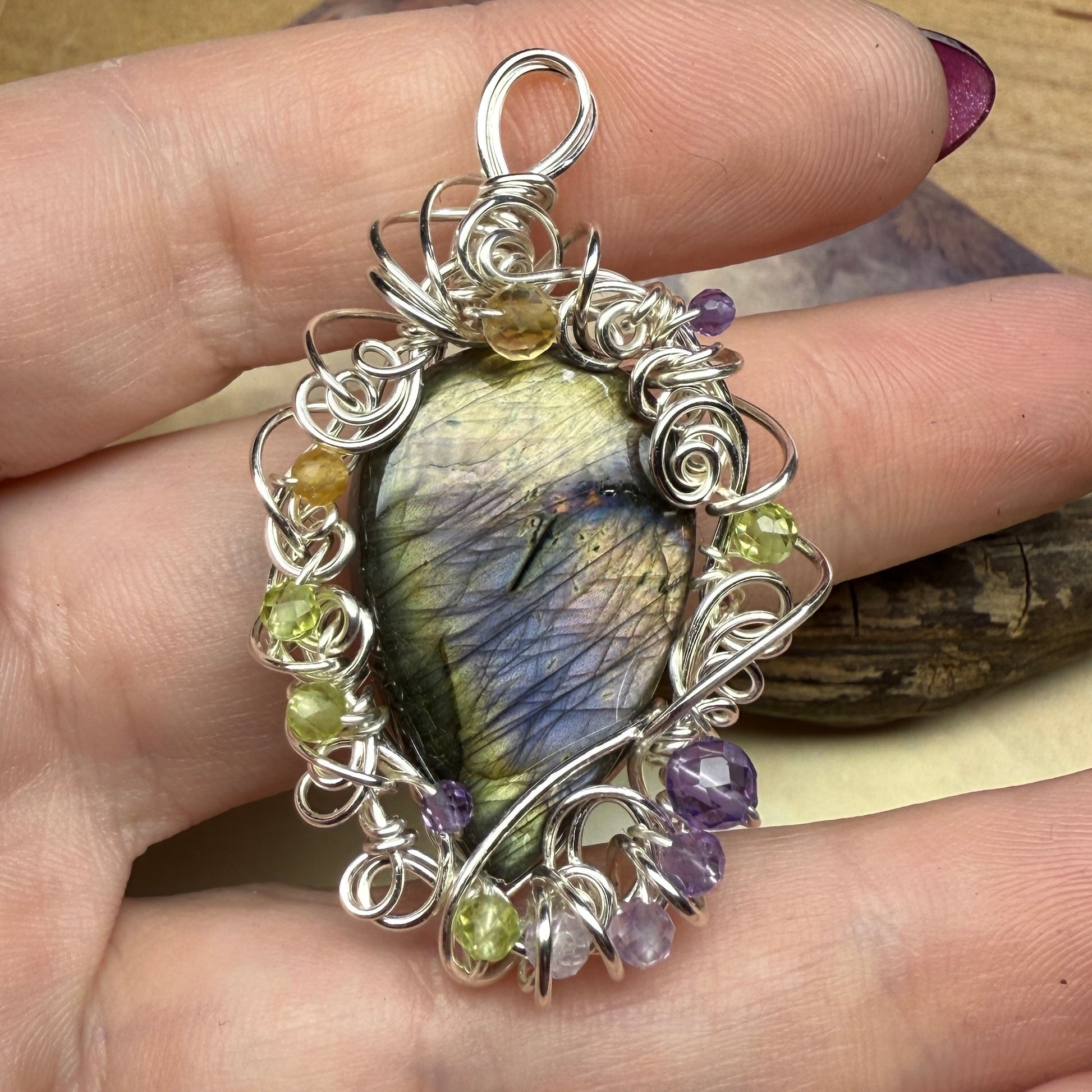 This is an unusual piece of labradorite - you don’t often see pinkish-purple and yellow-green in the same stone. I’ve accented it with amethyst, peridot, citrine, zircon, and purple fluorite. One of a kind.
