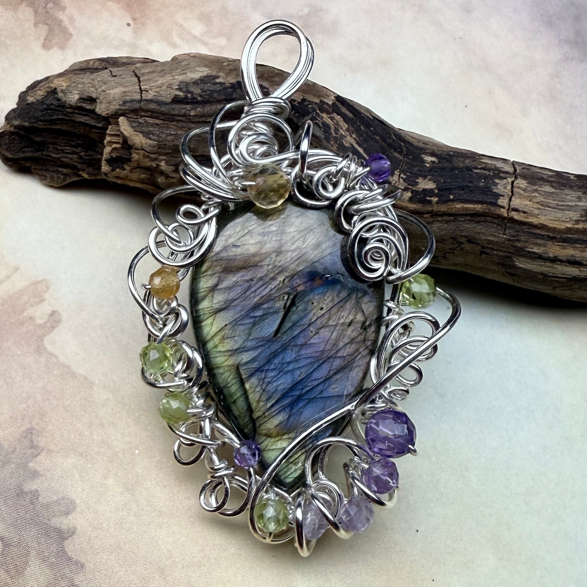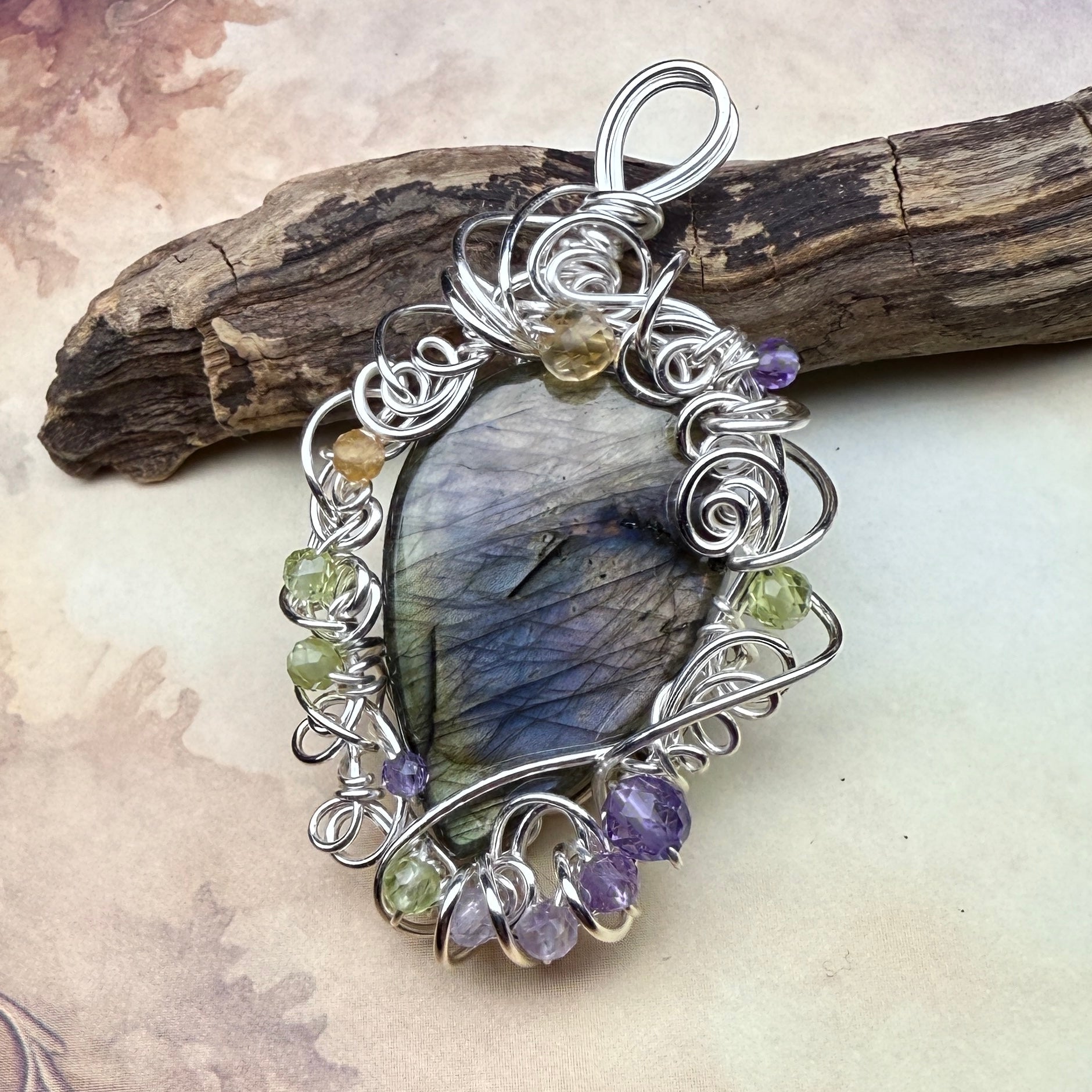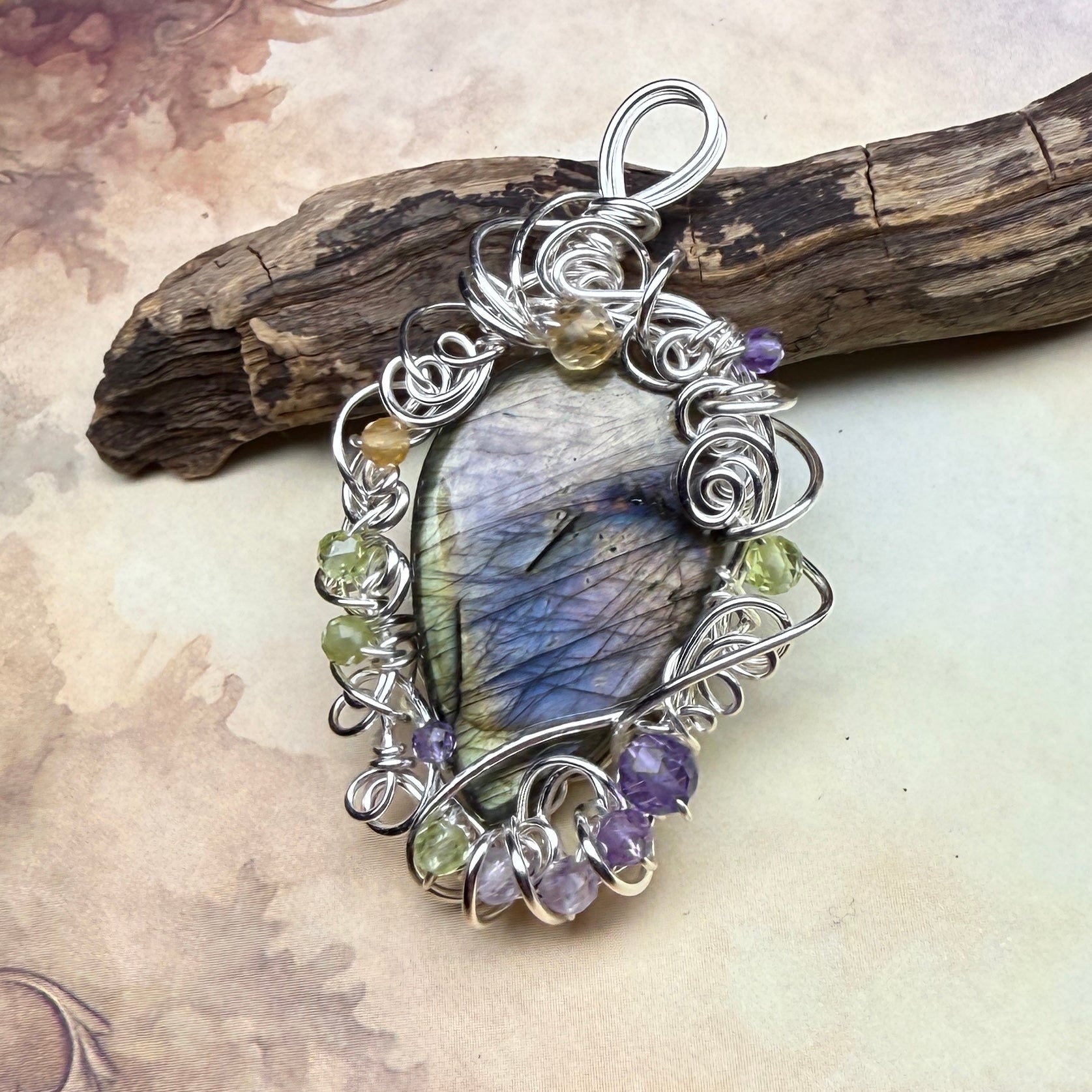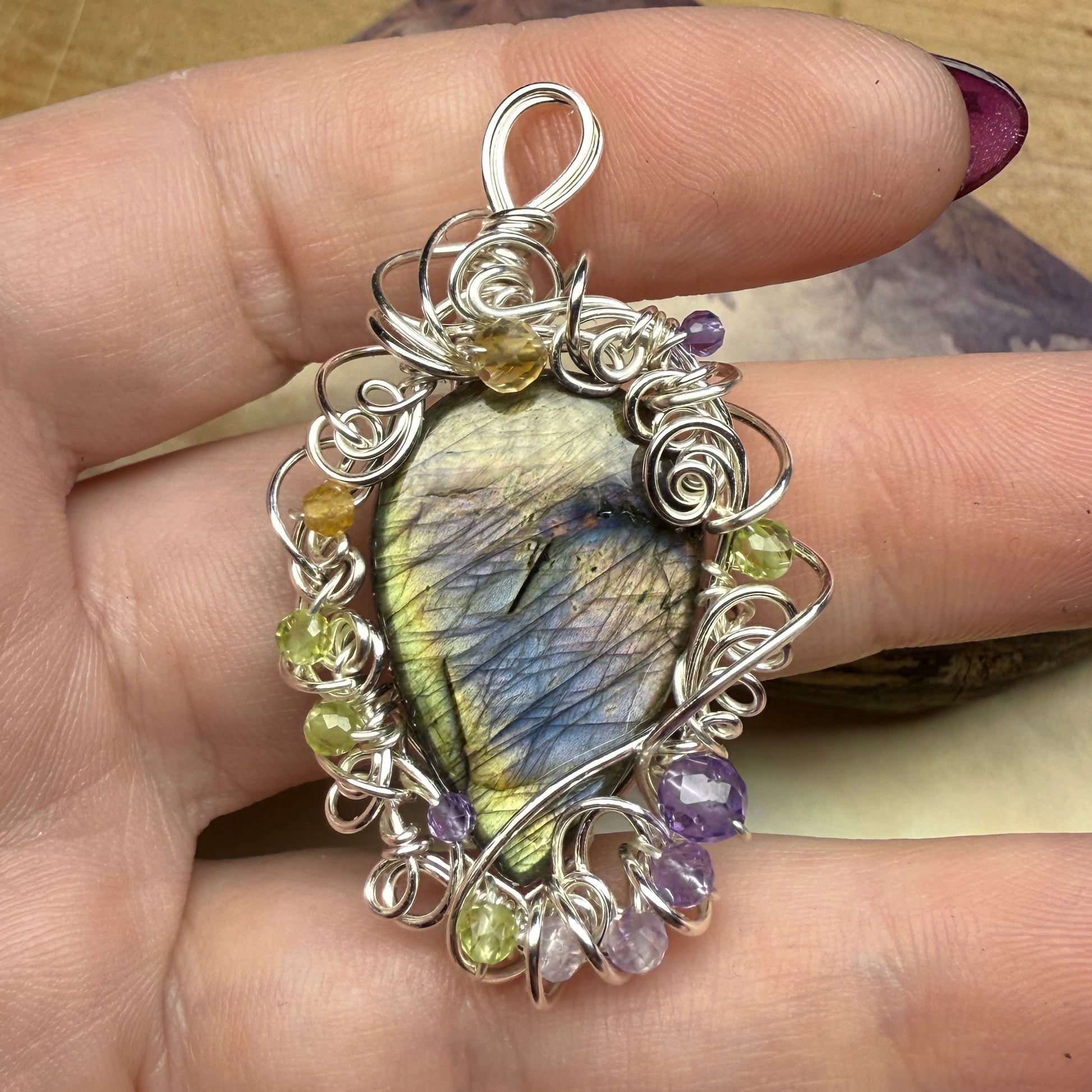 This is an unusual piece of labradorite - you don’t often see pinkish-purple and yellow-green in the same stone. I’ve accented it with amethyst, peridot, citrine, zircon, and purple fluorite. One of a kind.