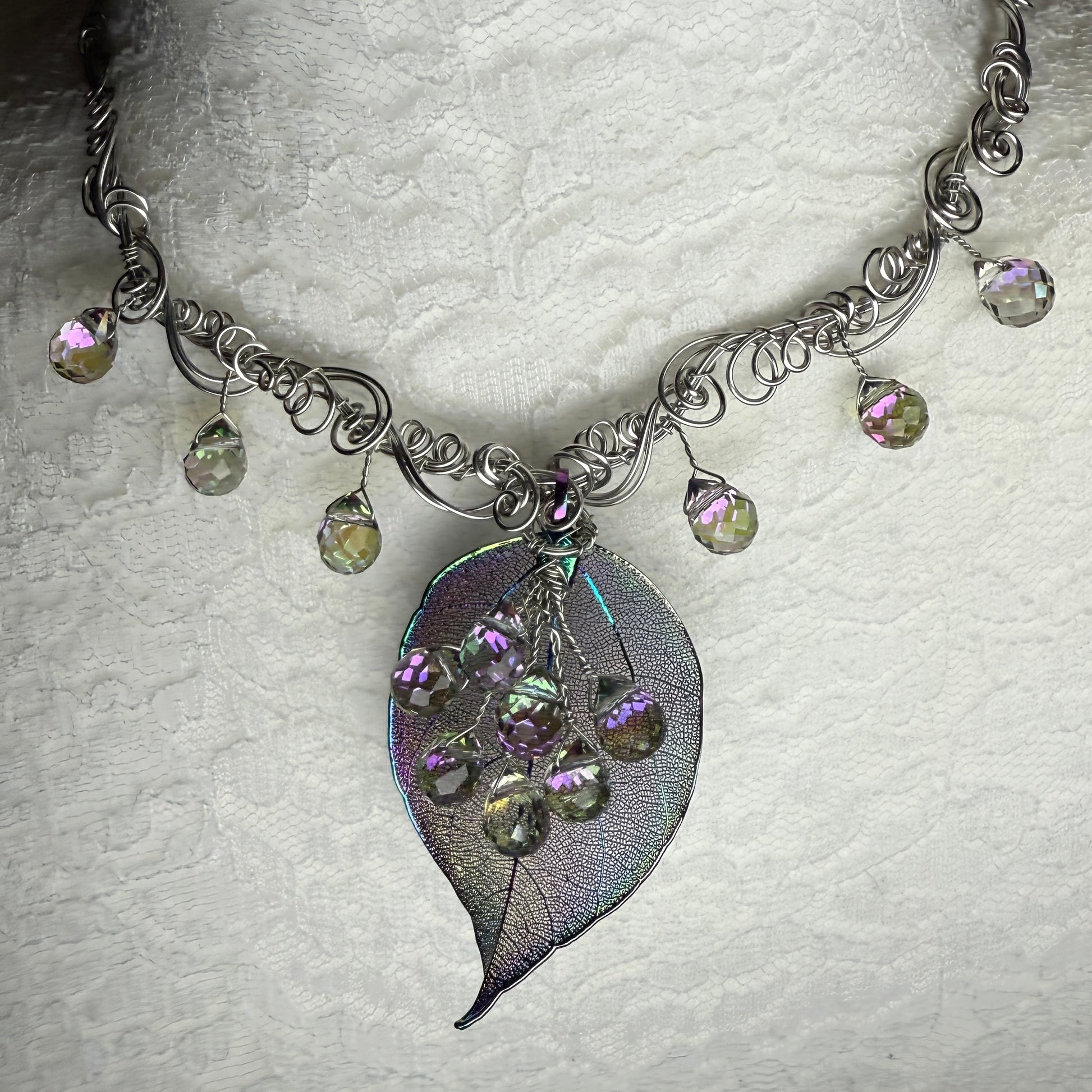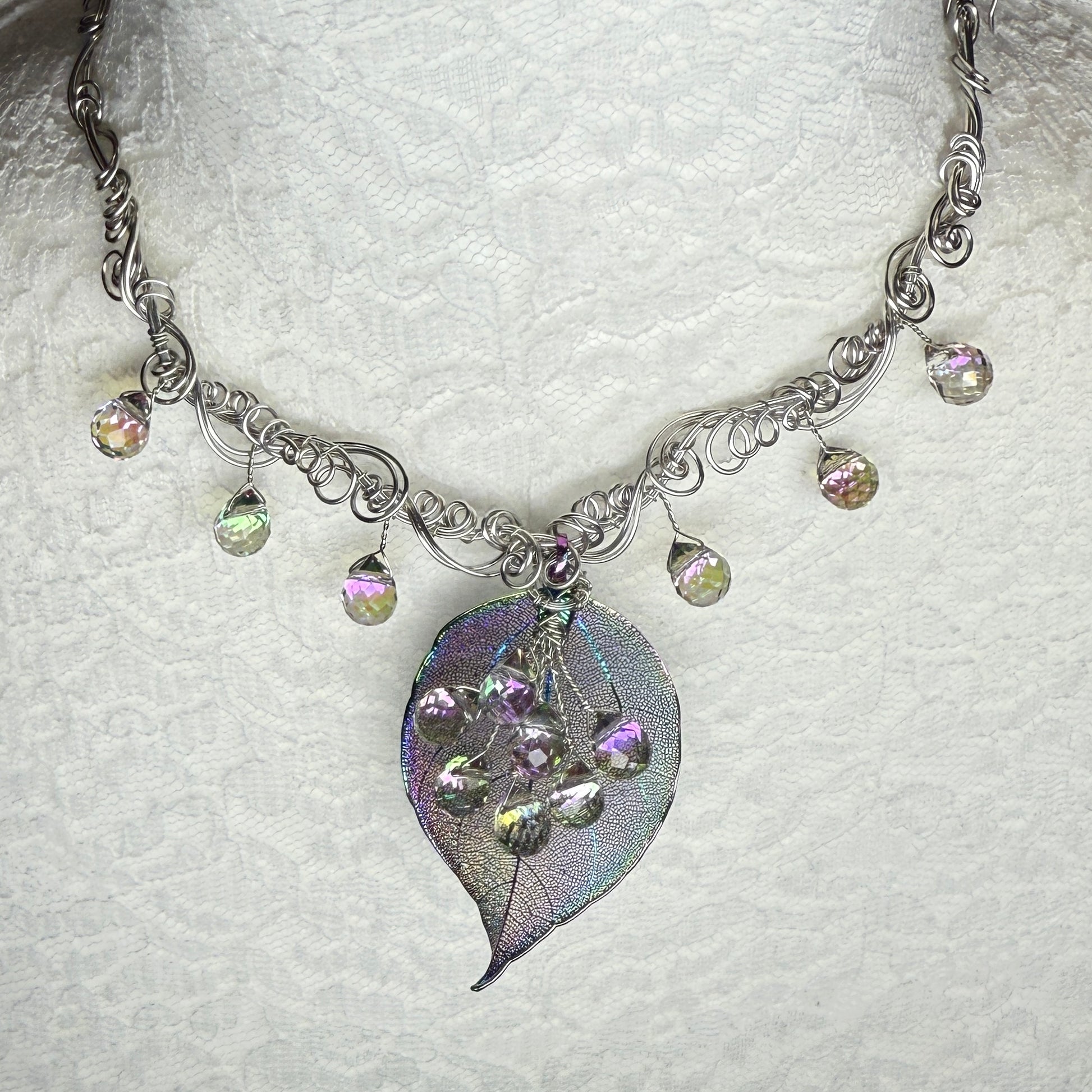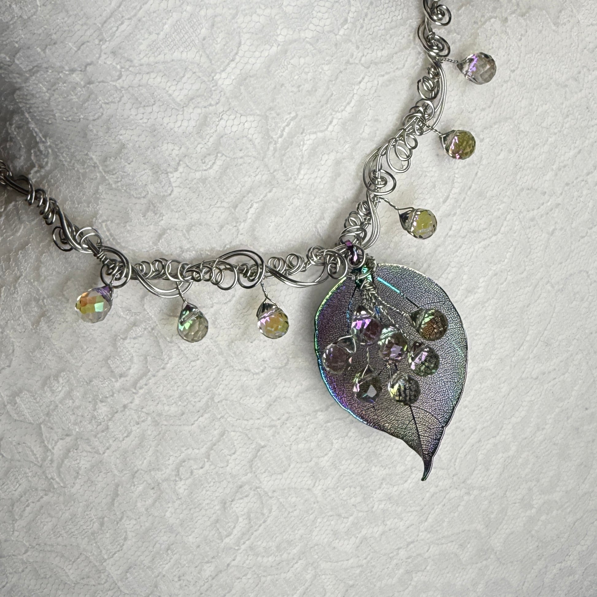 A rainbow electroplated leaf, paired with intensely sparkly firepolished glass briolettes and swirling antiqued silver wire. One of a kind.