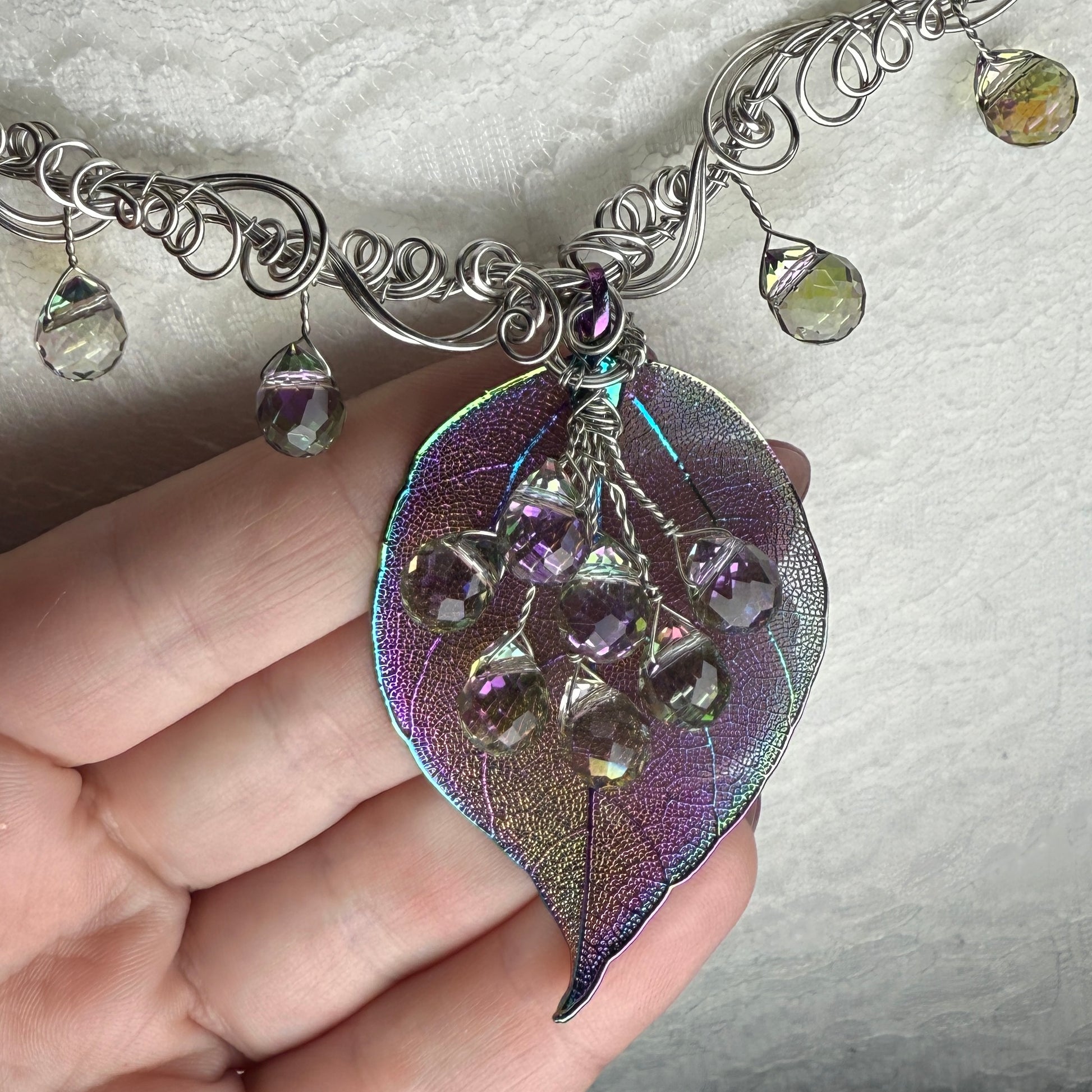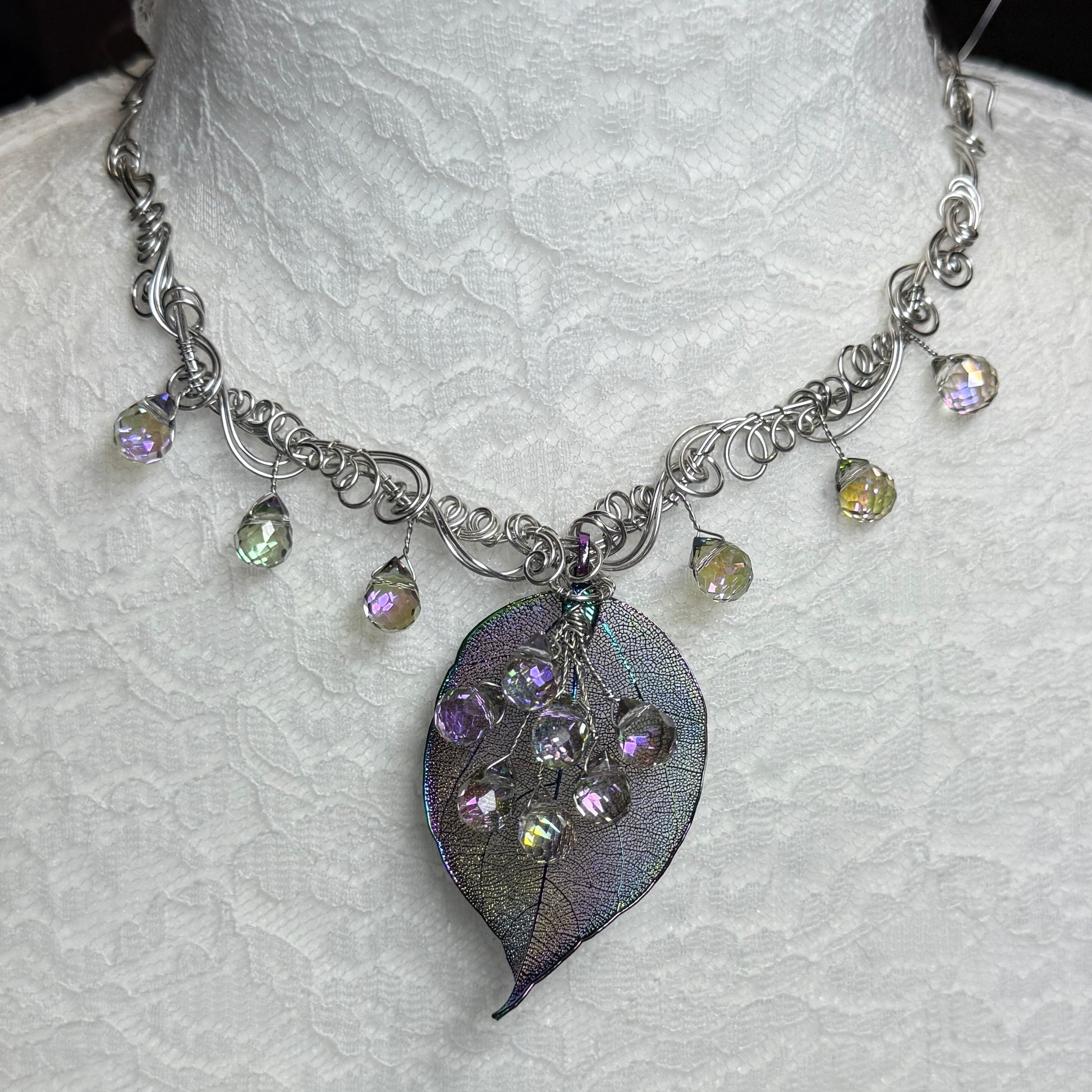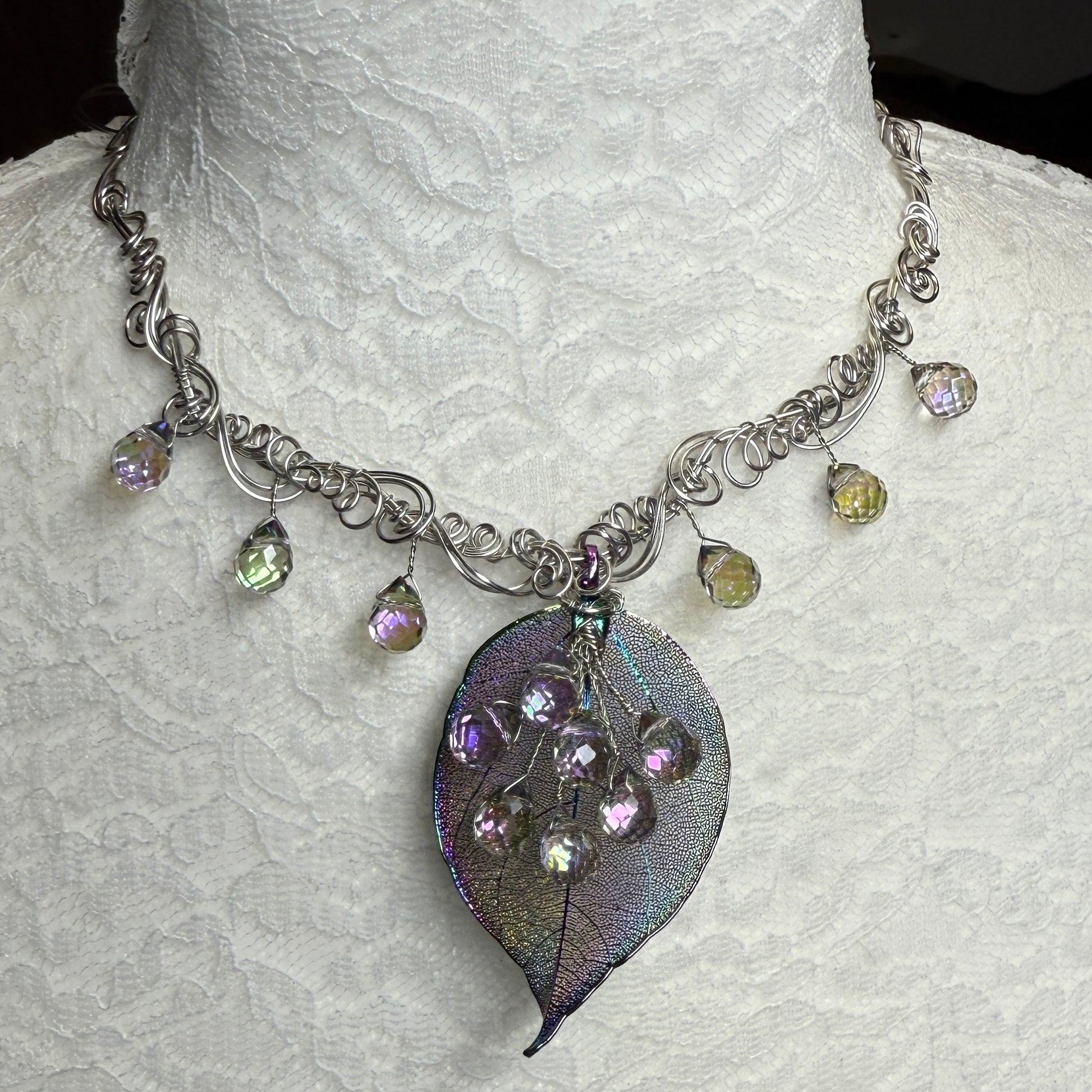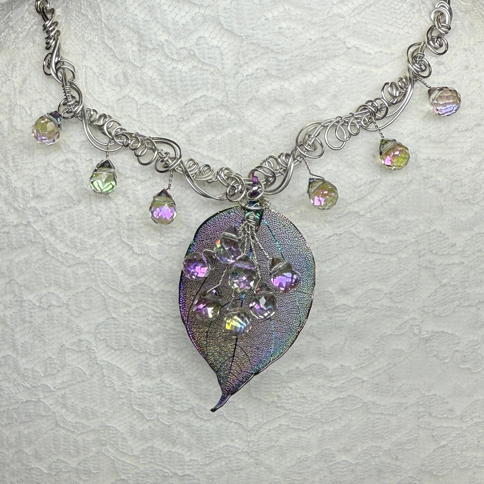 A rainbow electroplated leaf, paired with intensely sparkly firepolished glass briolettes and swirling antiqued silver wire. One of a kind.