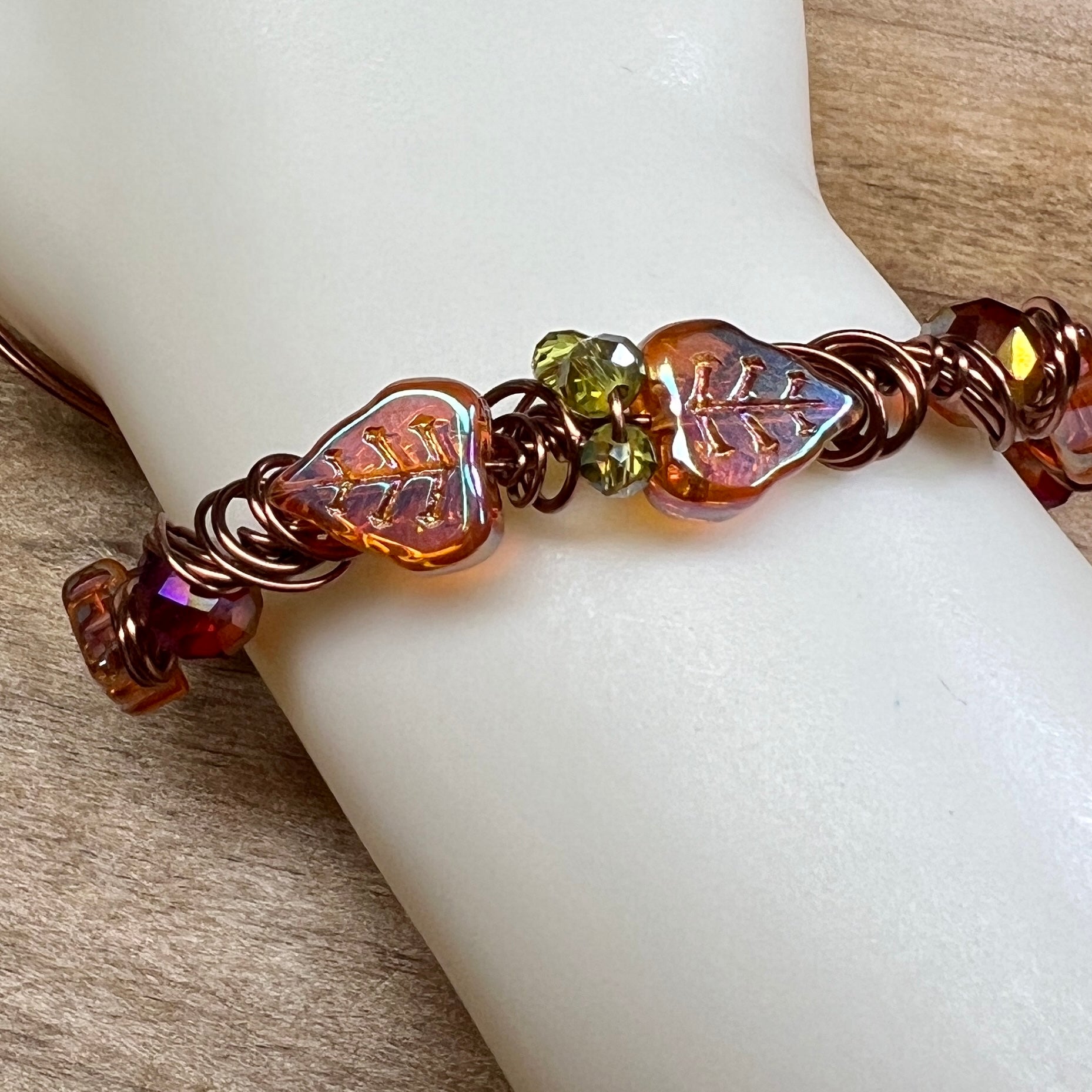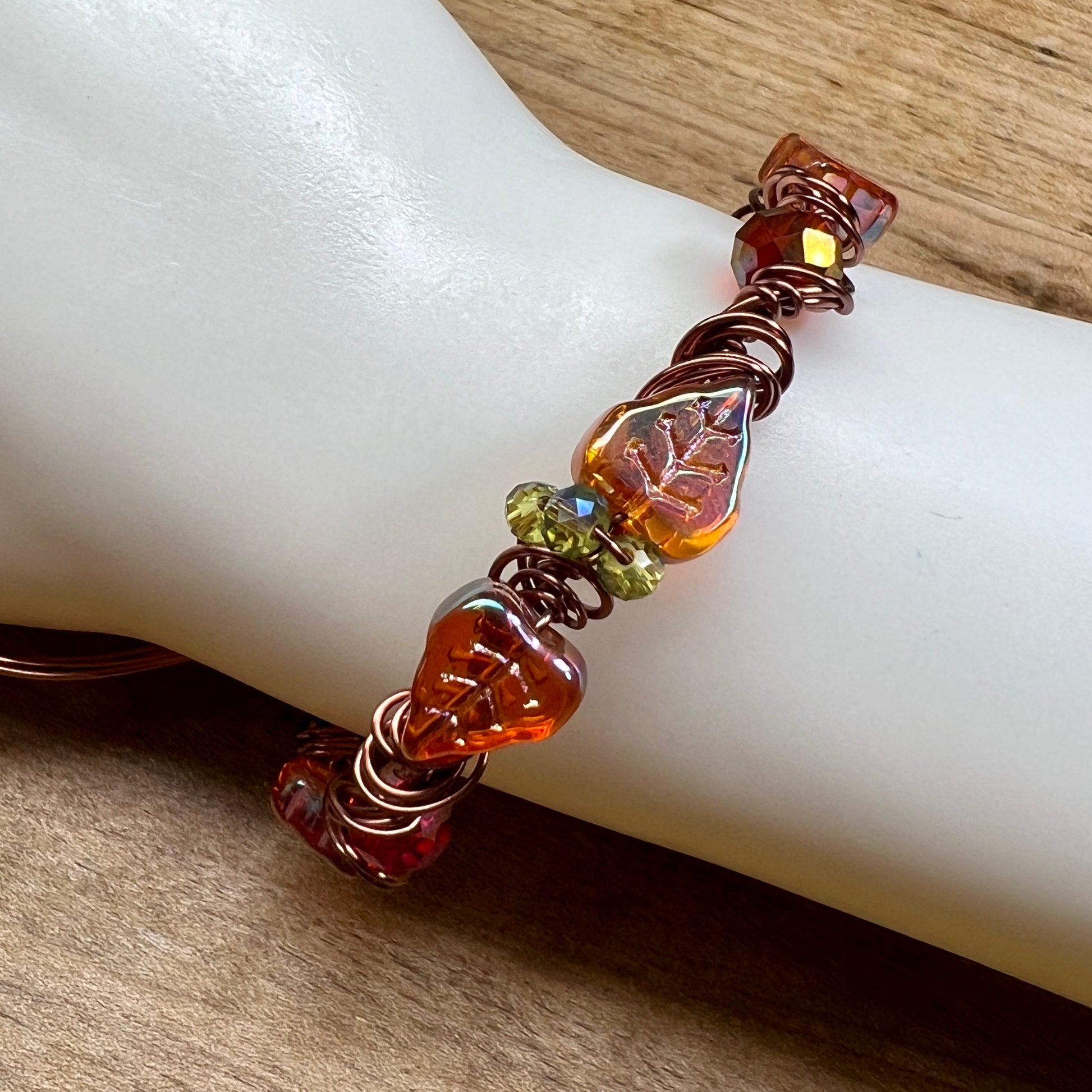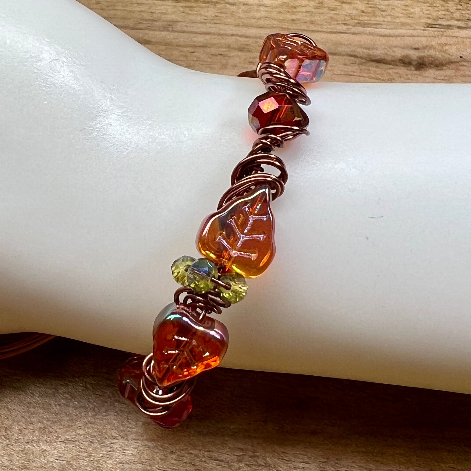Glowing red-orange leaf beads with shimmering red and green firepolished glass on antiqued copper wire.