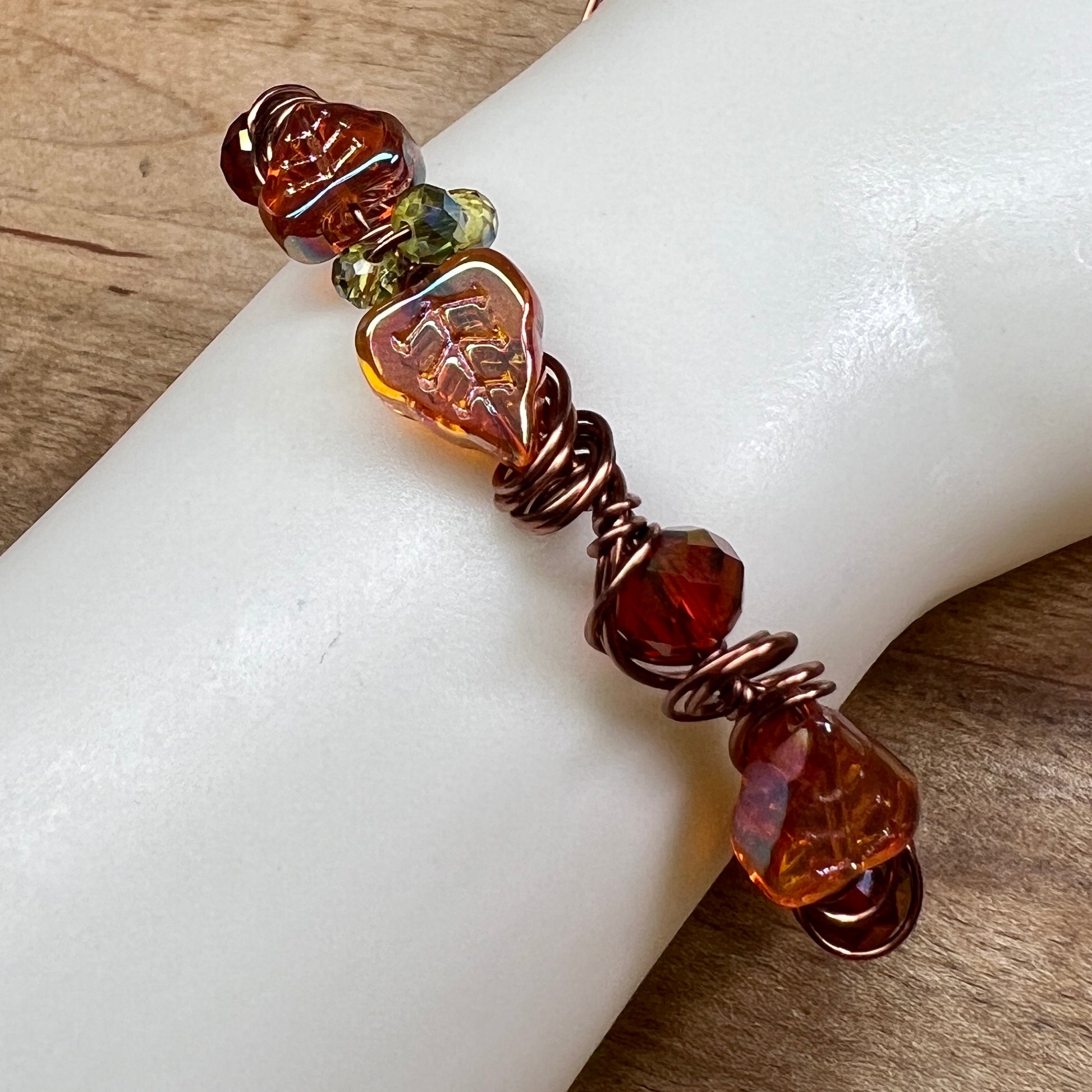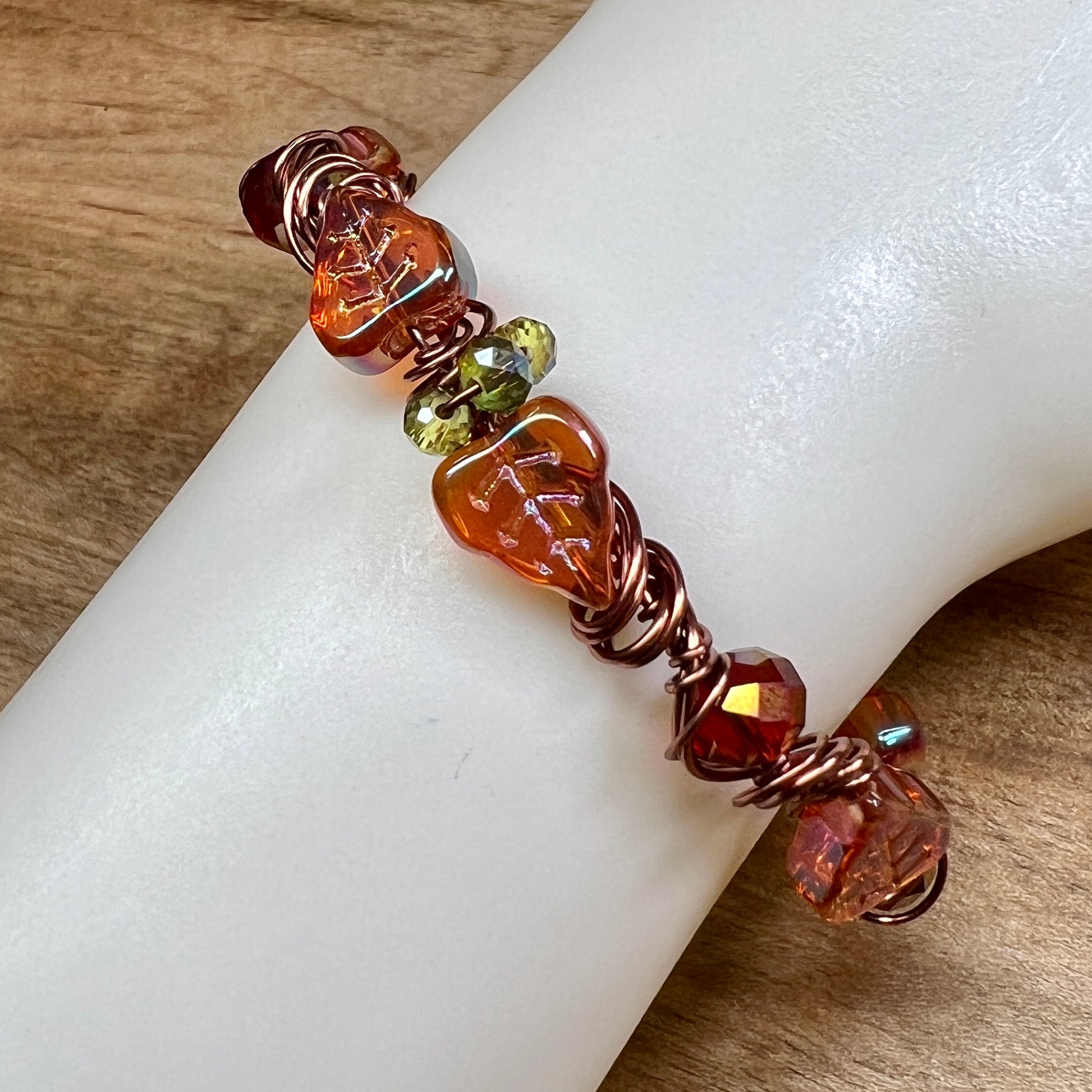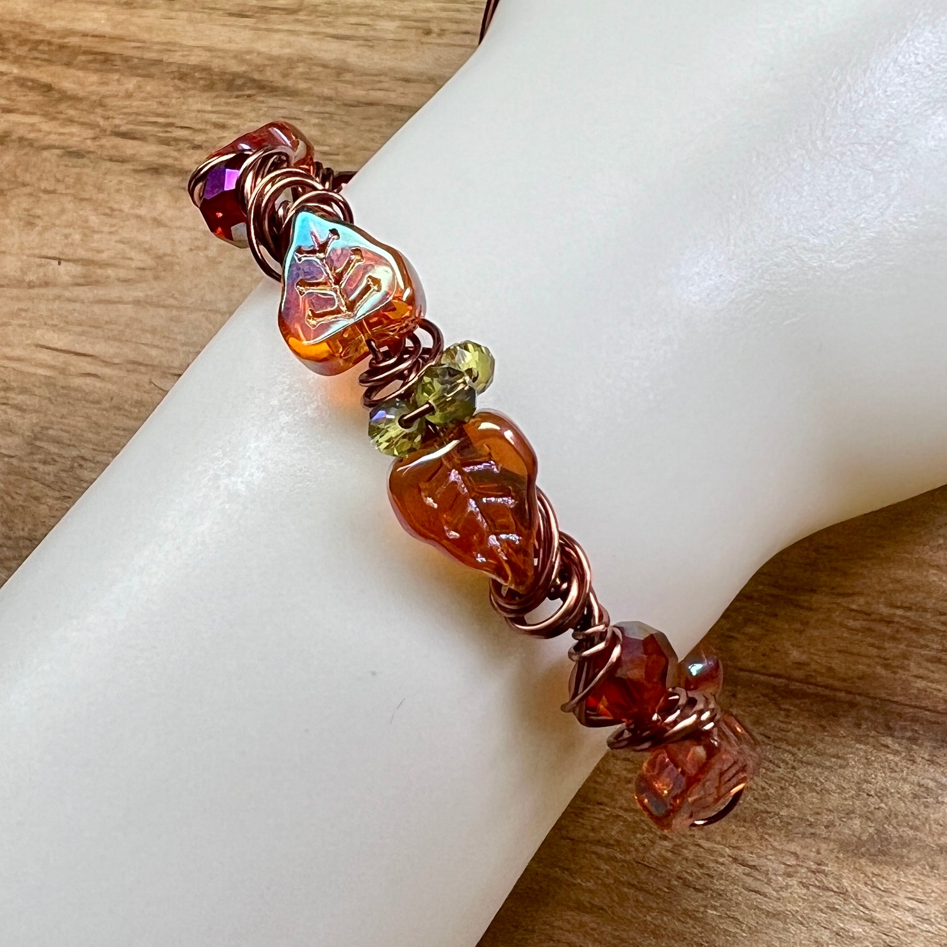 Glowing red-orange leaf beads with shimmering red and green firepolished glass on antiqued copper wire.